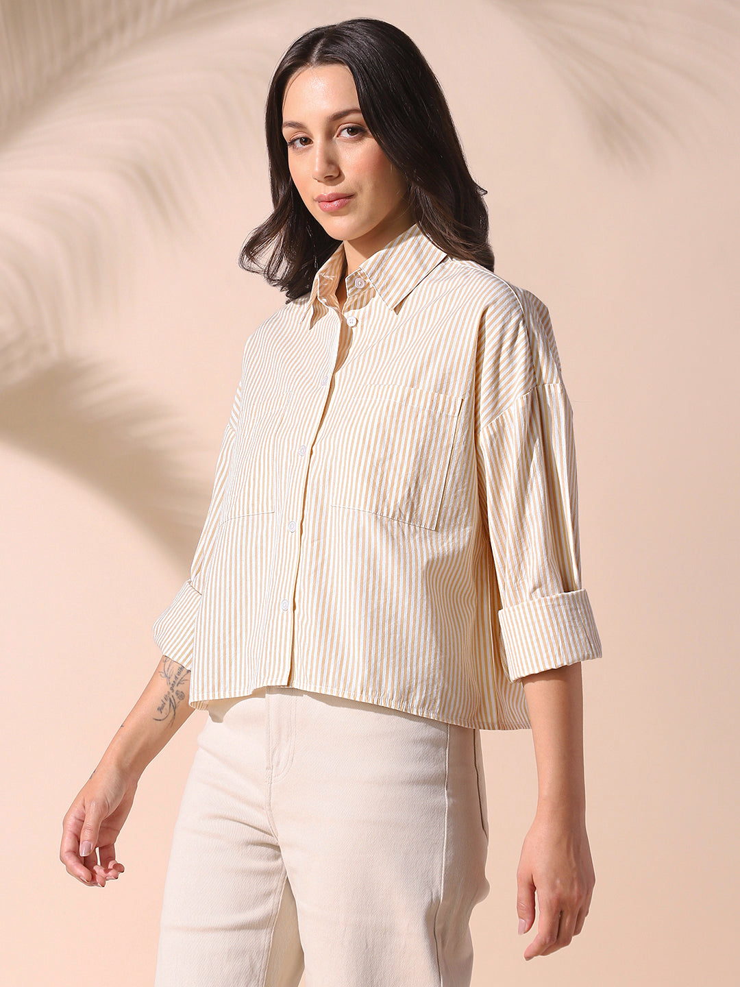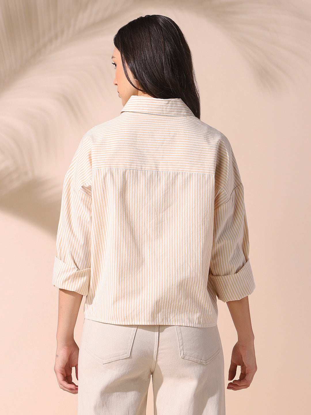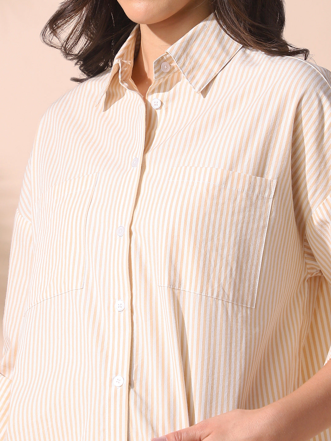 DL Woman Yellow Striped Spread Collar Drop Shoulder Relaxed Cotton Shirt