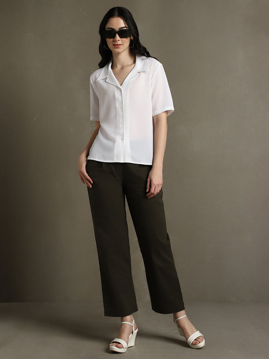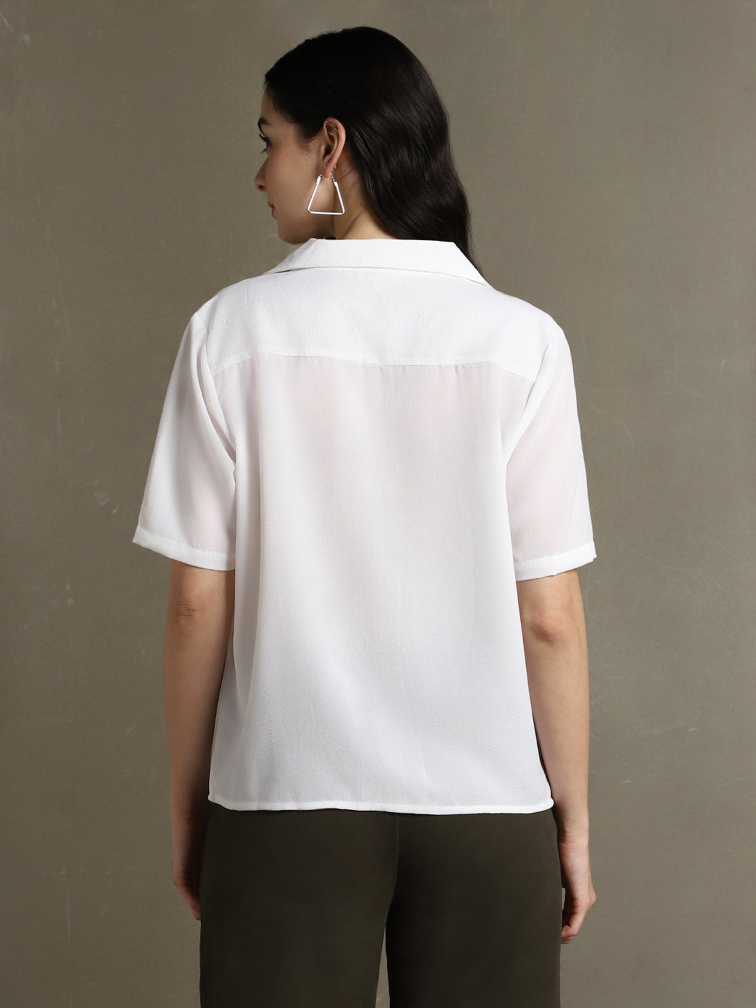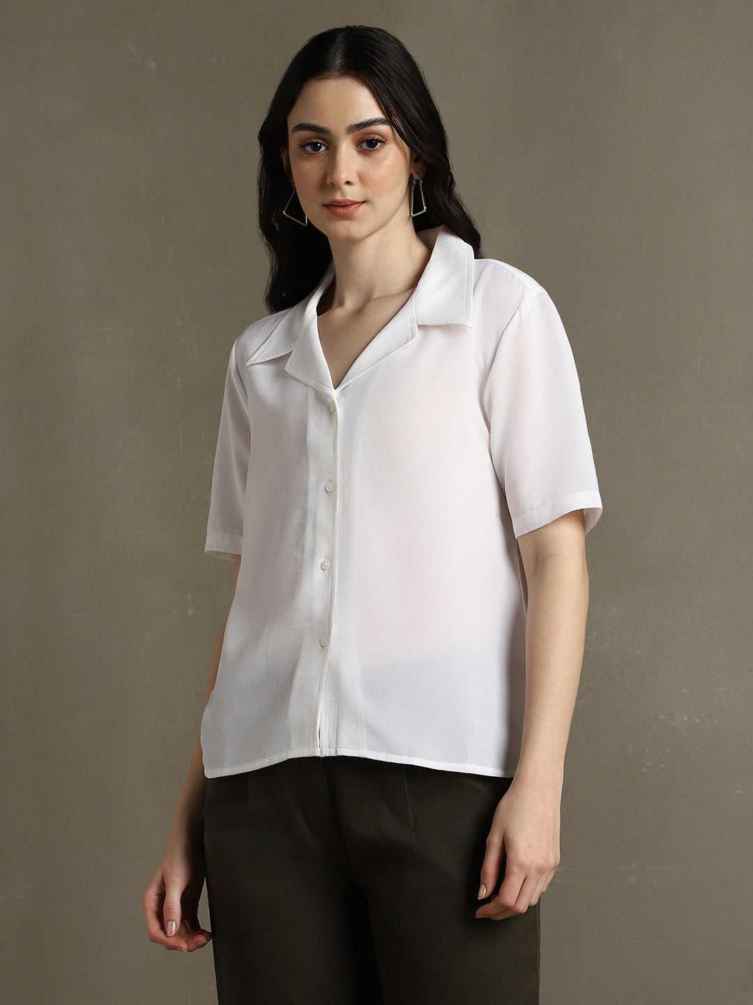 DL Woman White Solid Lapel Collar Half Sleeves Shirt