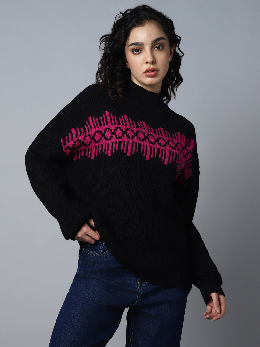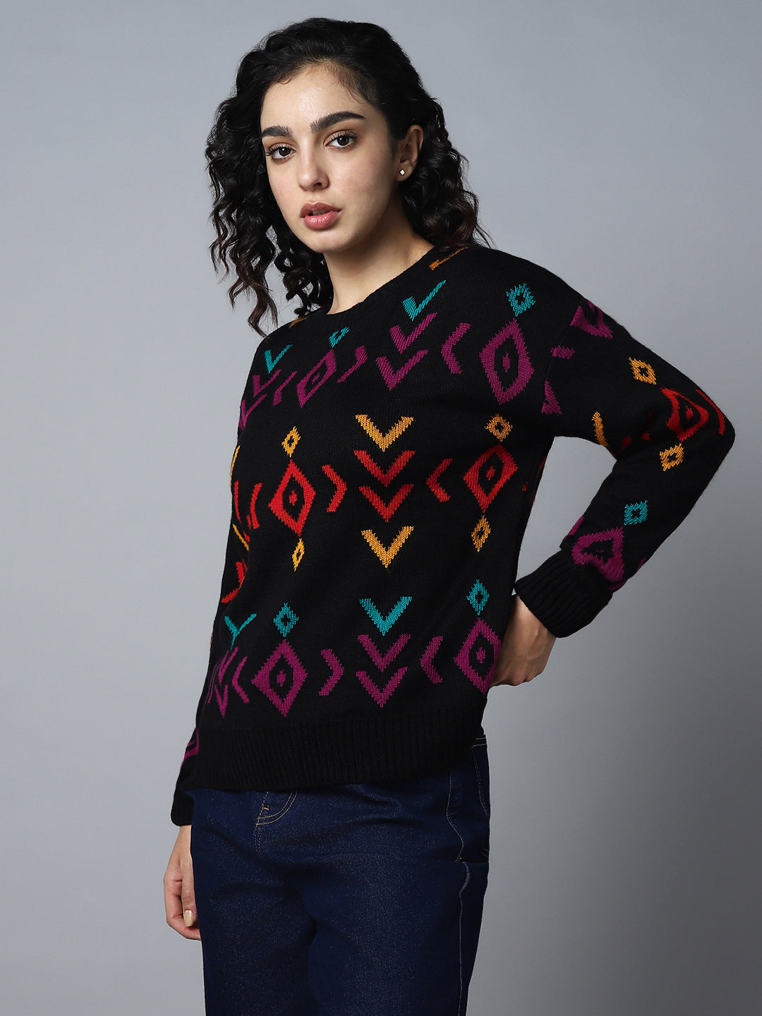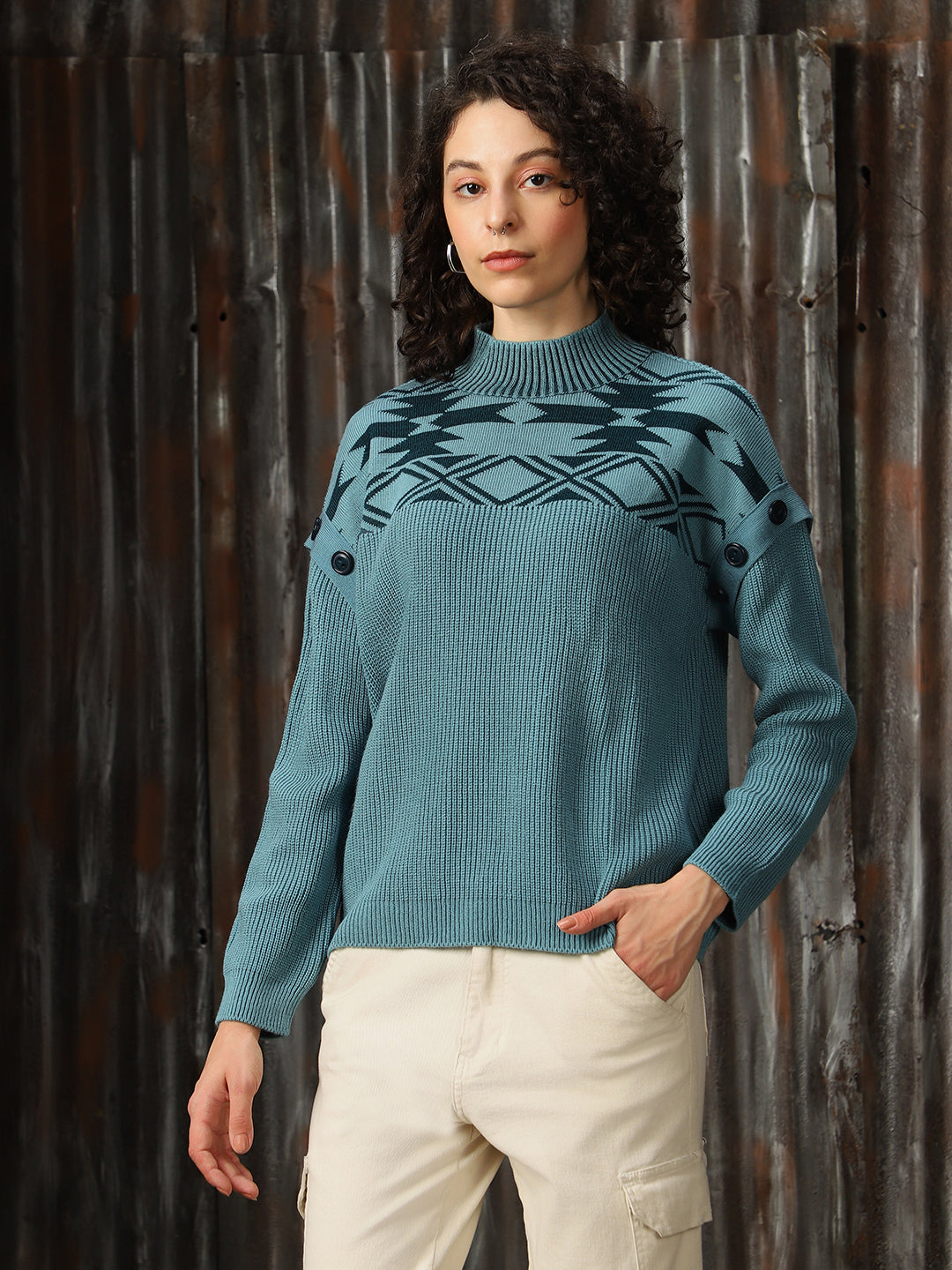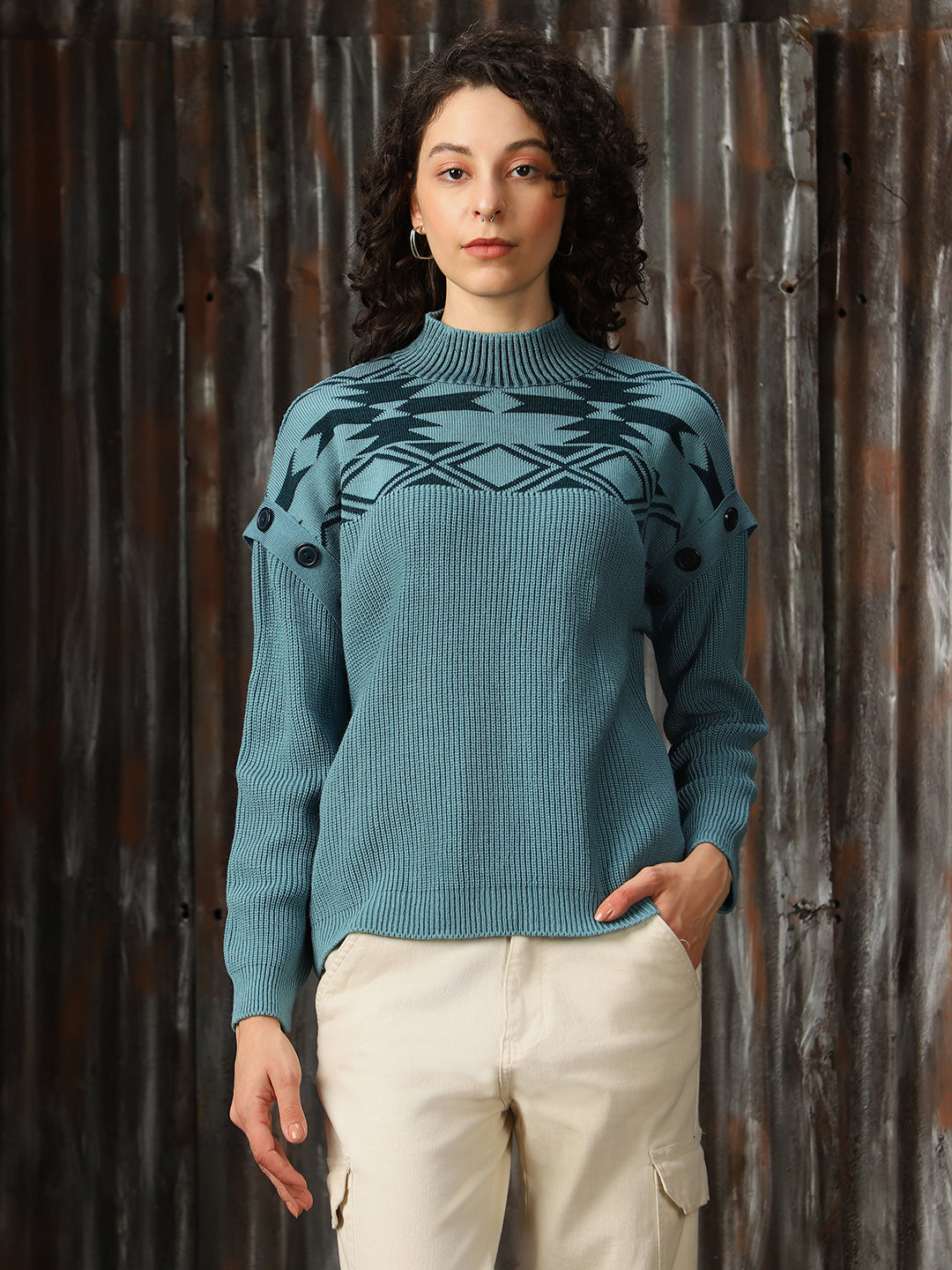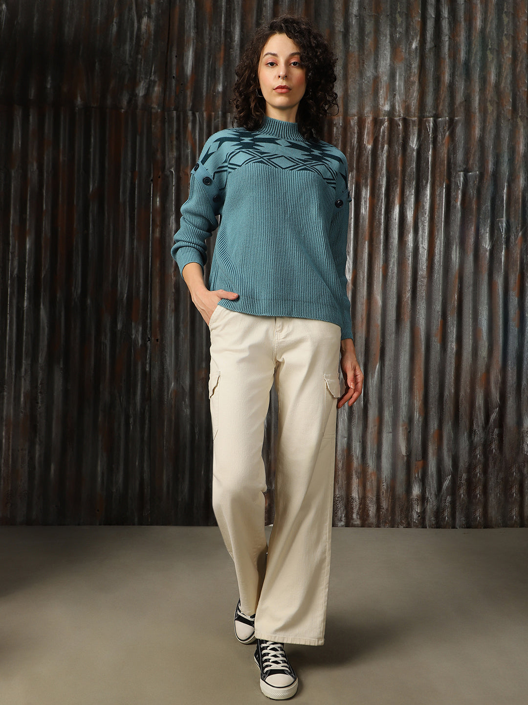 Women Geometric Printed Mock Collar Long Sleeve Acrylic Pullover Sweaters