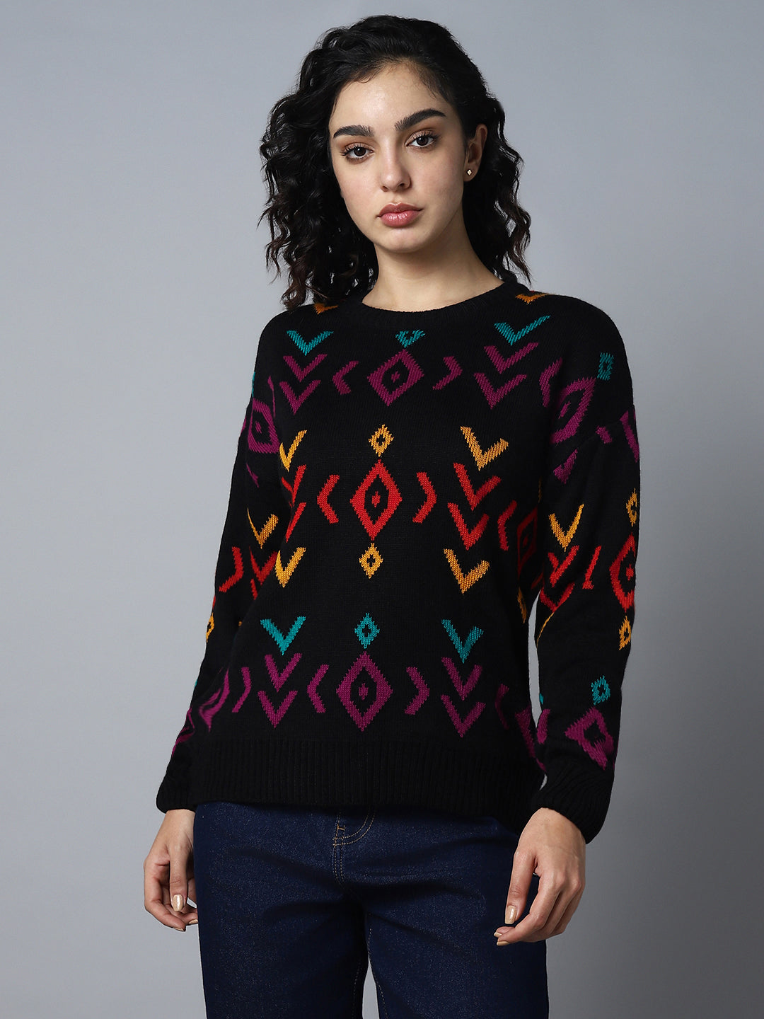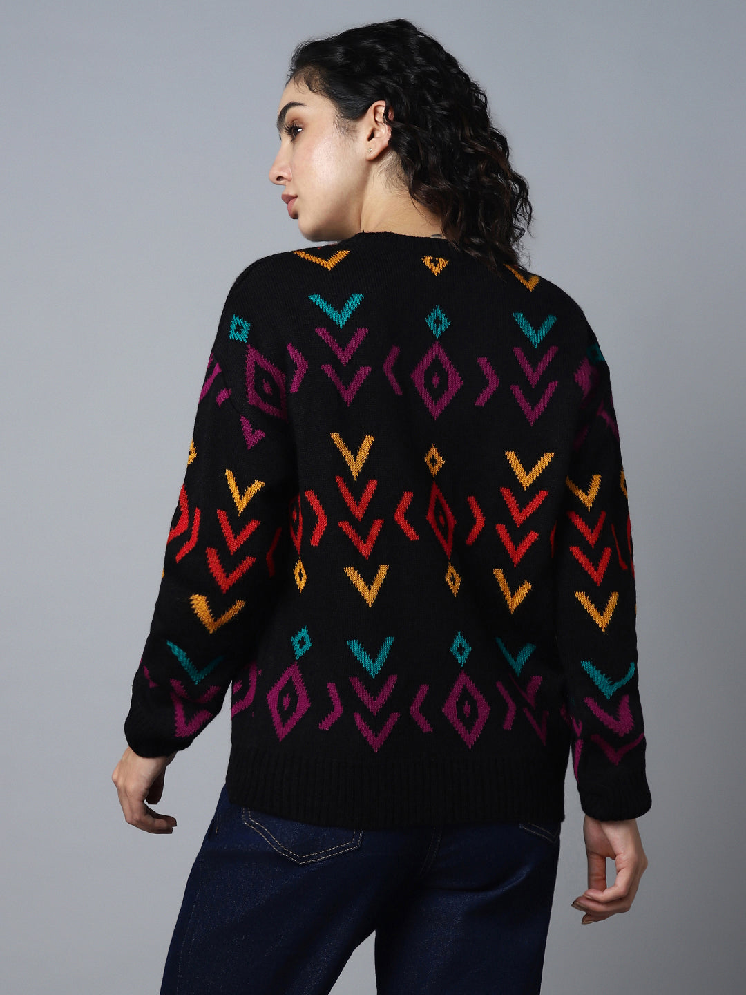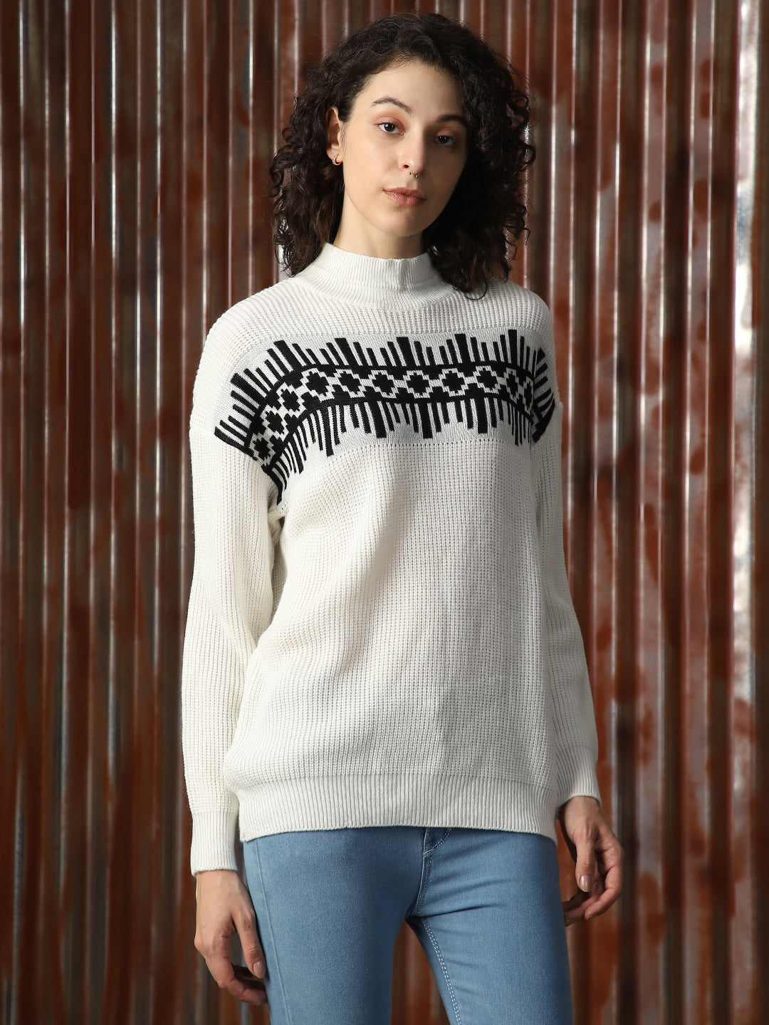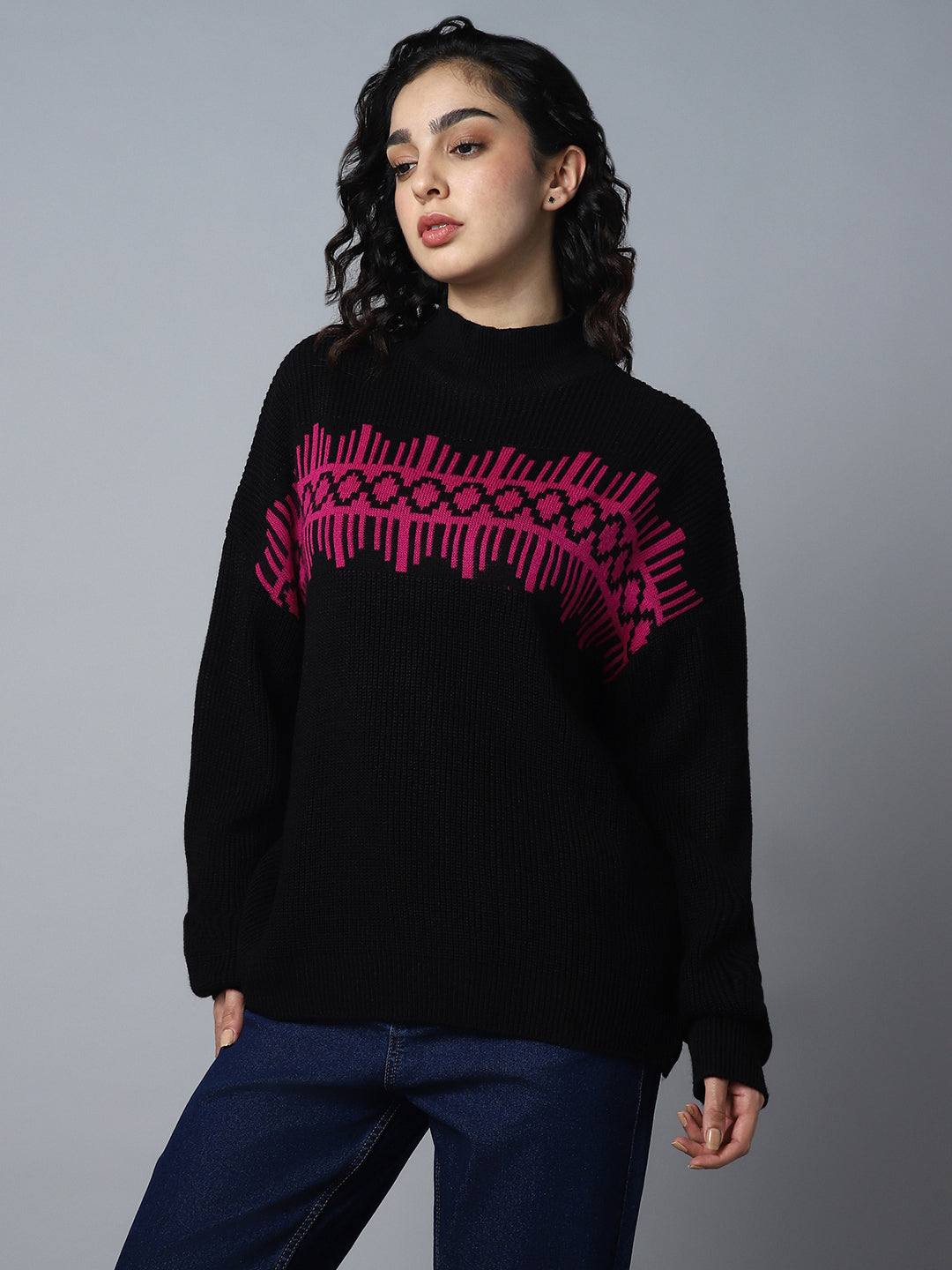 Women Geometric Printed Mock Collar Long Sleeve Acrylic Pullover Sweaters