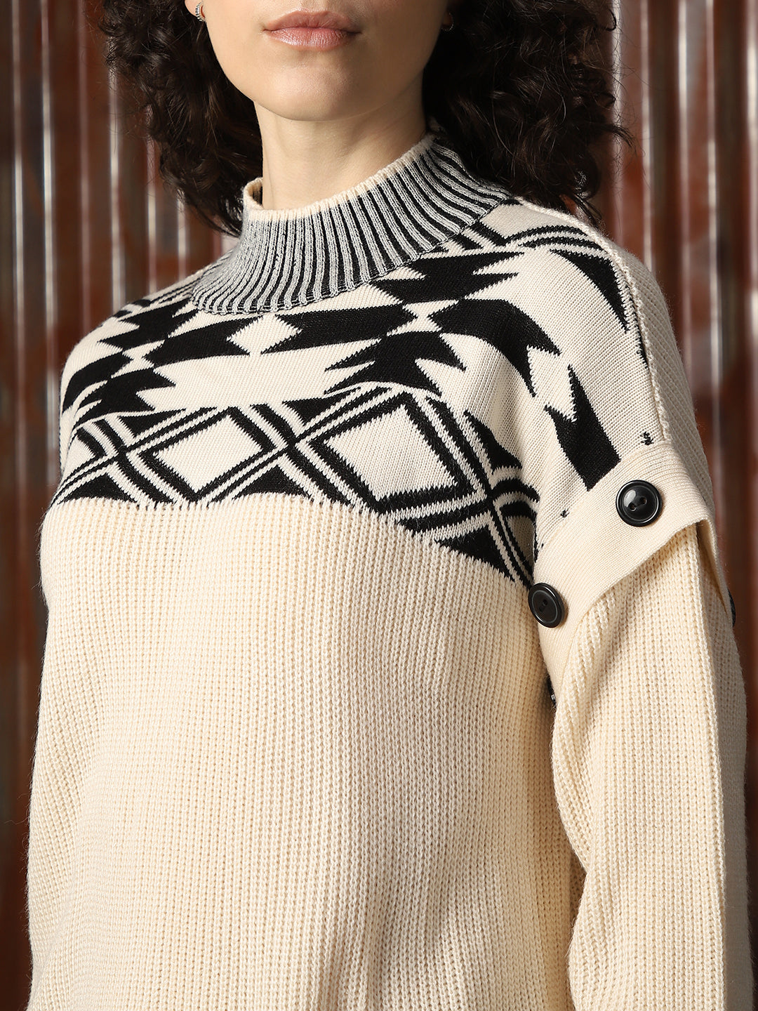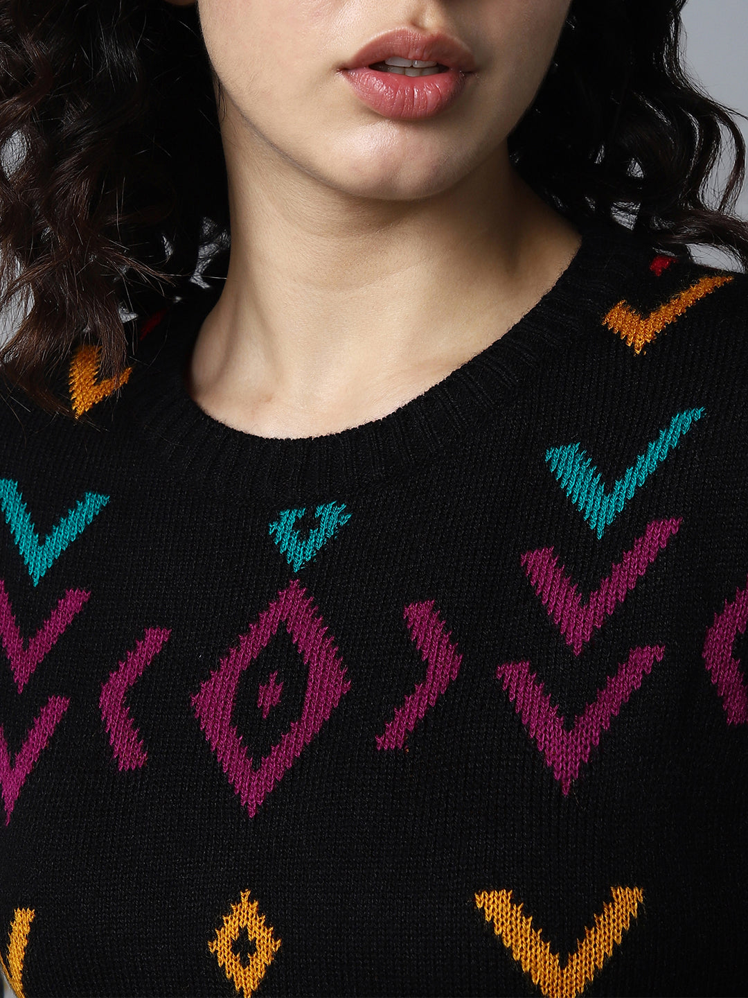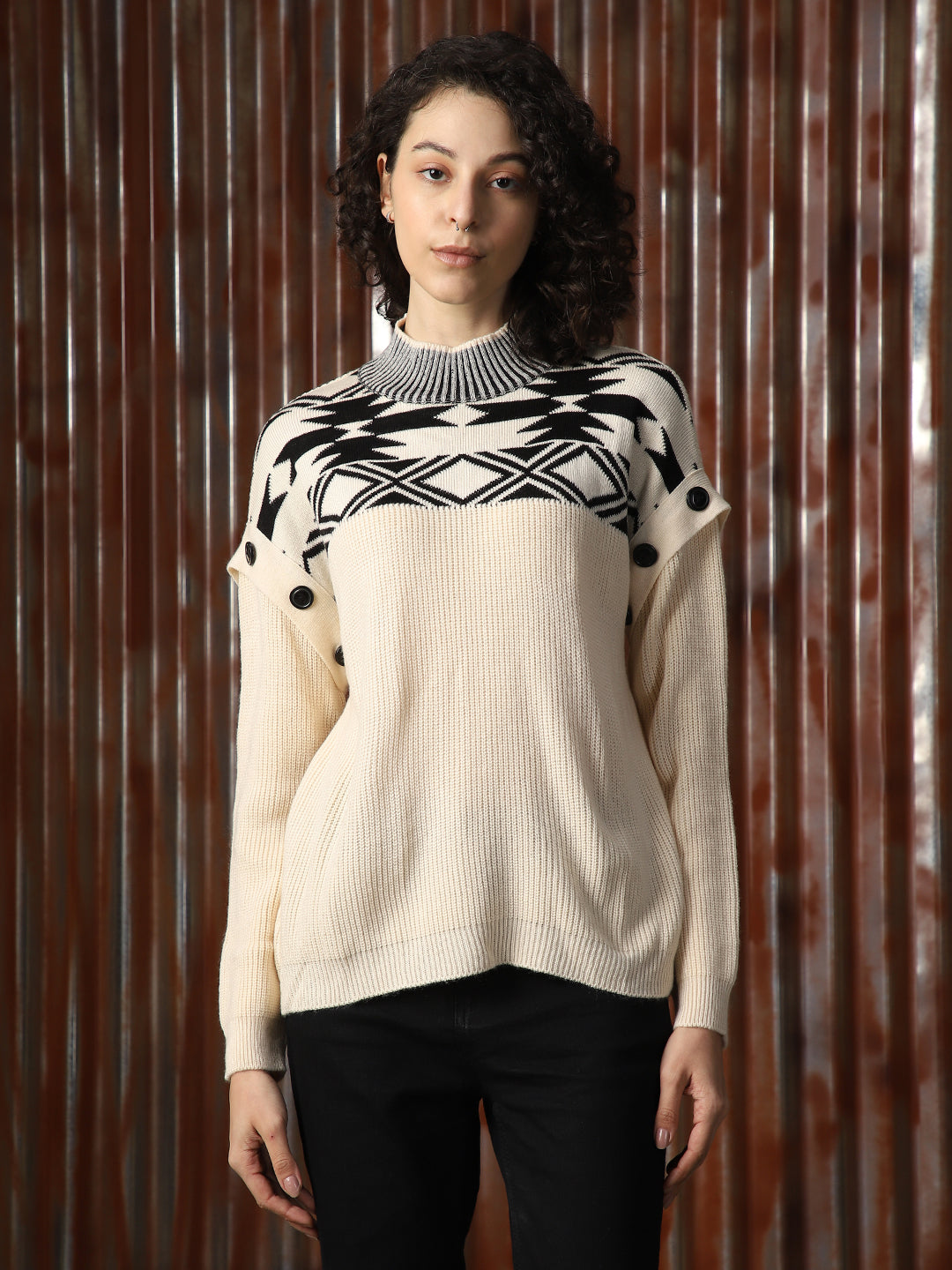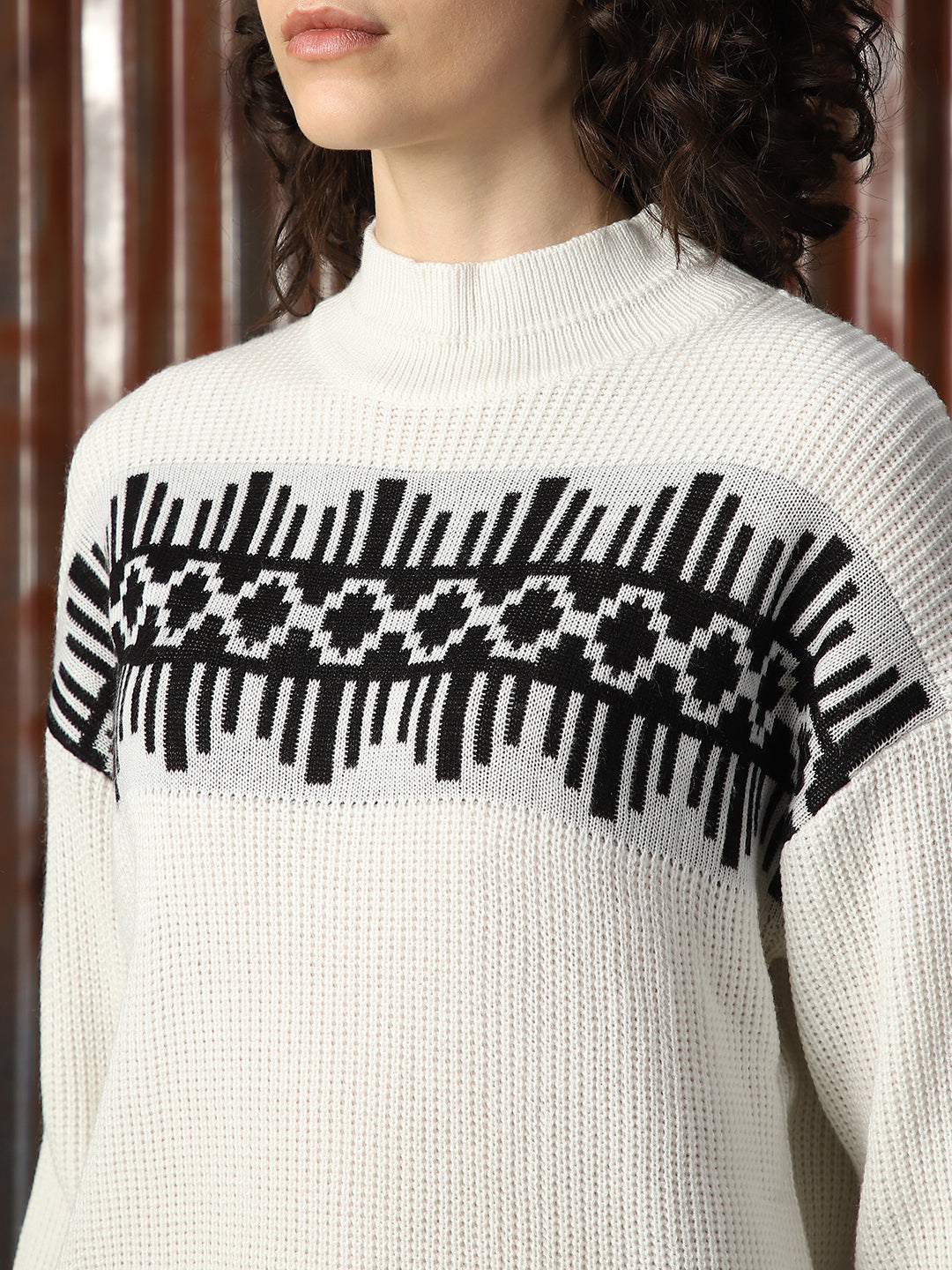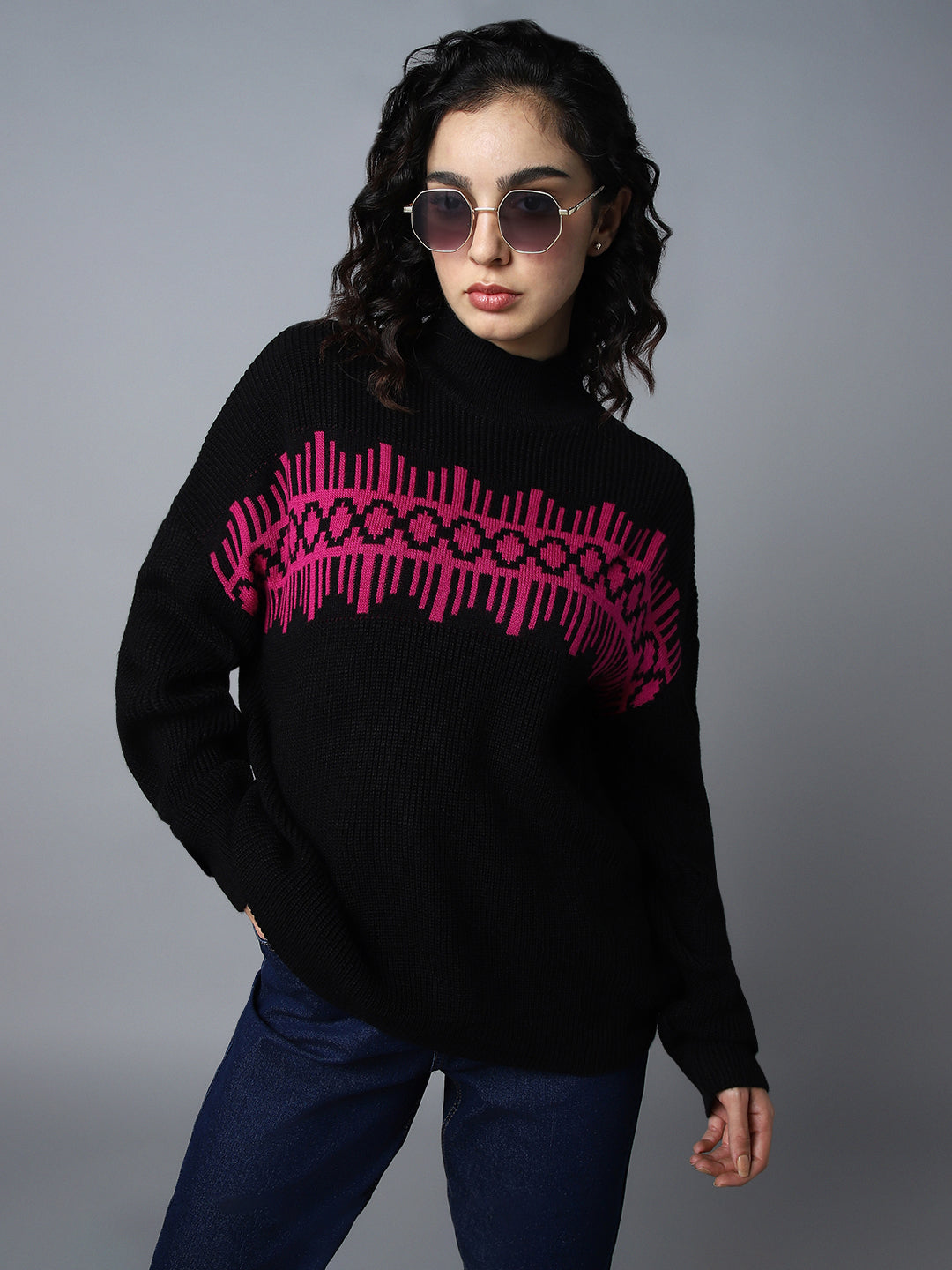 Women Geometric Printed Mock Collar Long Sleeve Acrylic Pullover Sweaters
