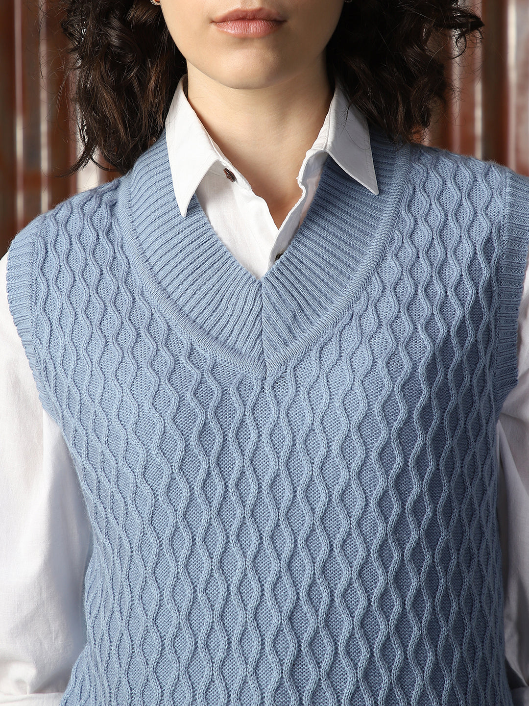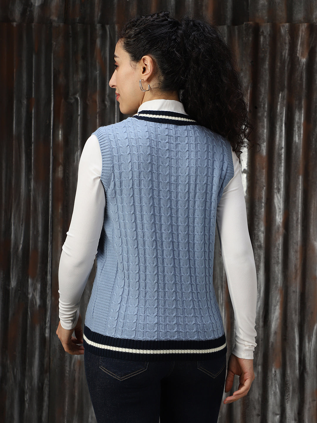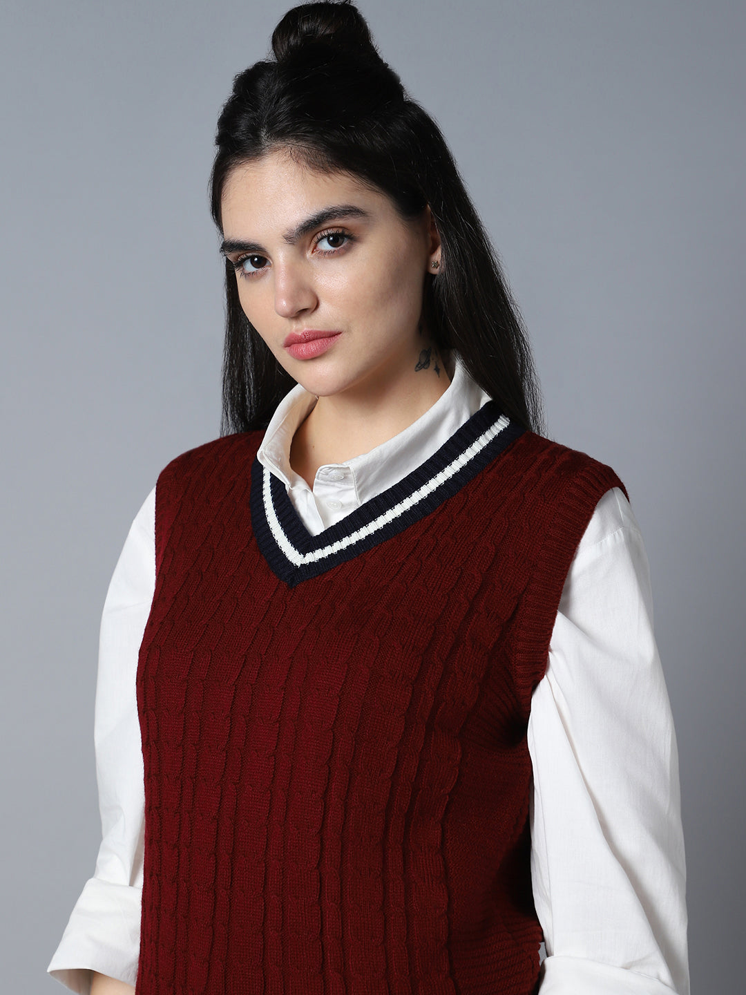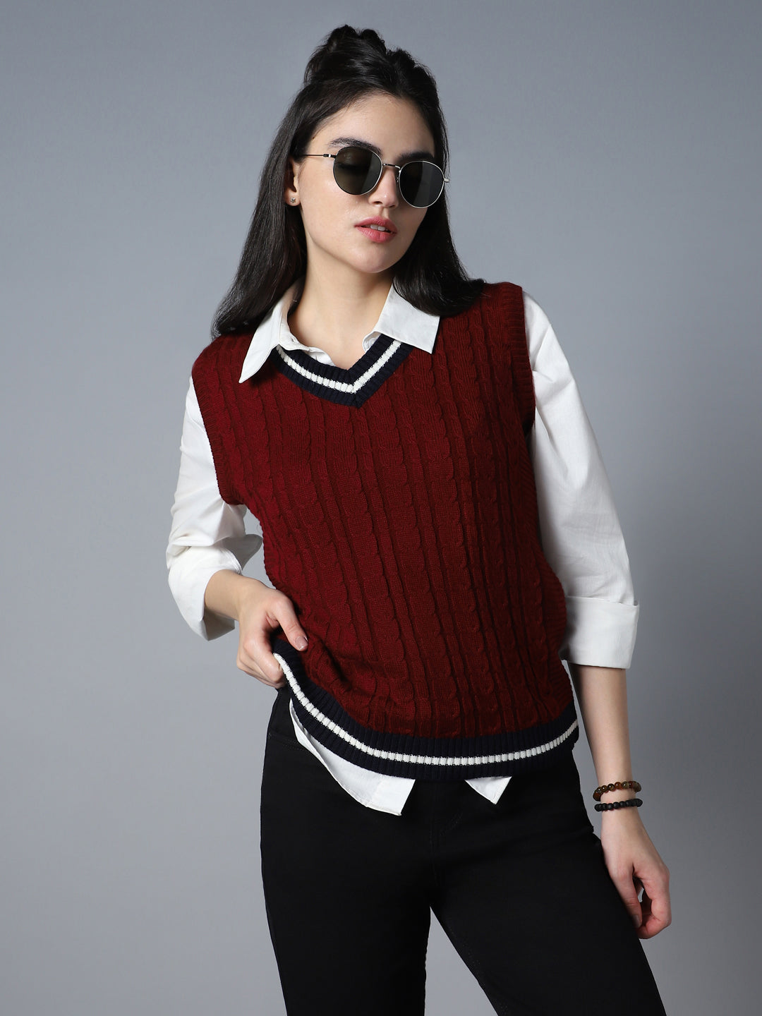 Women V-Neck Self Design Cable Knit Sleeveless Pullover Sweaters