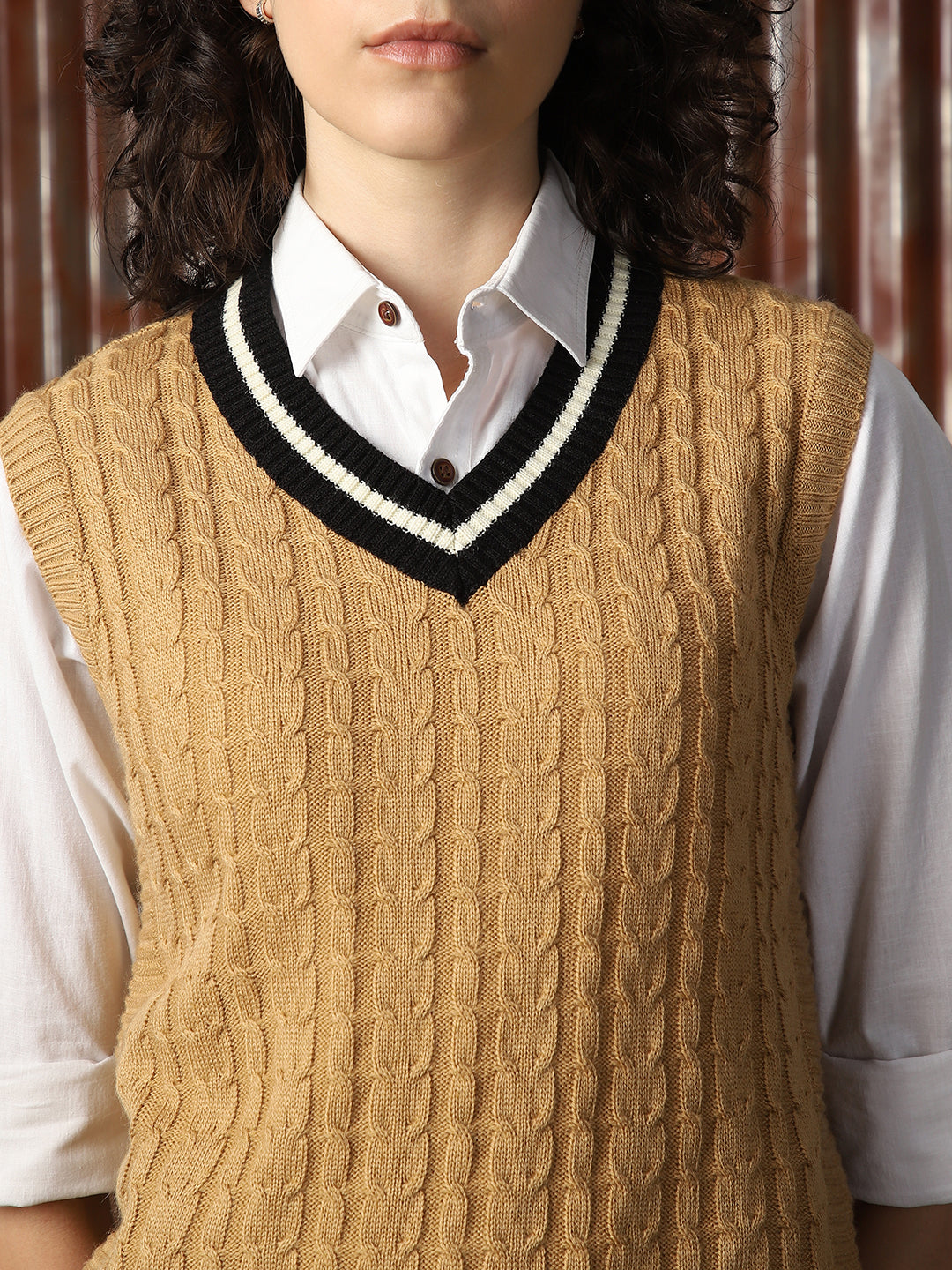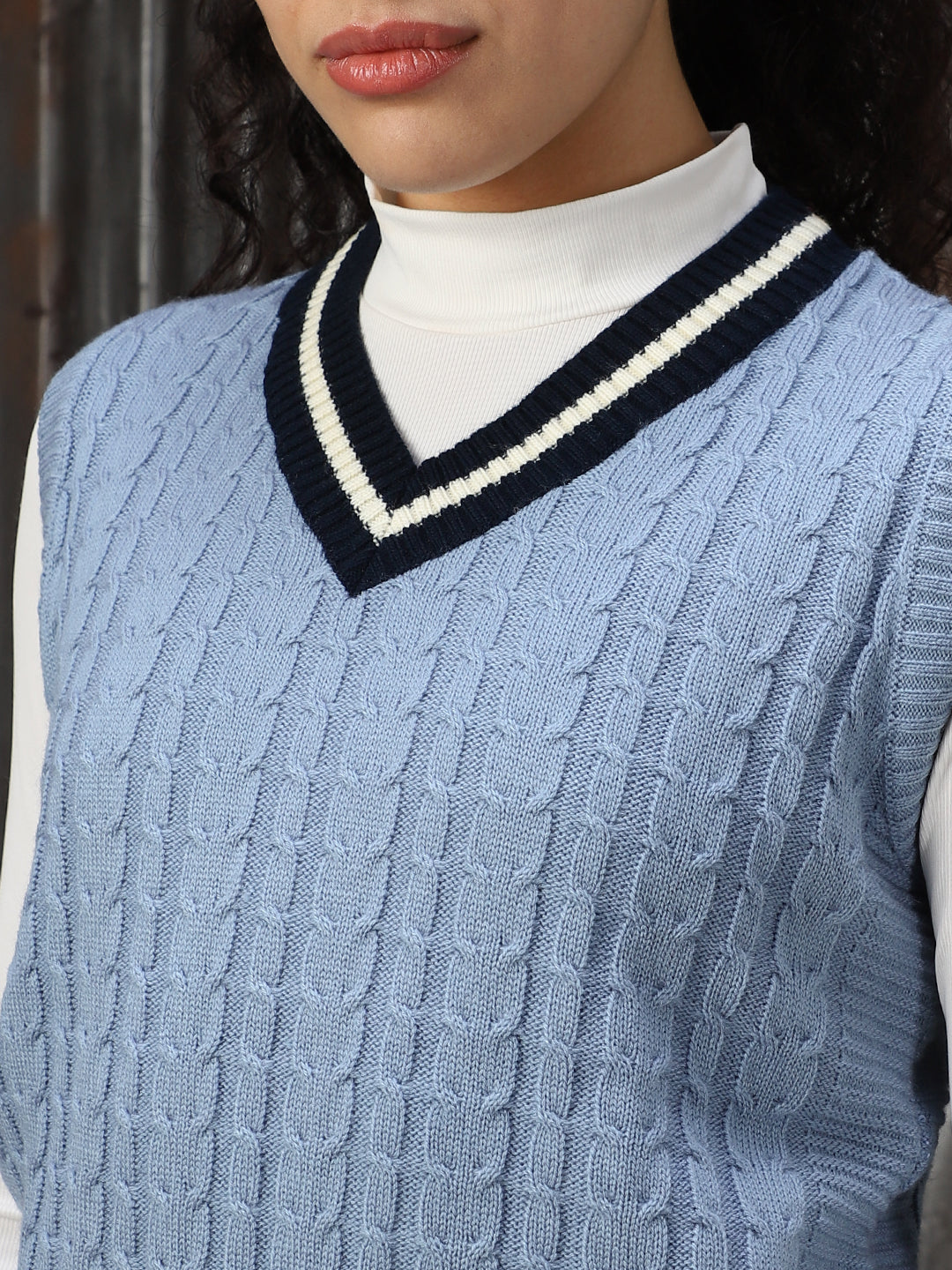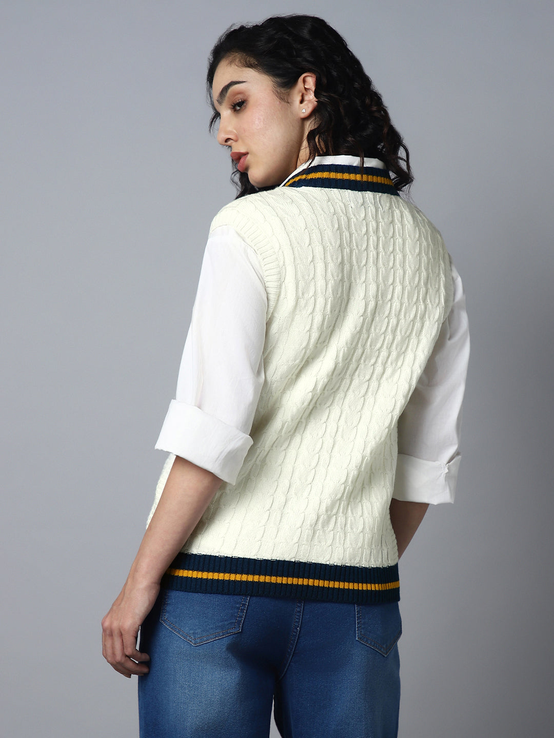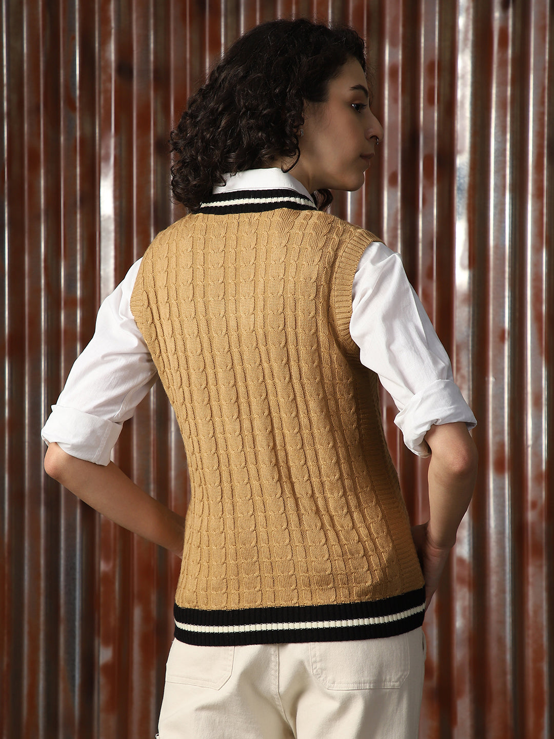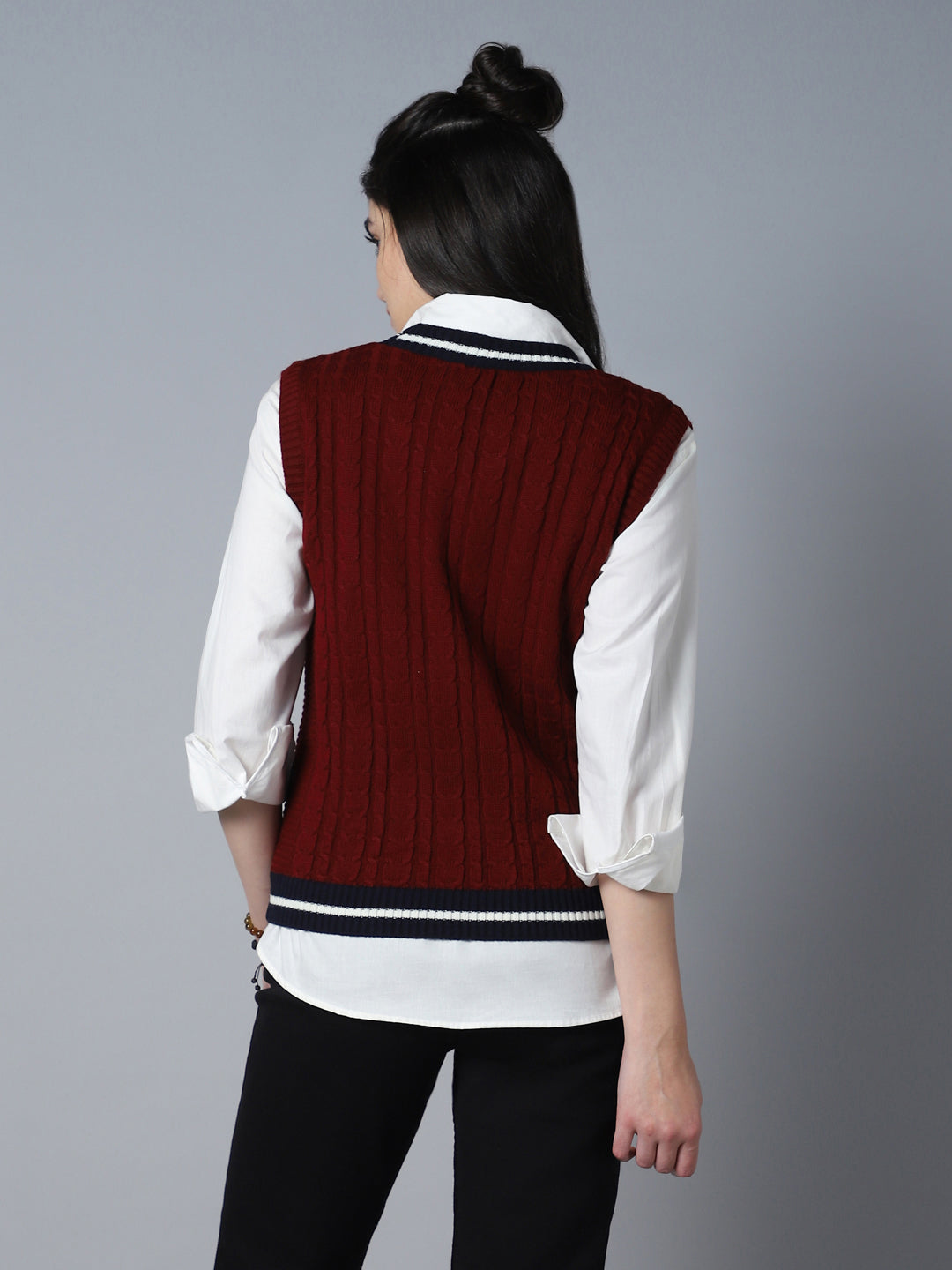 Women V-Neck Self Design Cable Knit Sleeveless Pullover Sweaters