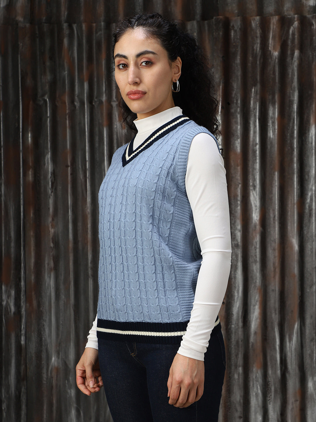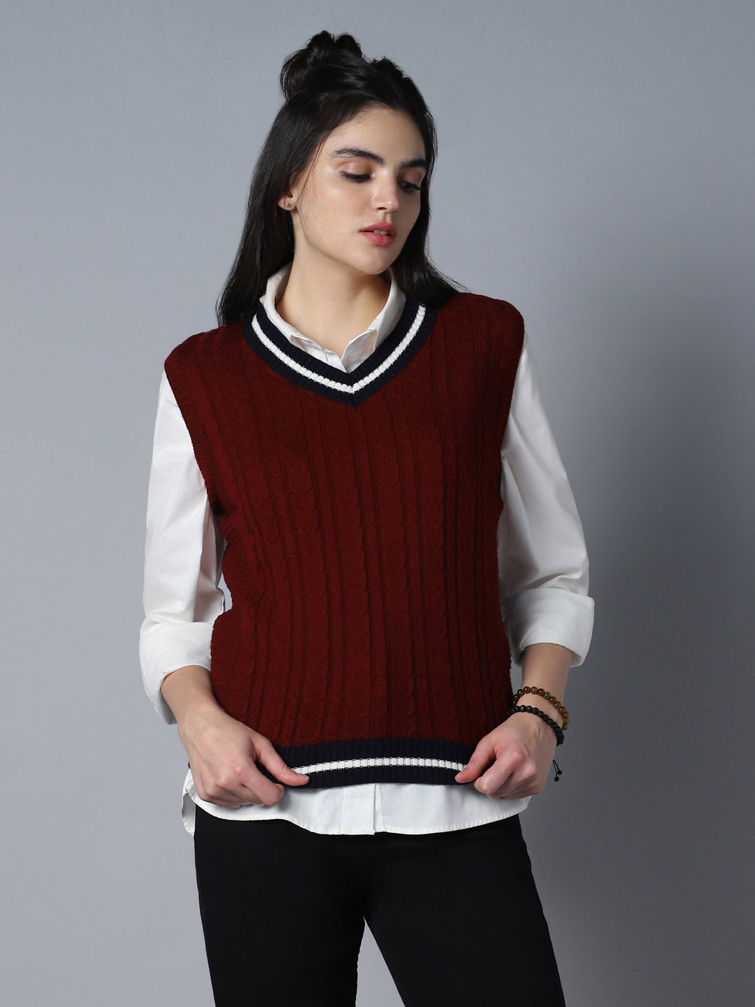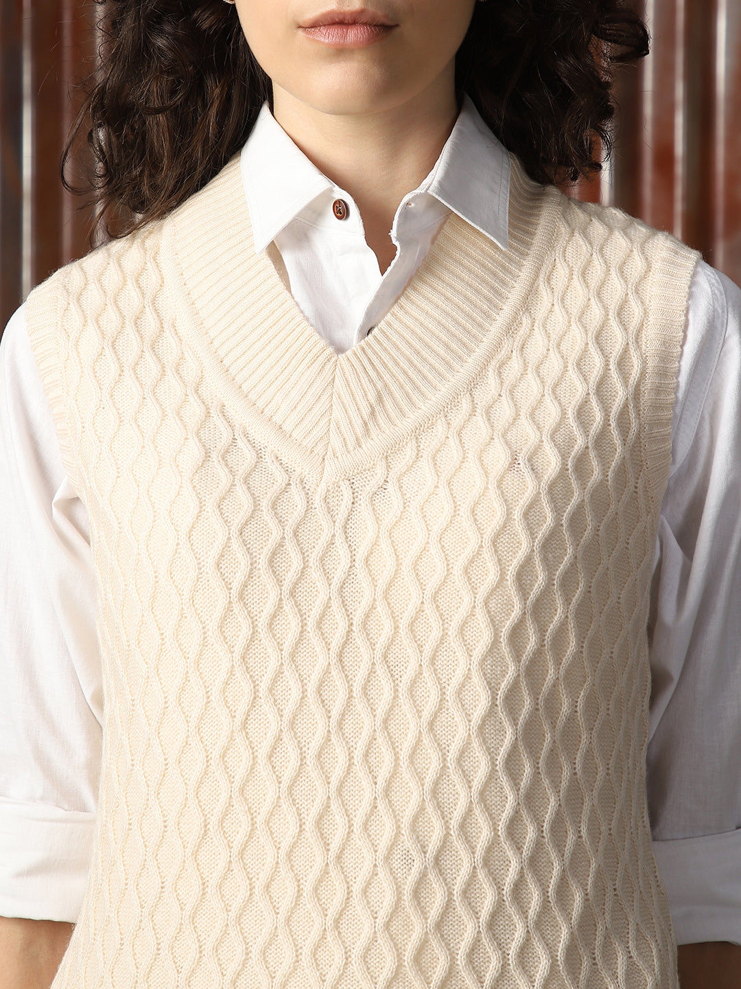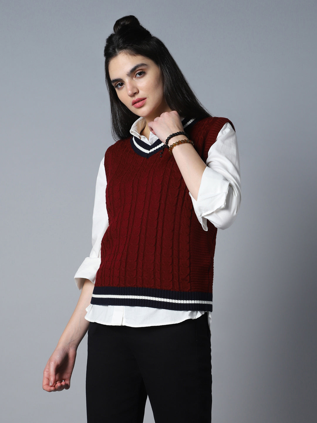 Women V-Neck Self Design Cable Knit Sleeveless Pullover Sweaters