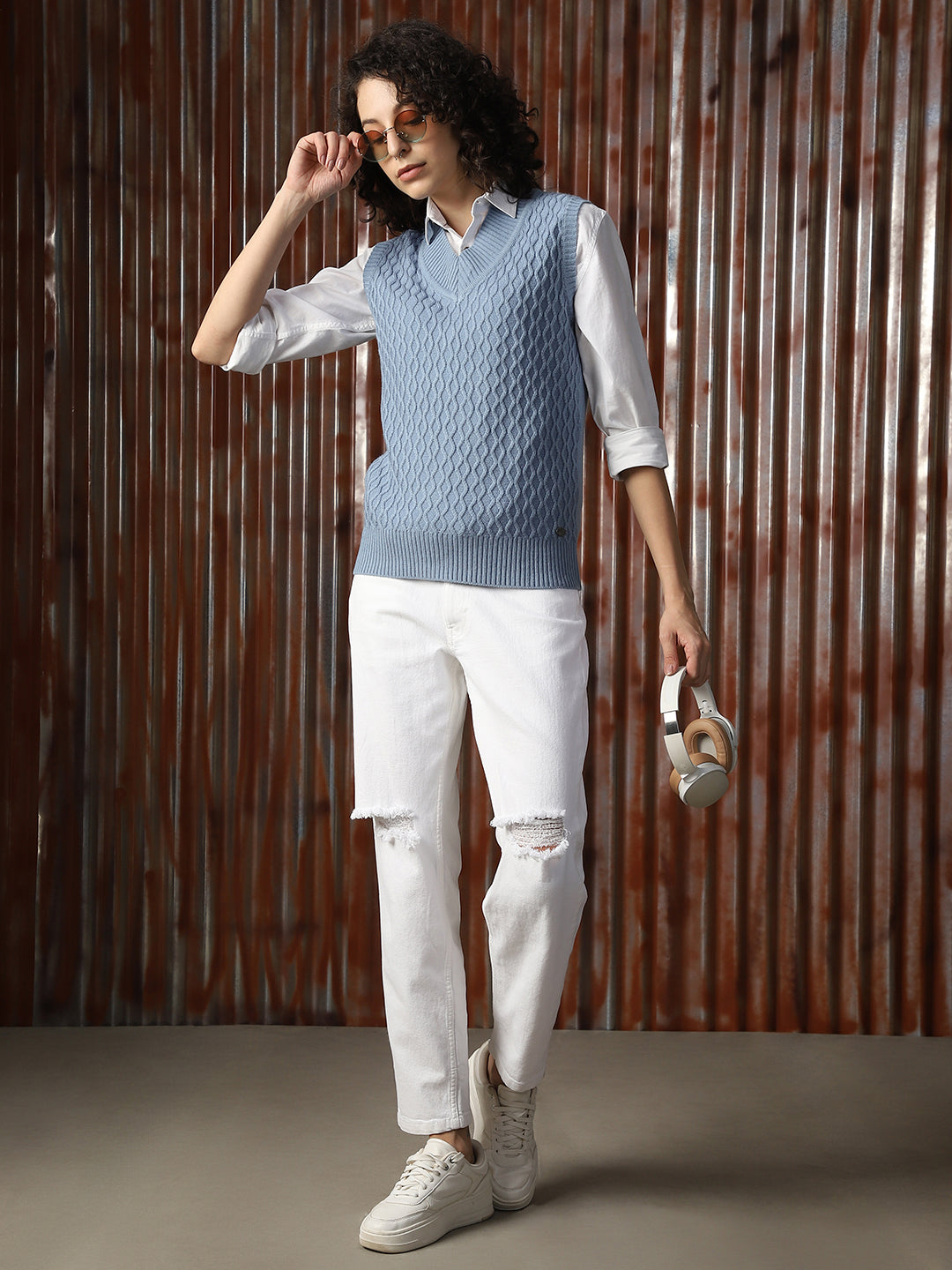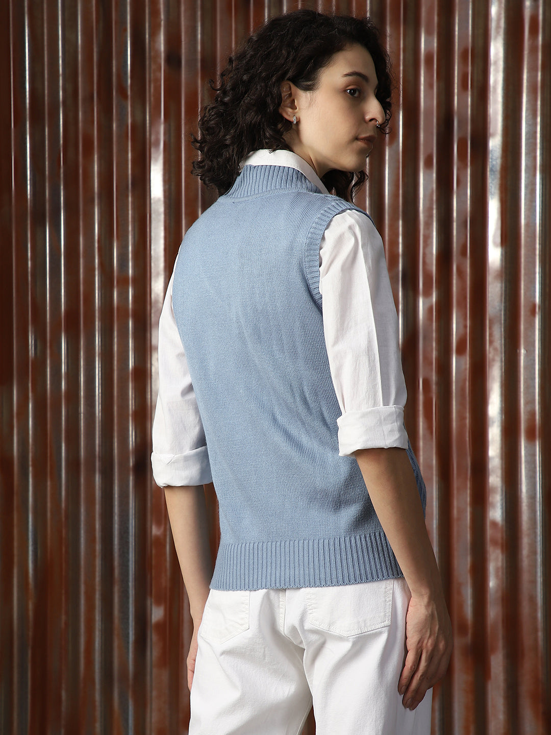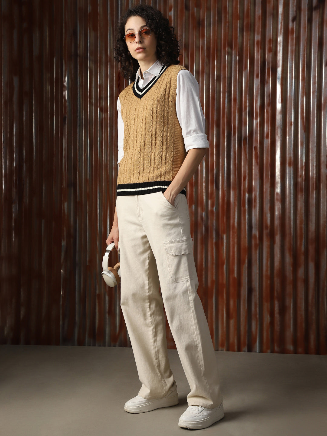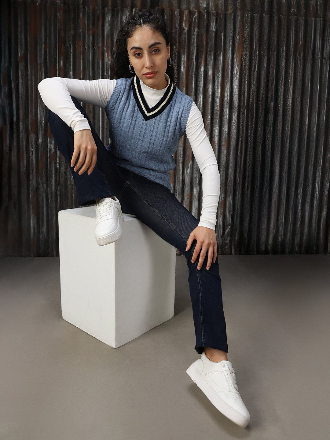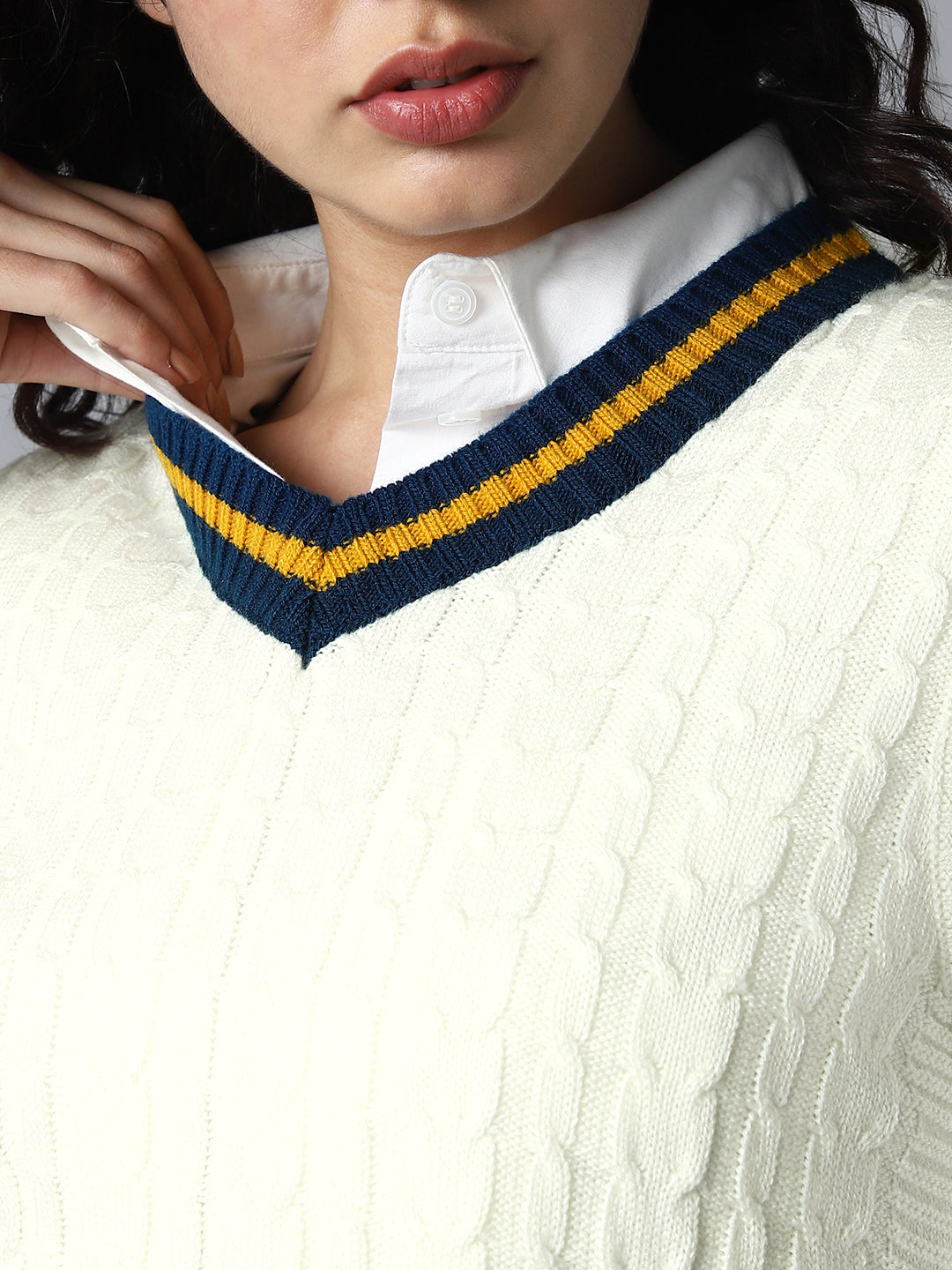 Women V-Neck Self Design Cable Knit Sleeveless Pullover Sweaters