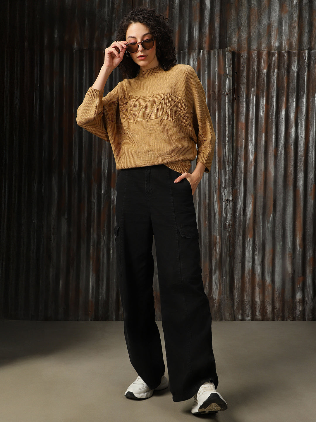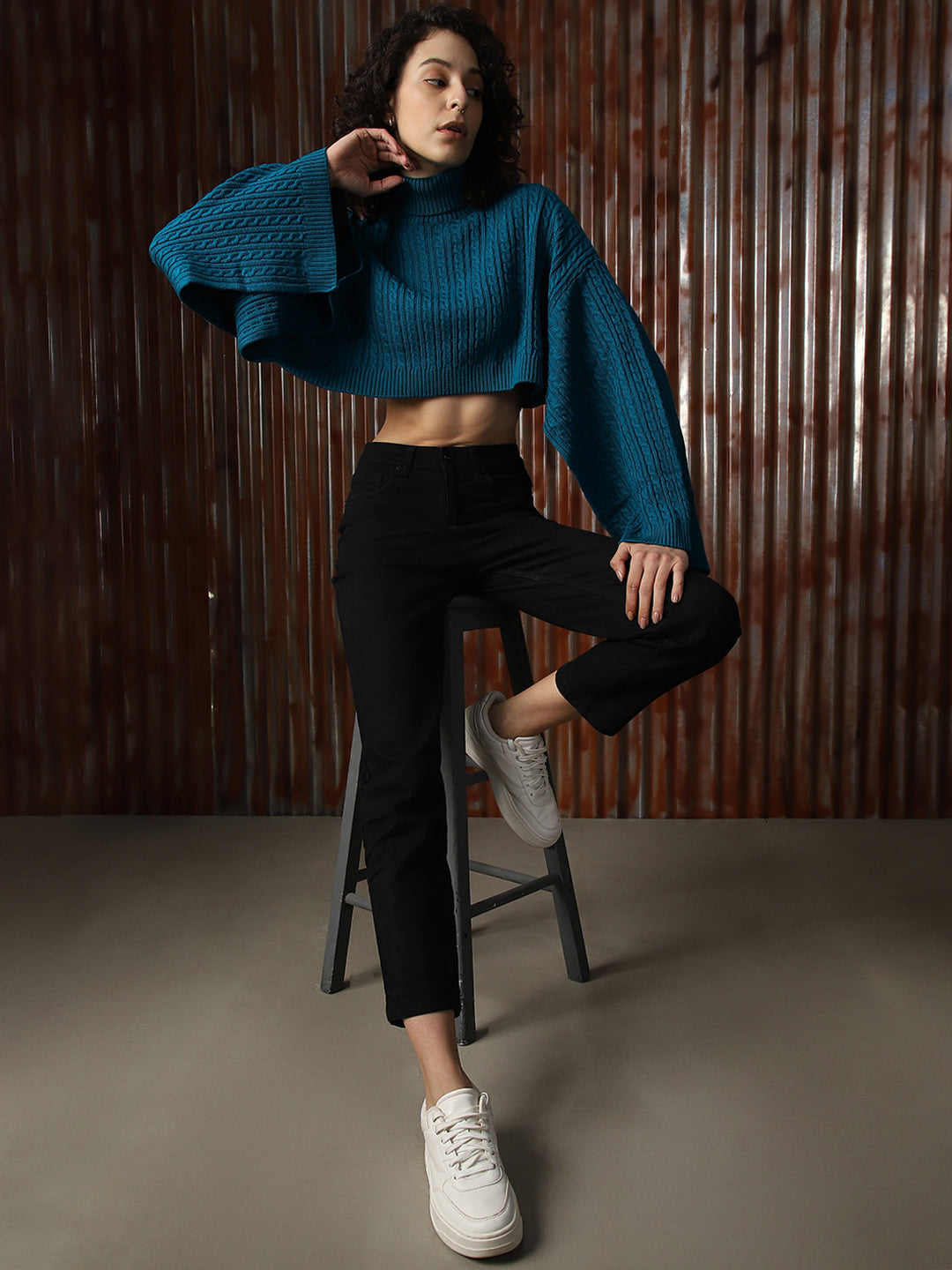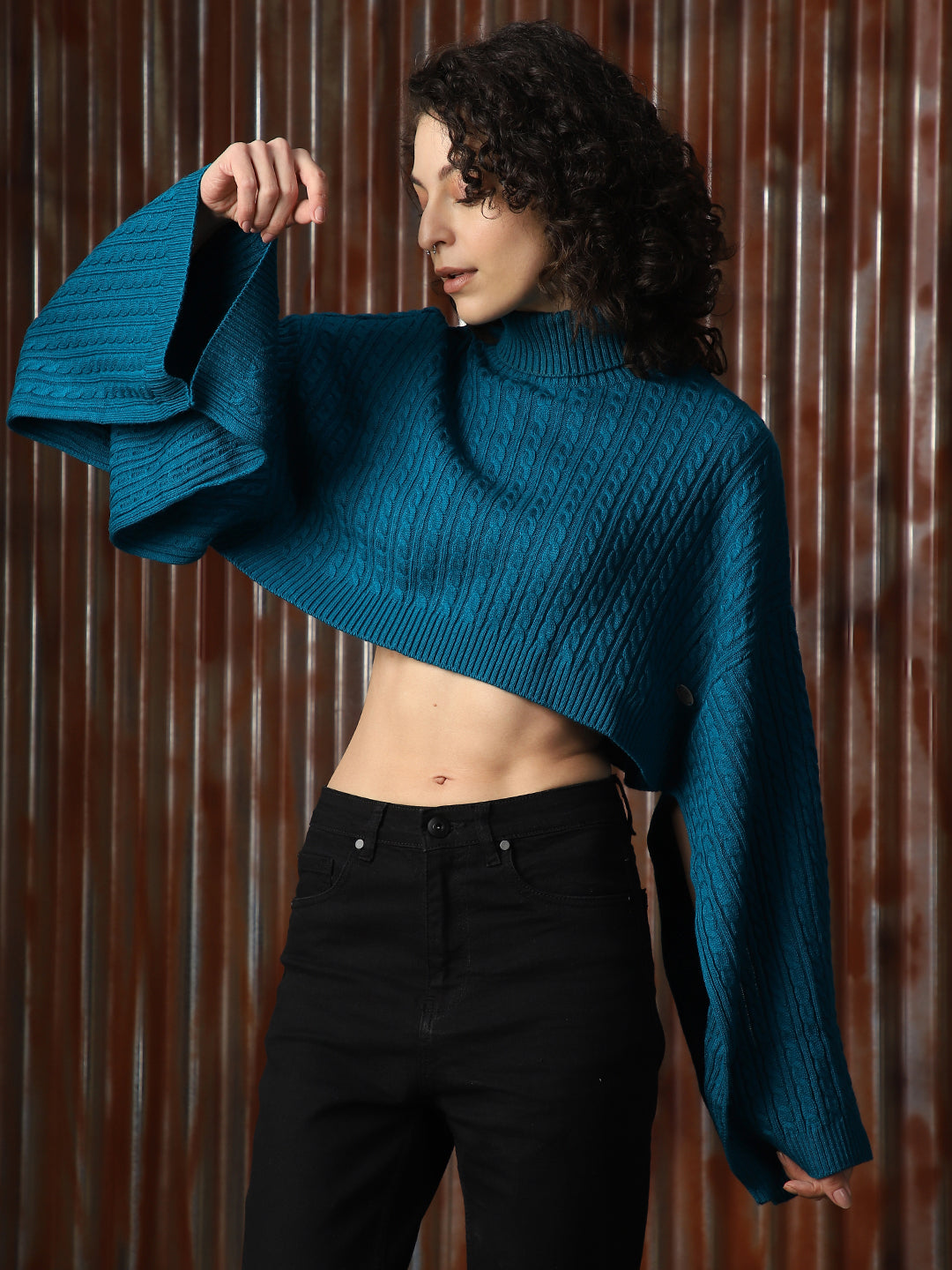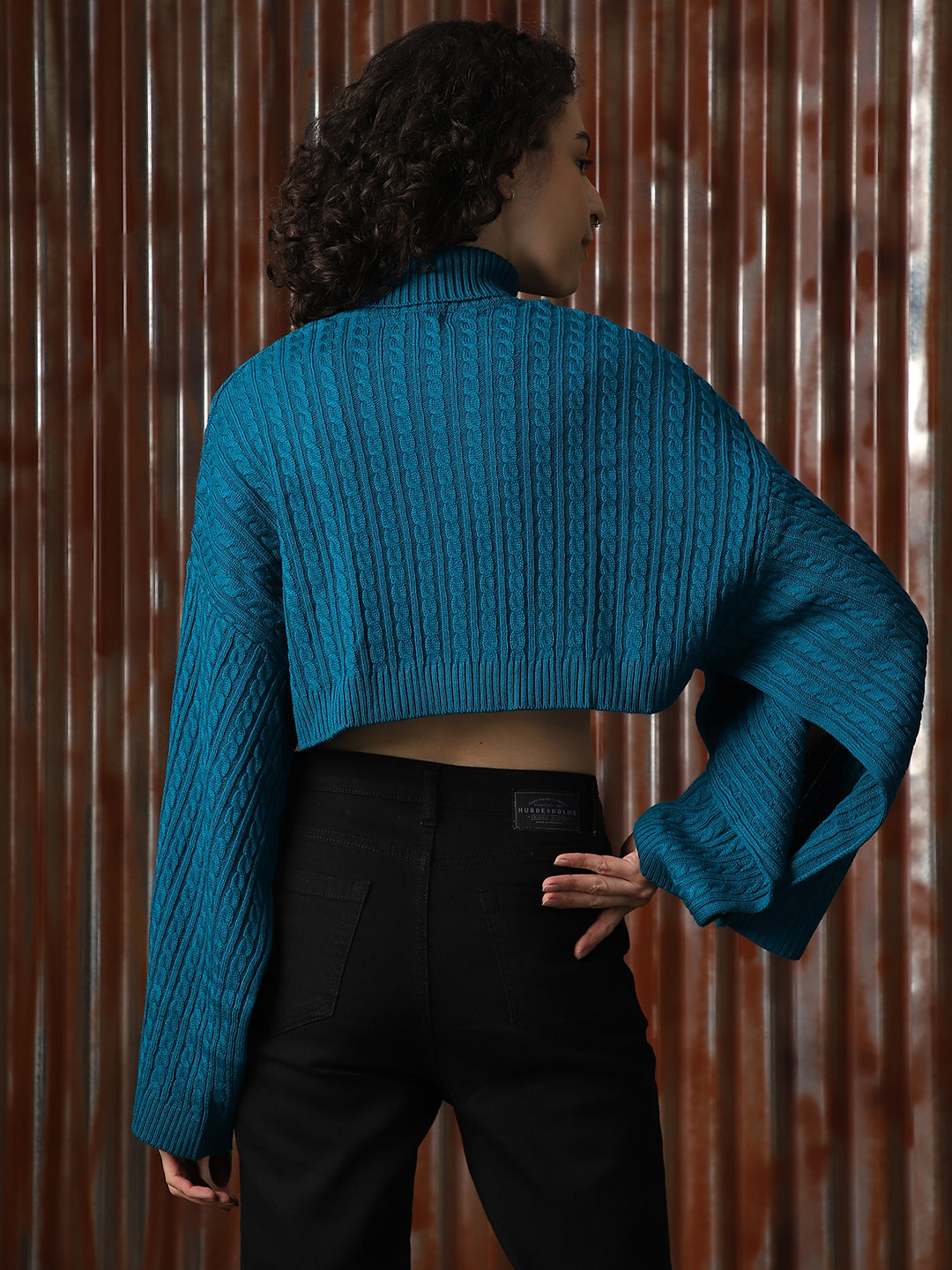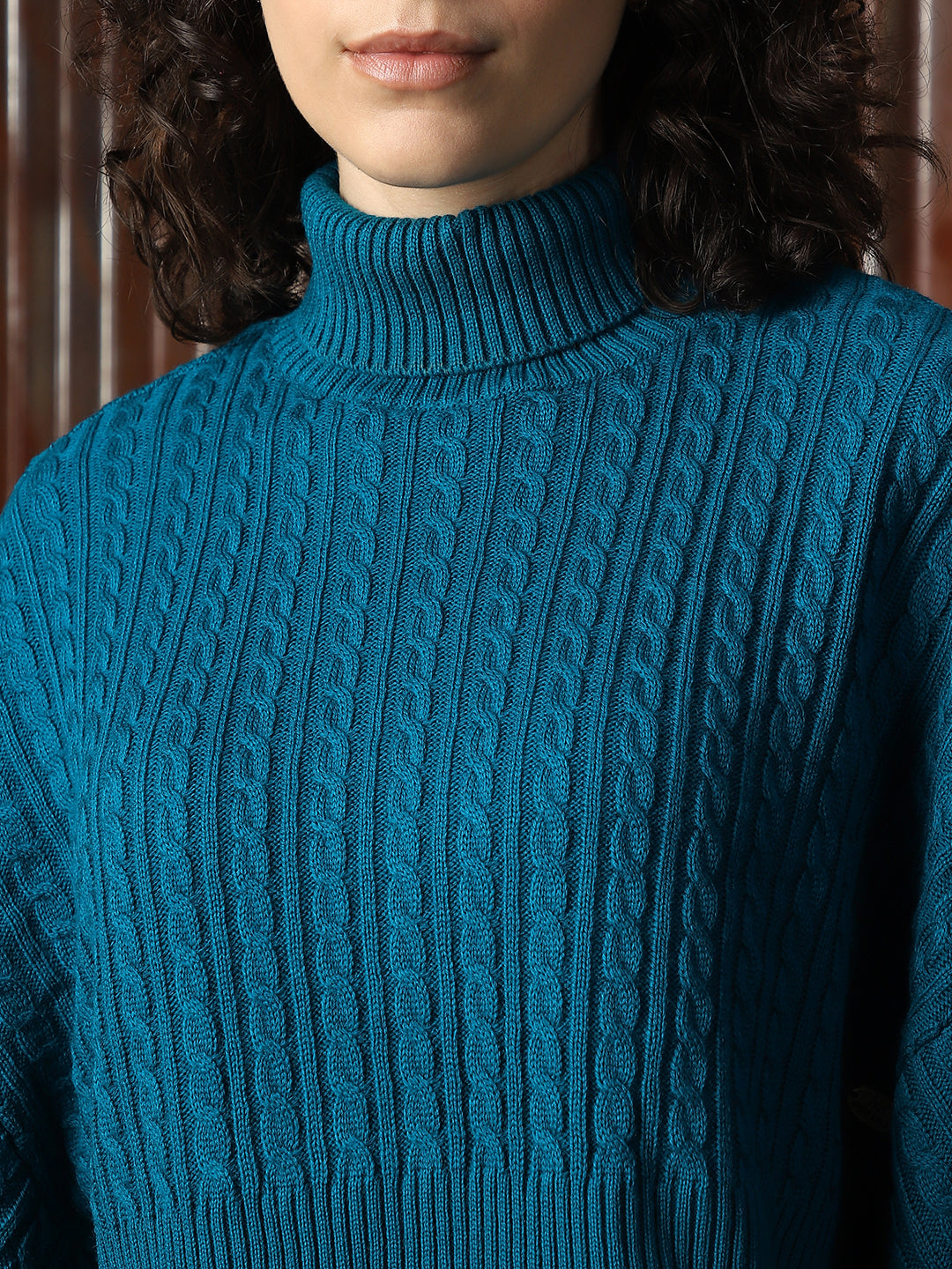Women Self Design Cabel Knit Crop Oversized Turtle Neck Pullover
