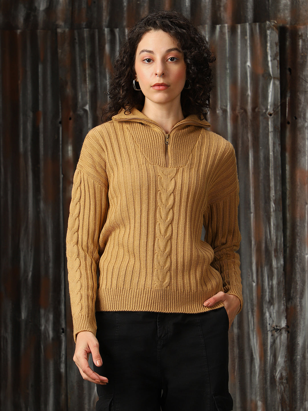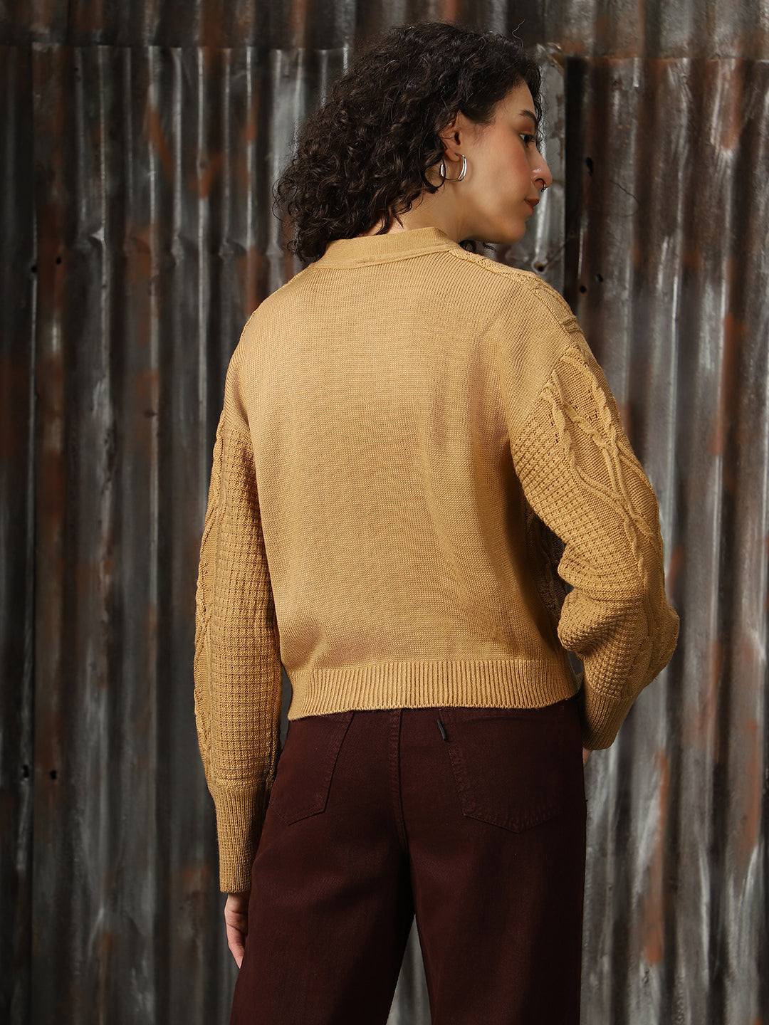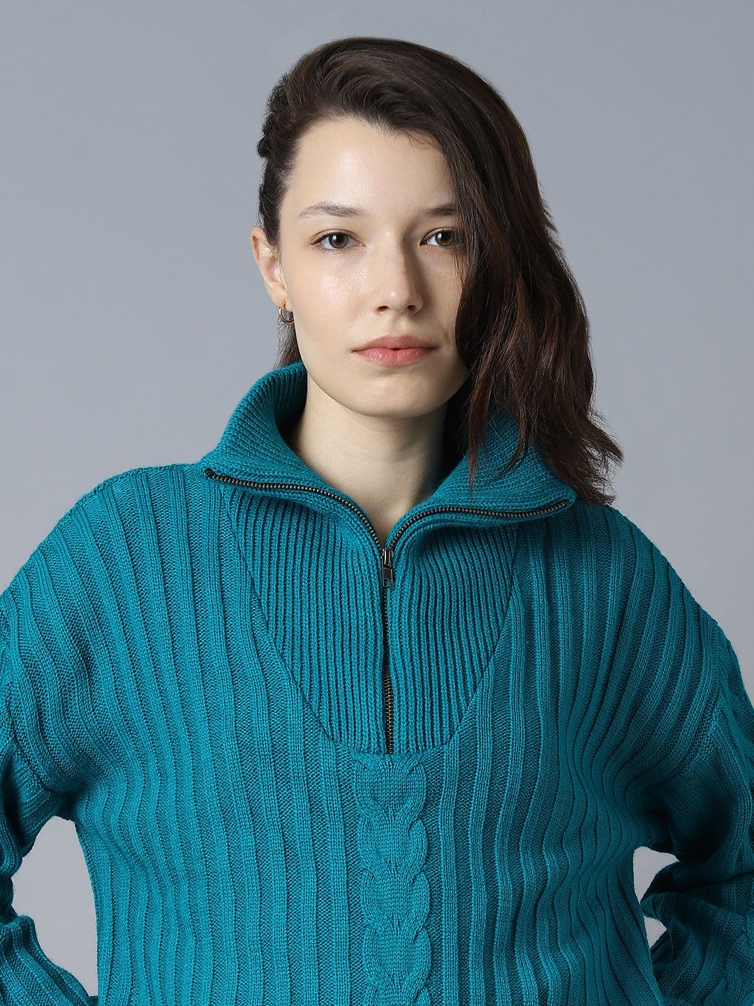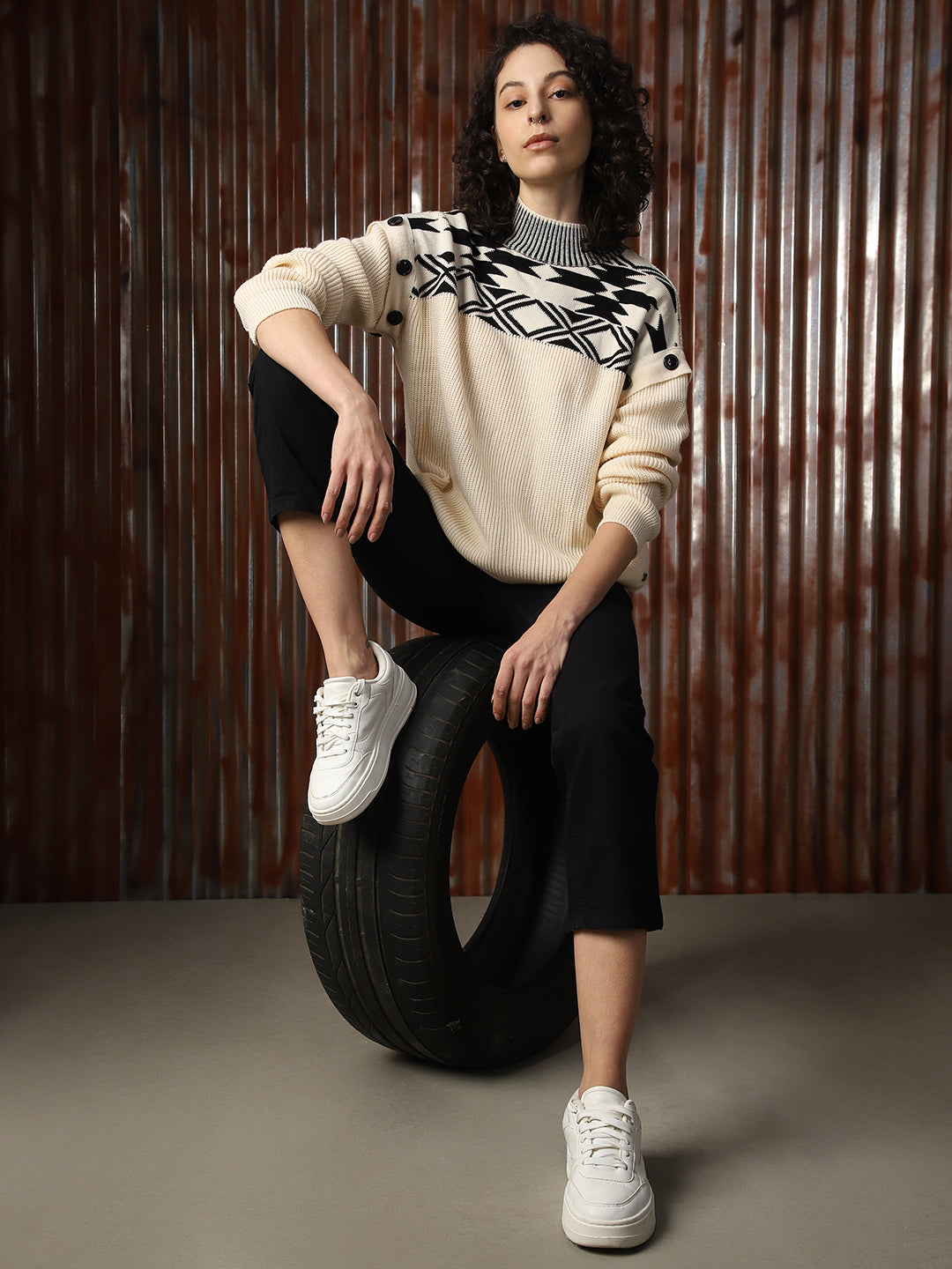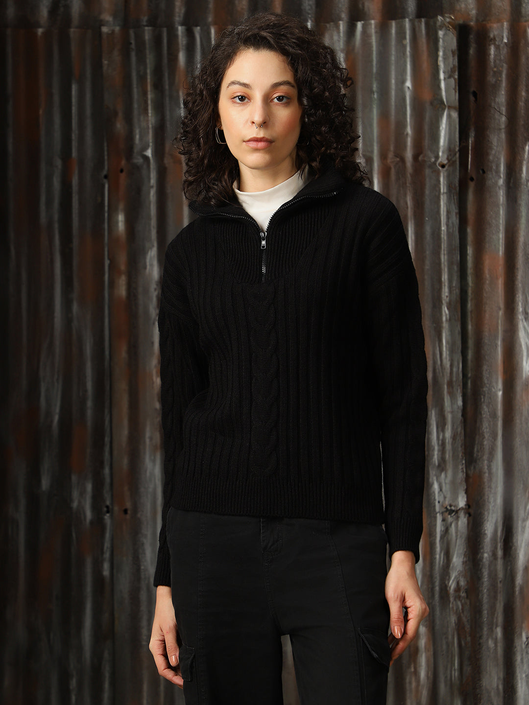 Women Self Design Cabel Knit Crop Oversized Turtle Neck Pullover
