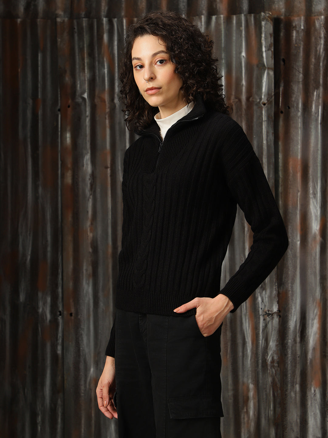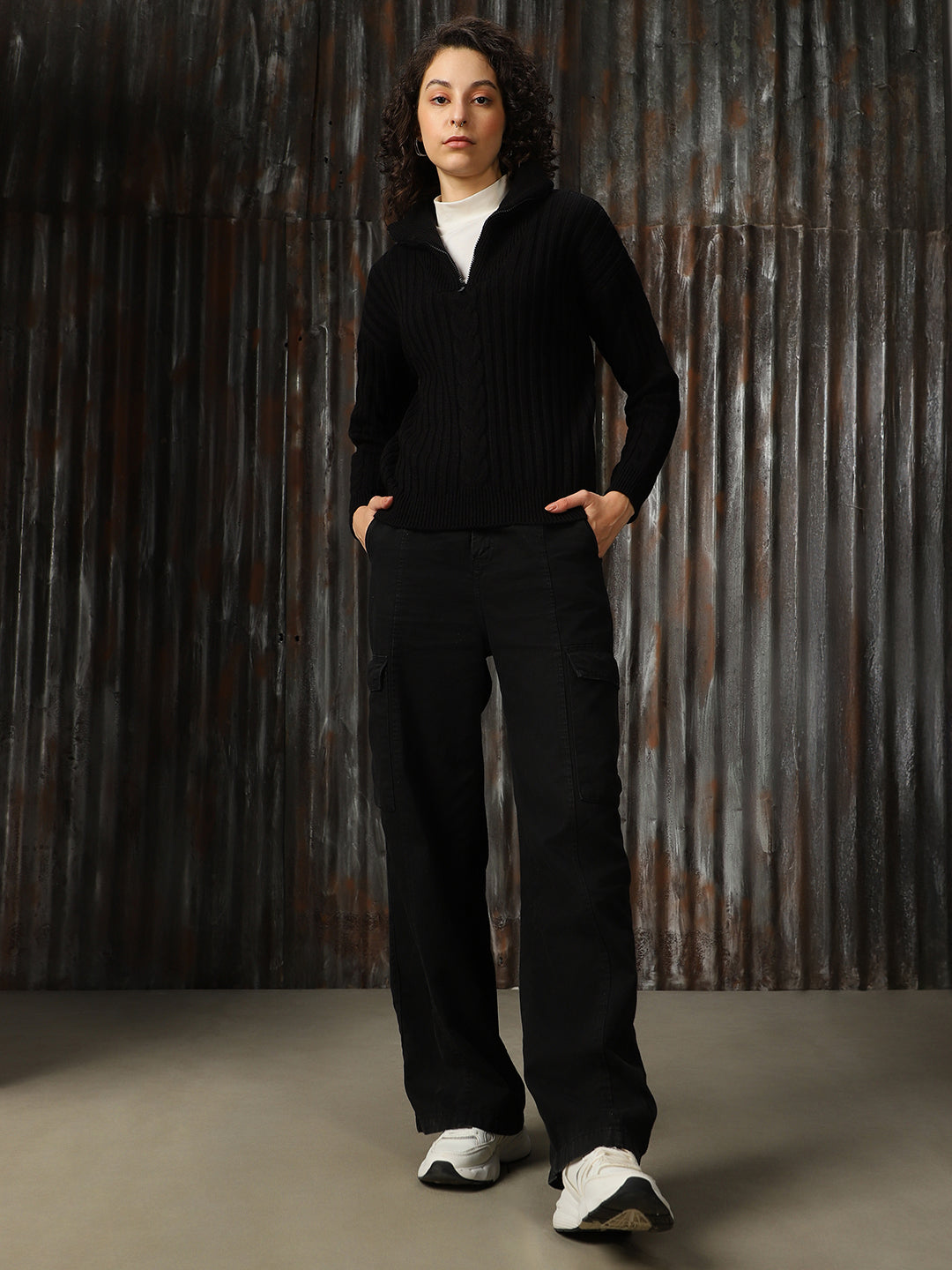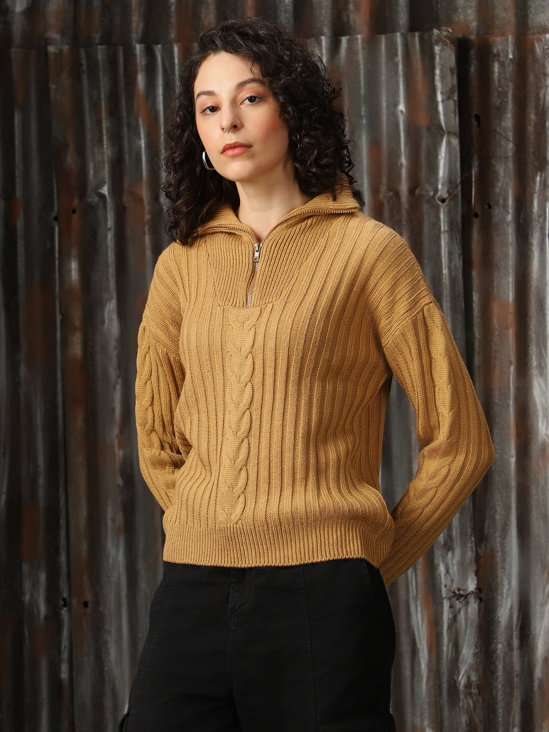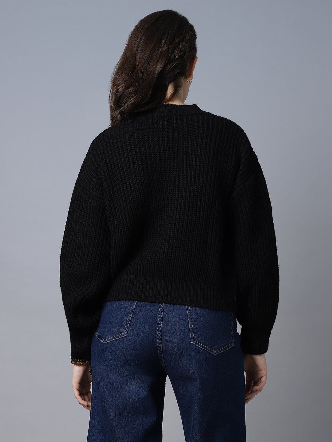 Women Self Design Cabel Knit Crop Oversized Turtle Neck Pullover