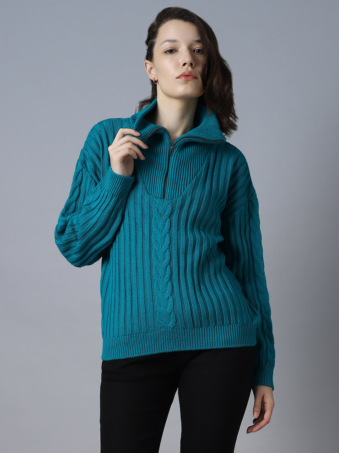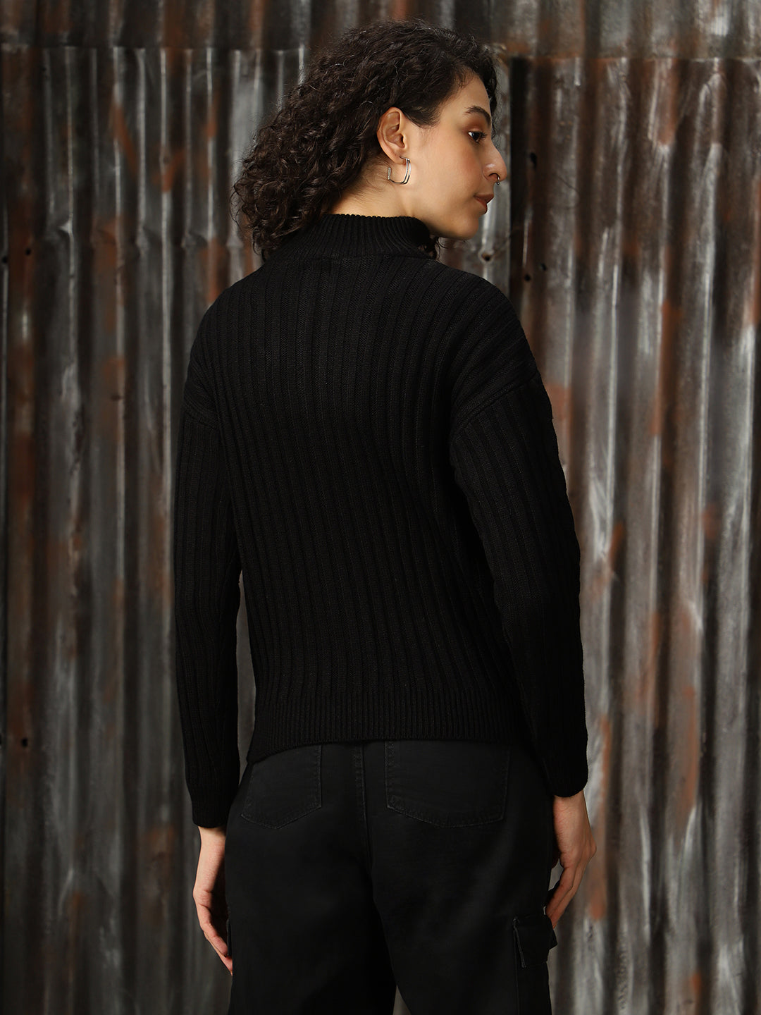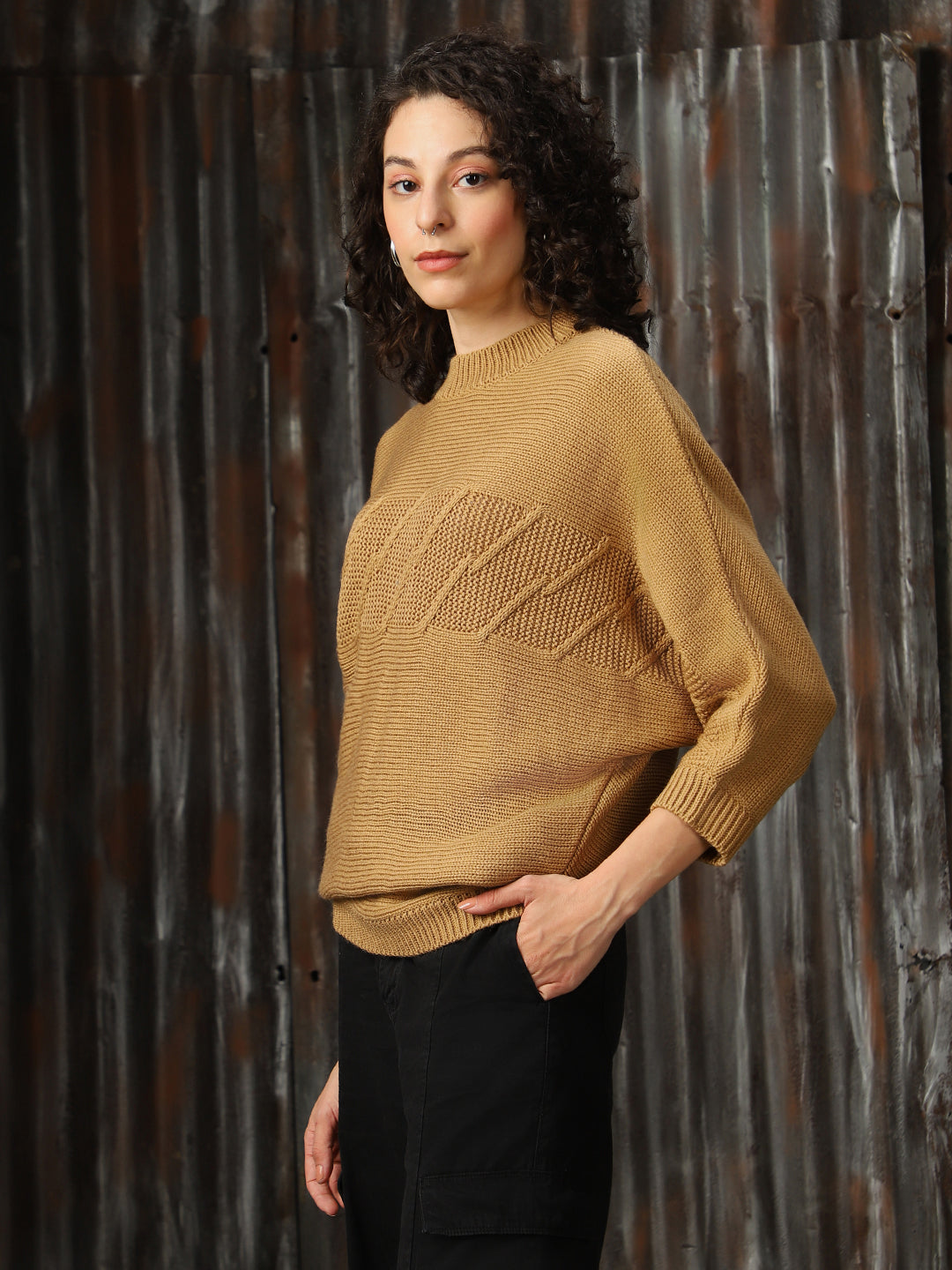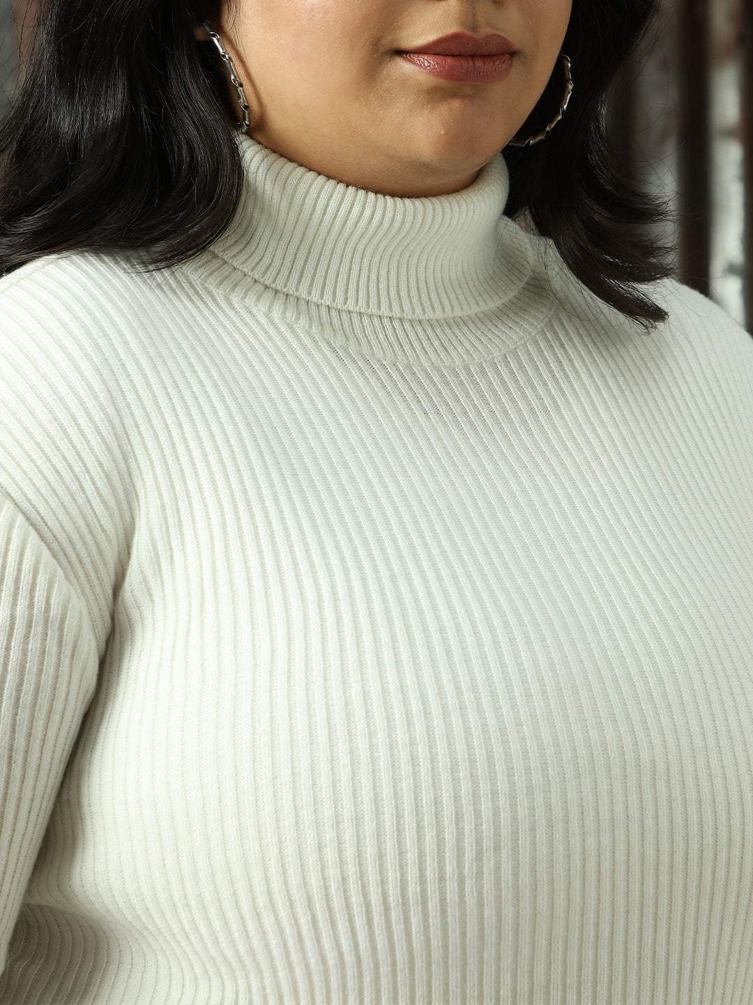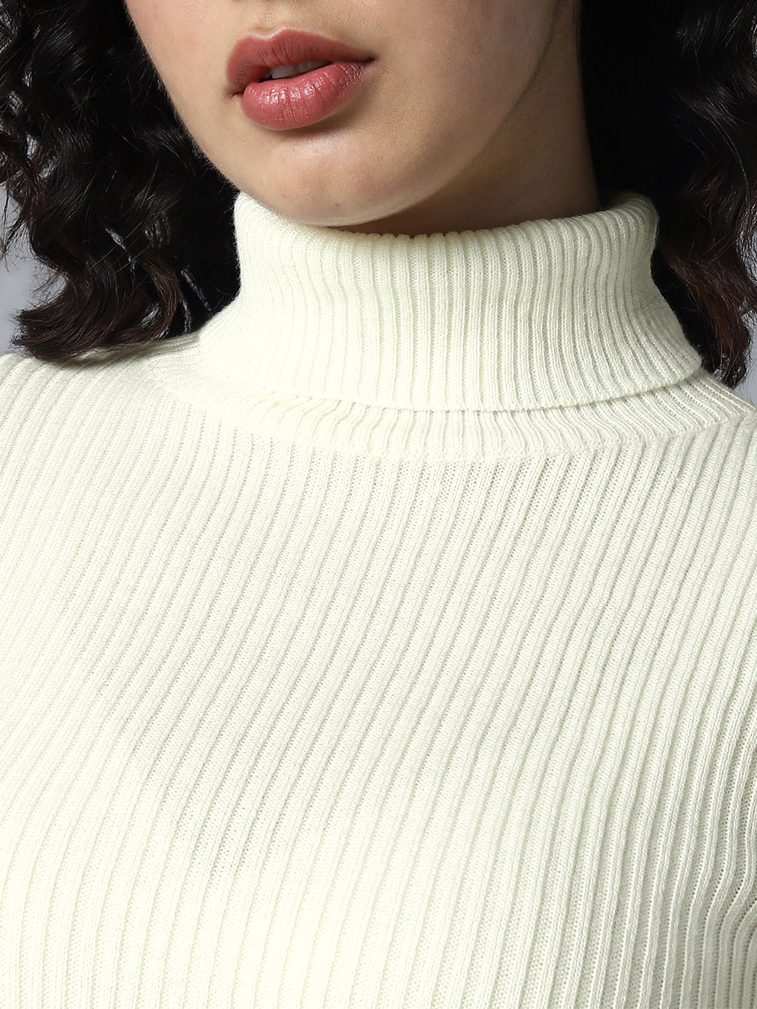 Women Self Design Cabel Knit Crop Oversized Turtle Neck Pullover