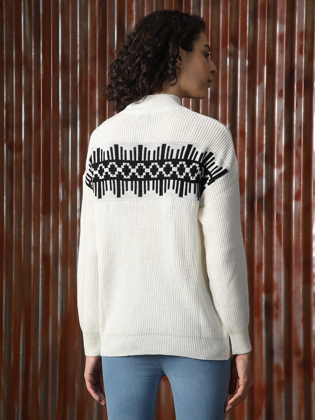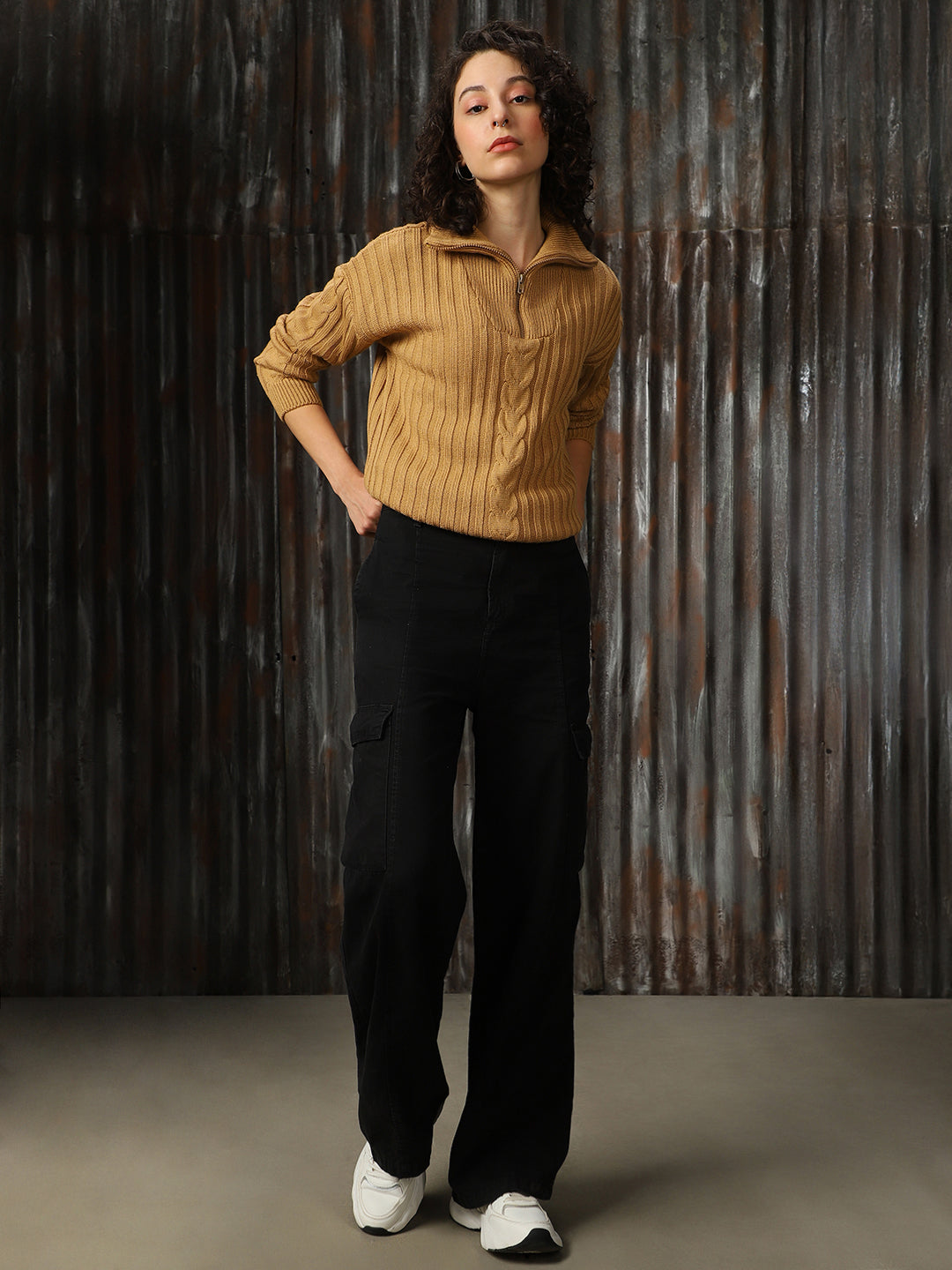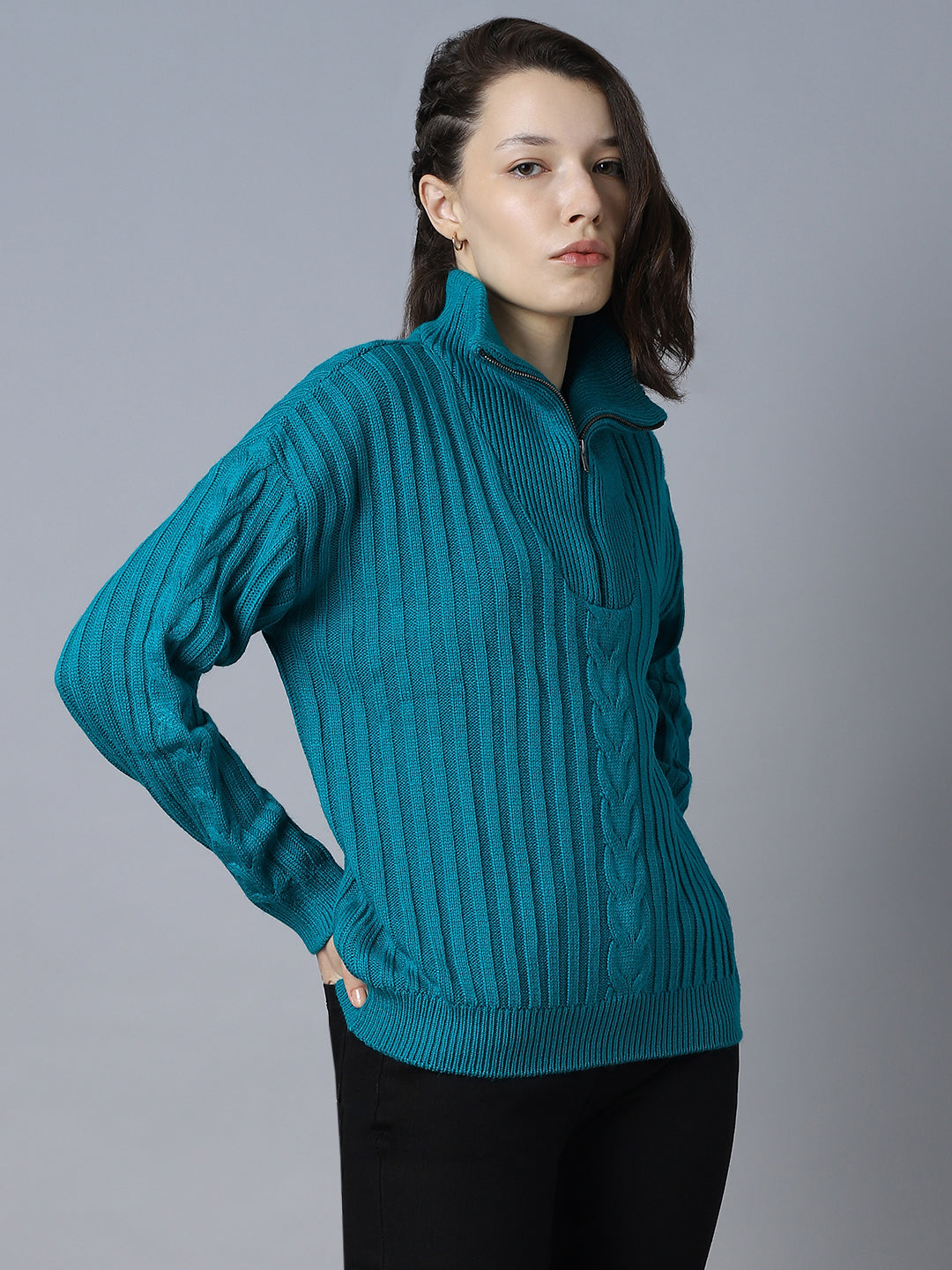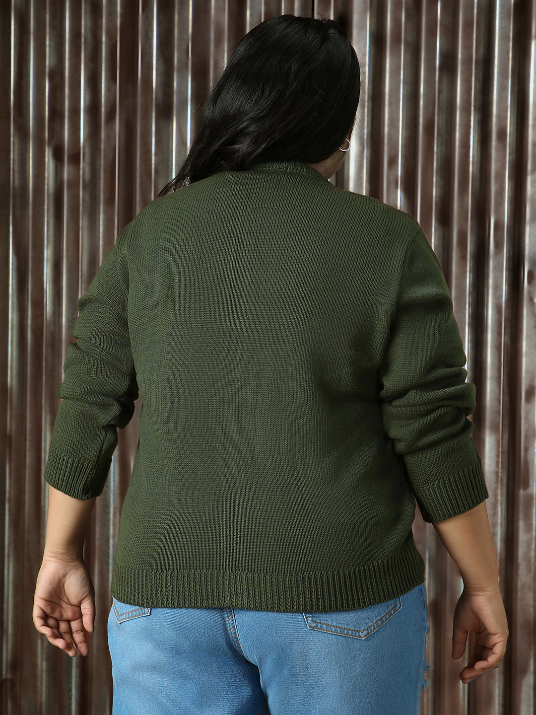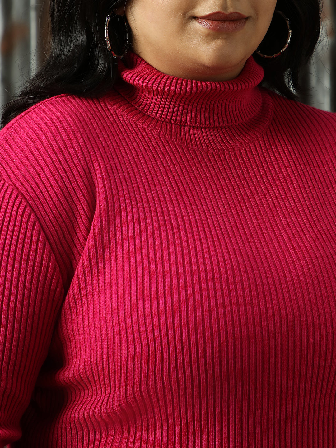 Women Self Design Cabel Knit Crop Oversized Turtle Neck Pullover