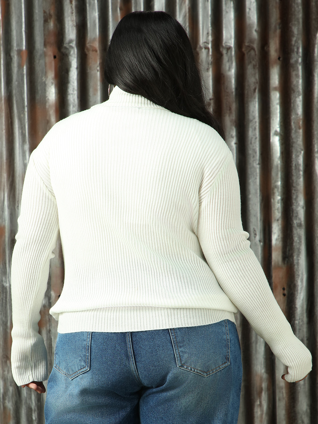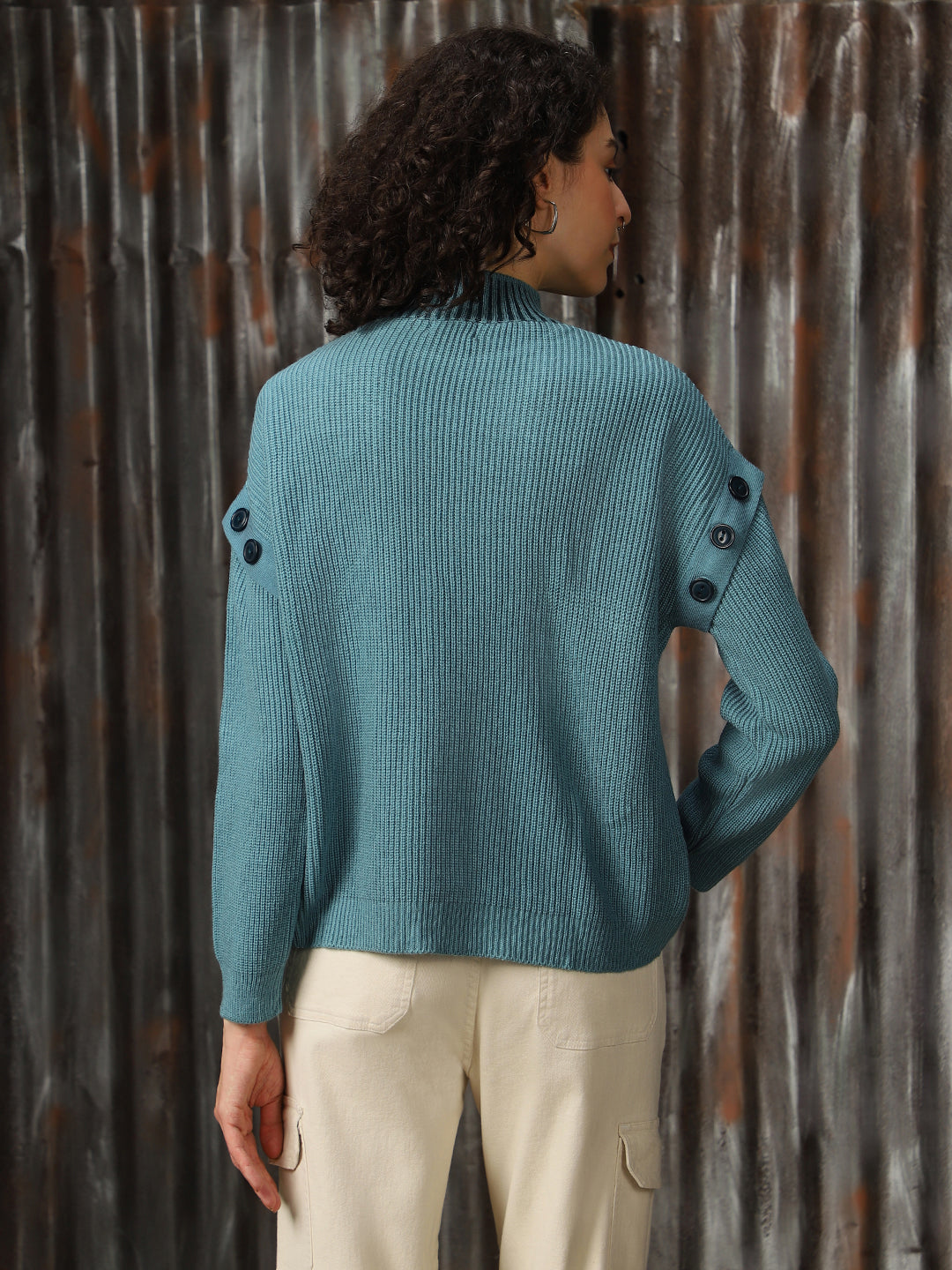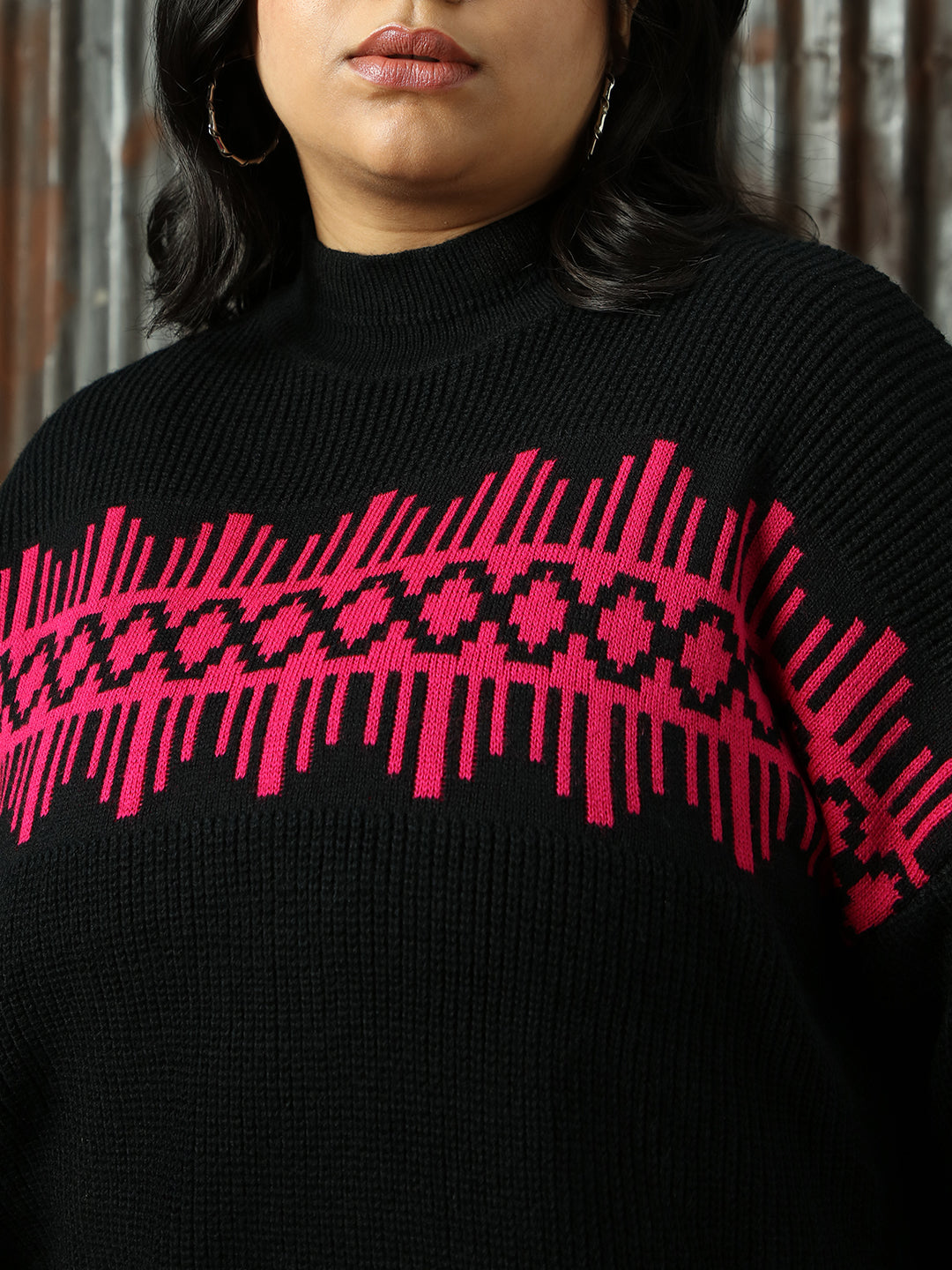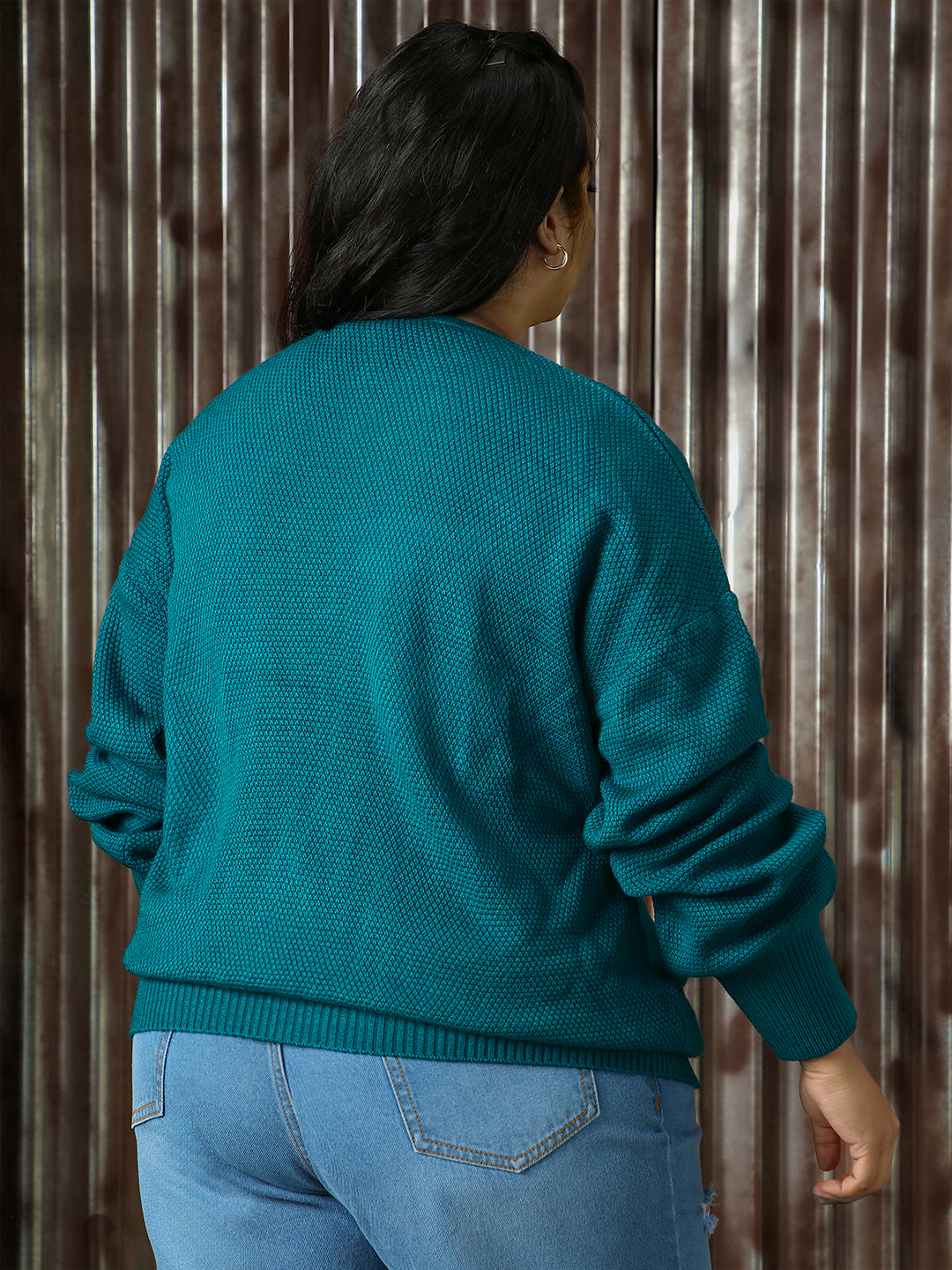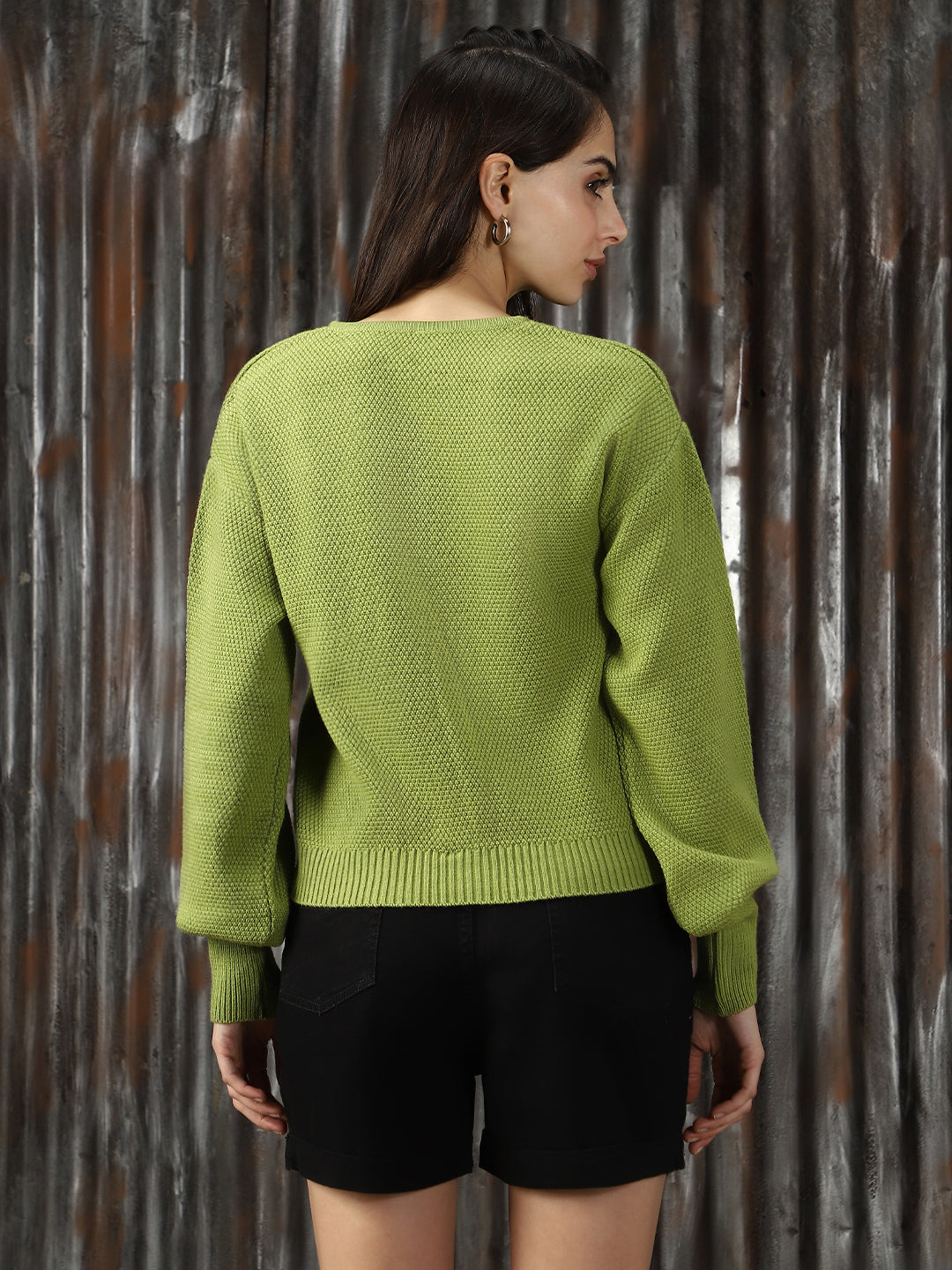Women Self Design Cabel Knit Crop Oversized Turtle Neck Pullover