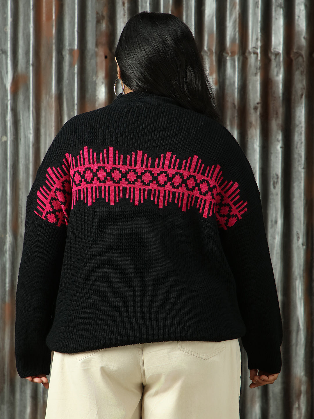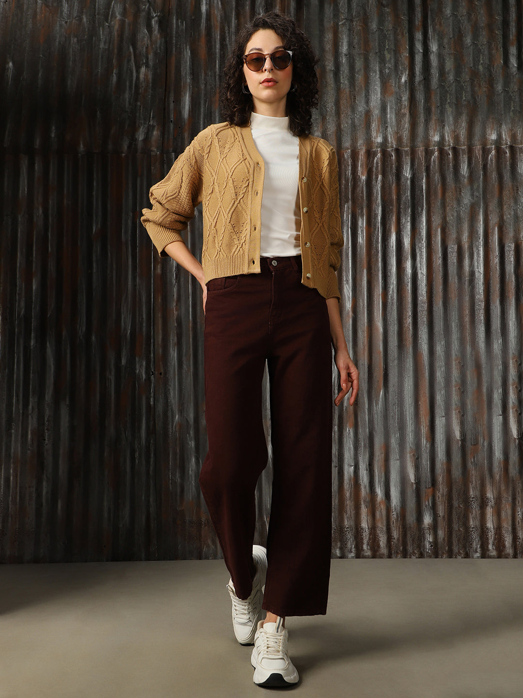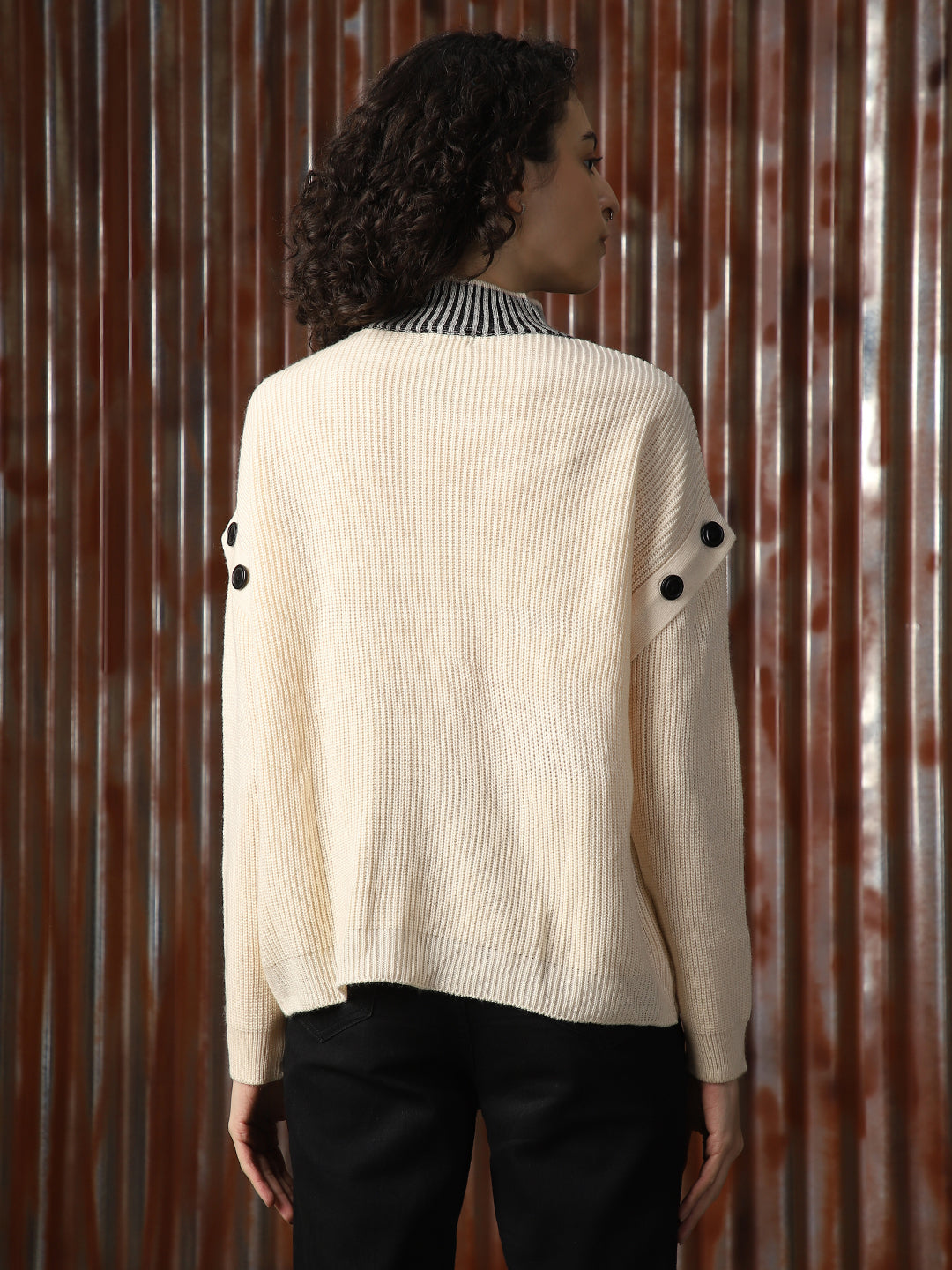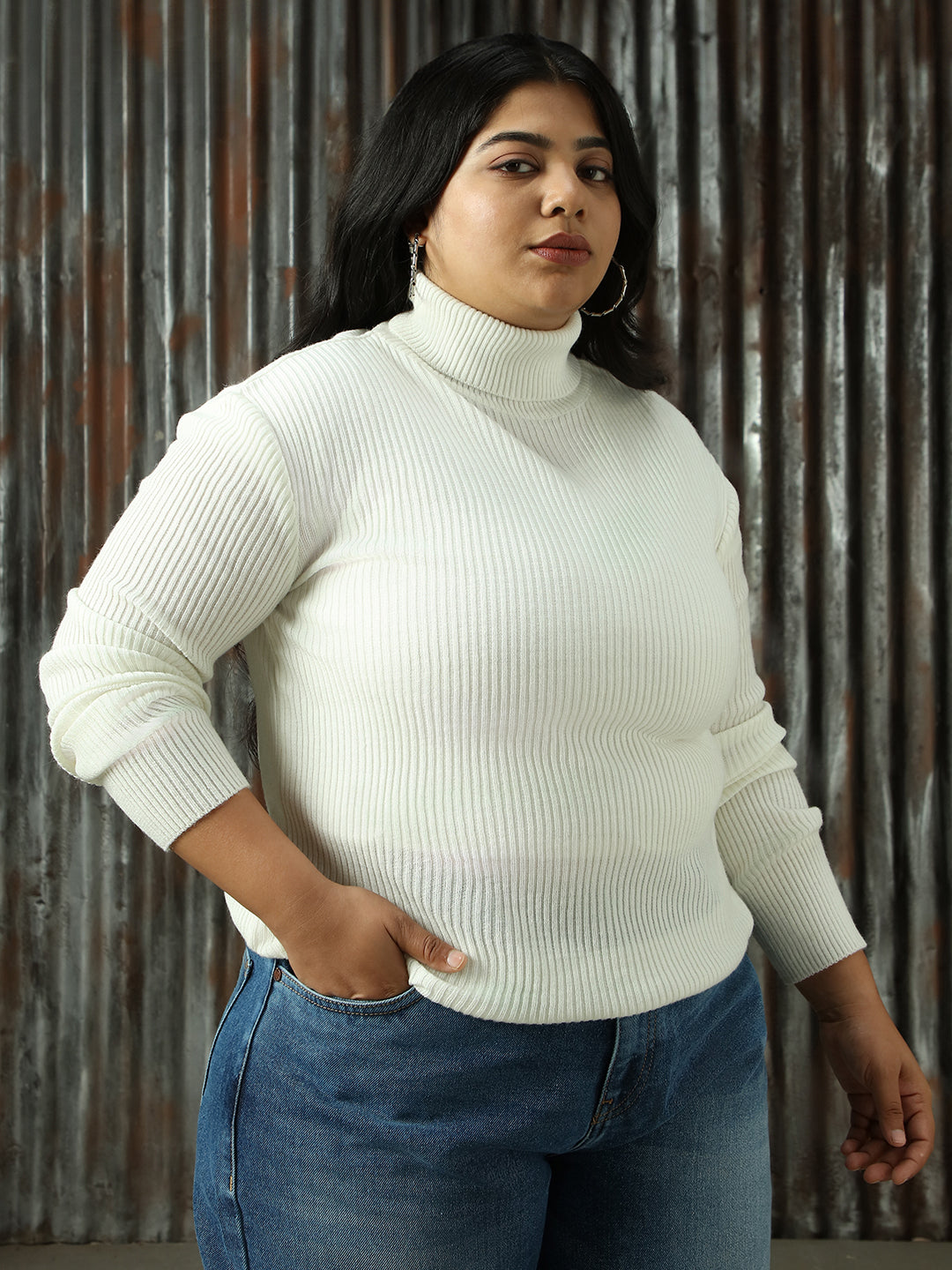 Women Self Design Cabel Knit Crop Oversized Turtle Neck Pullover