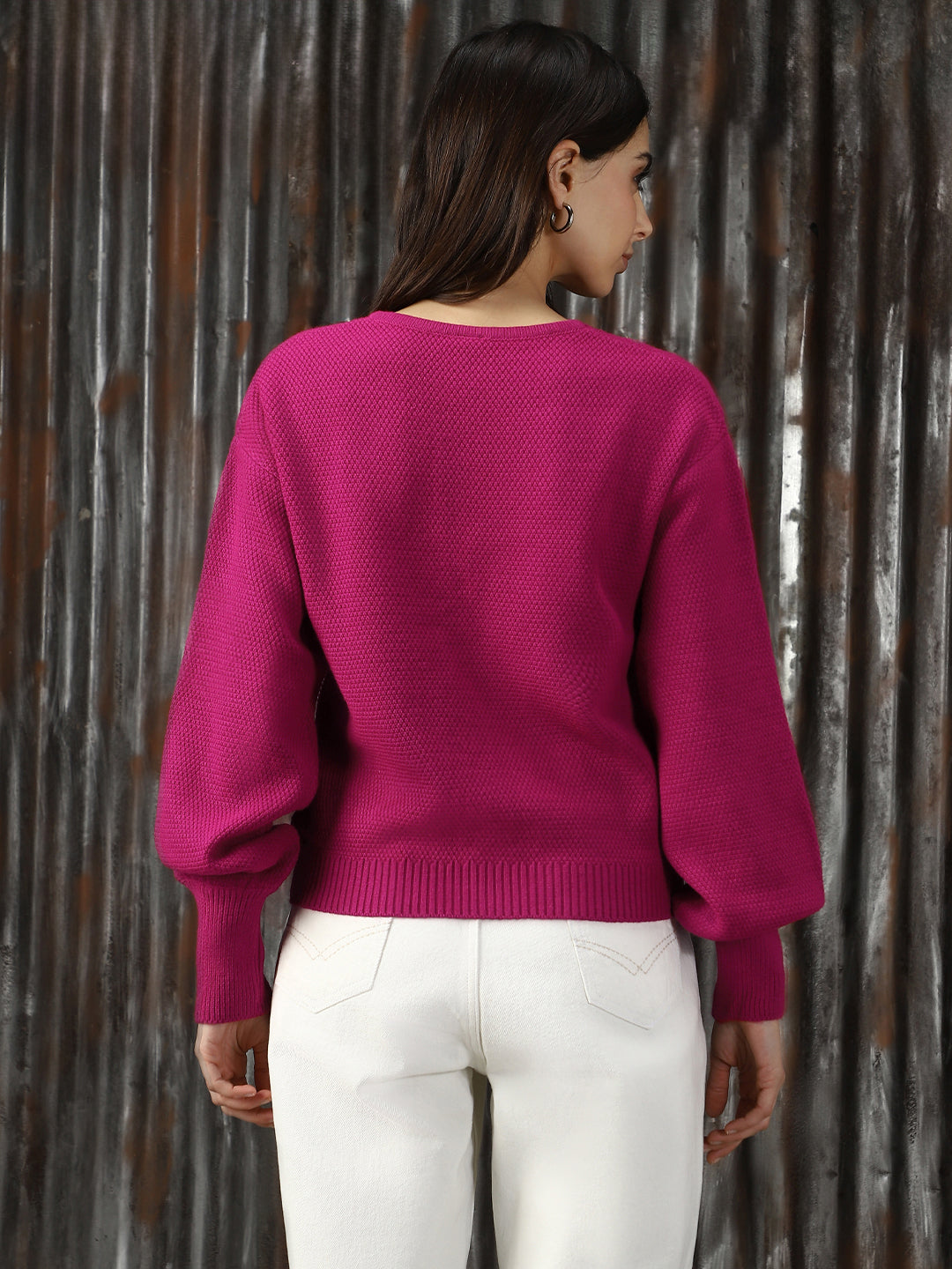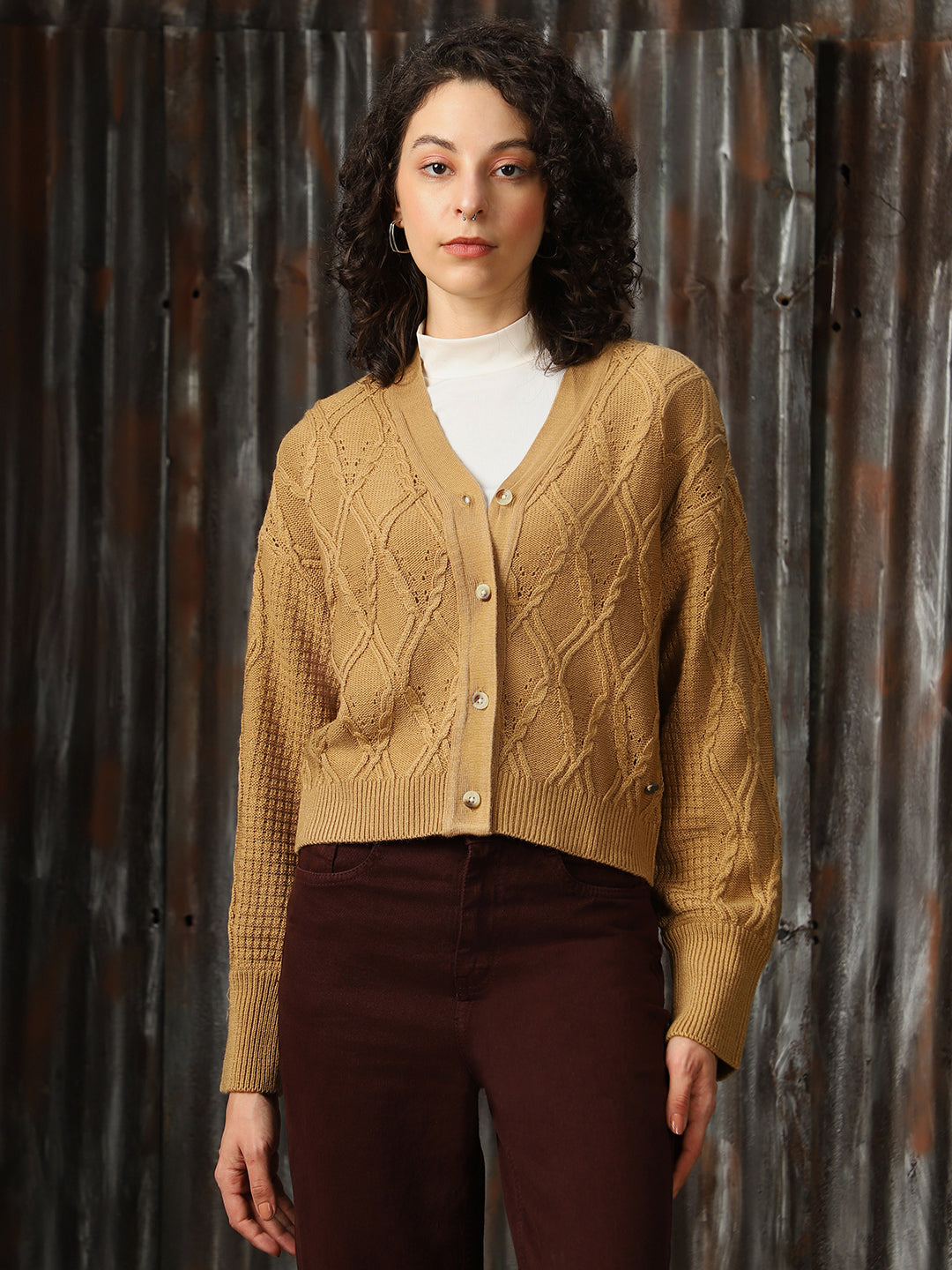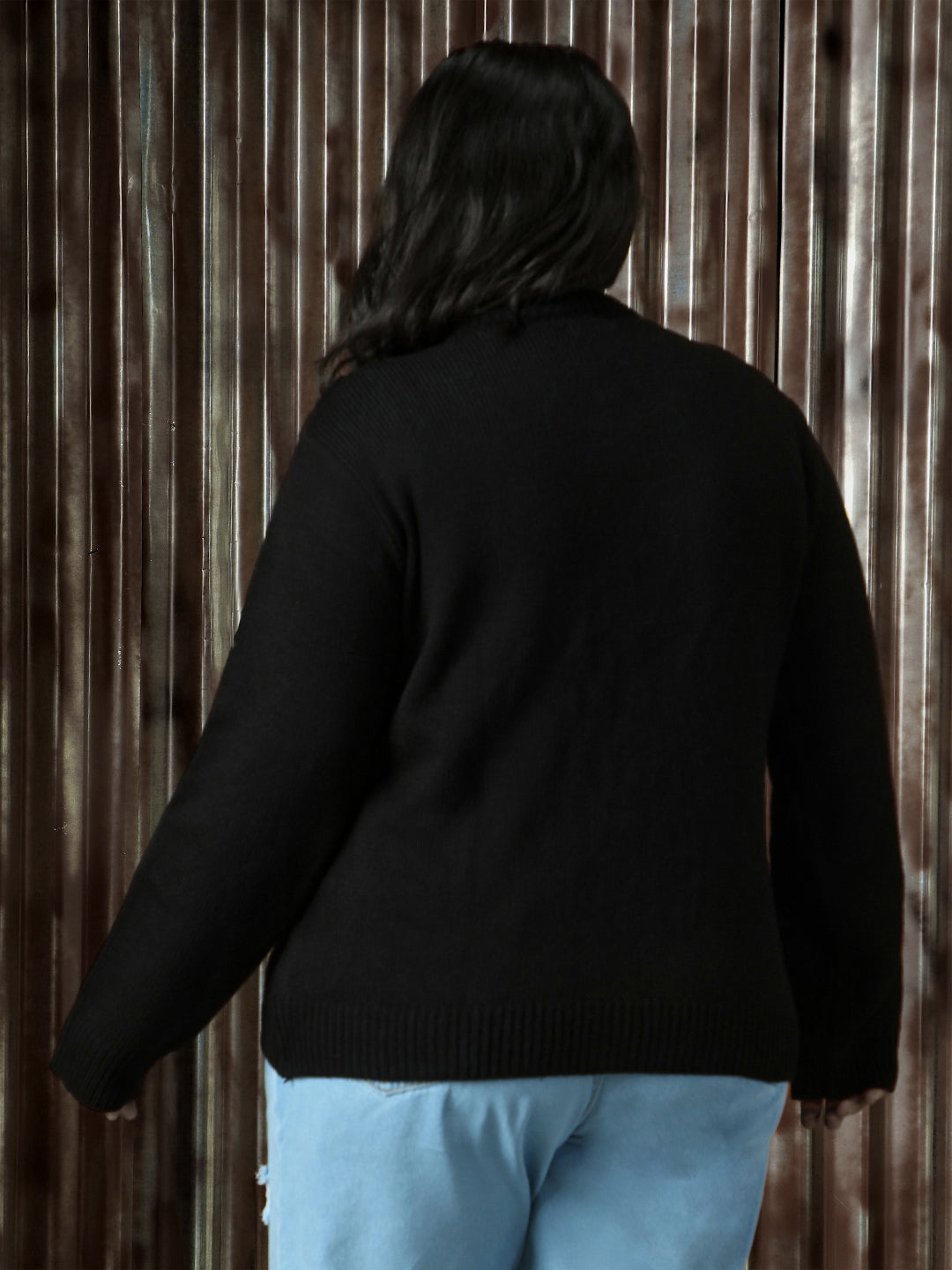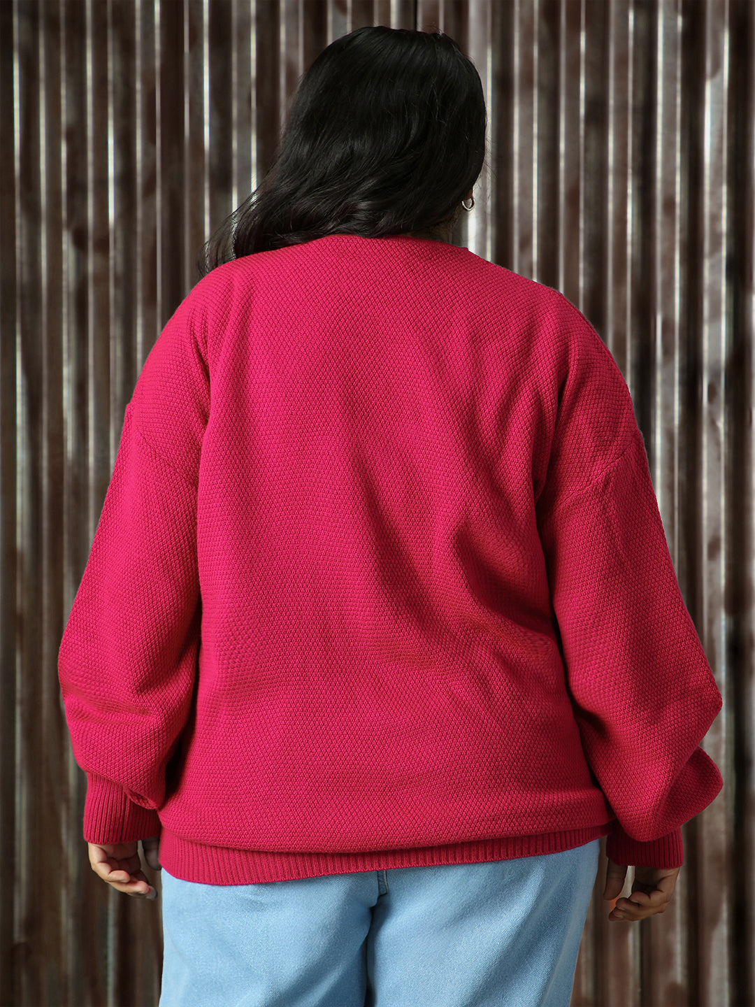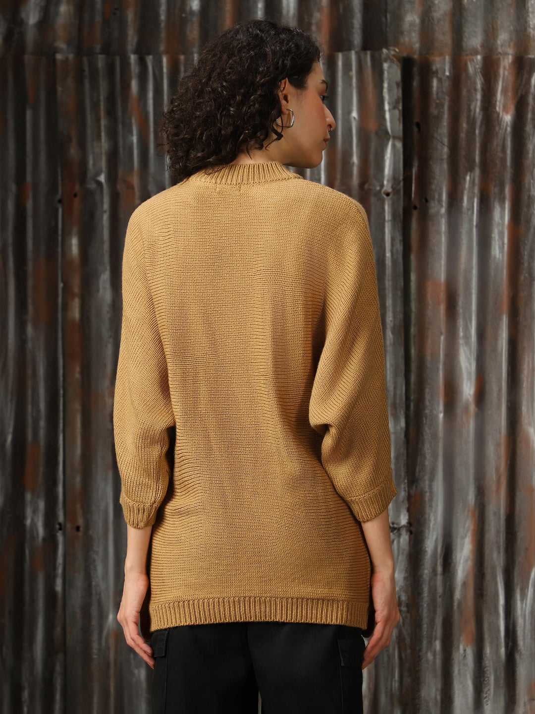 Women Self Design Cabel Knit Crop Oversized Turtle Neck Pullover