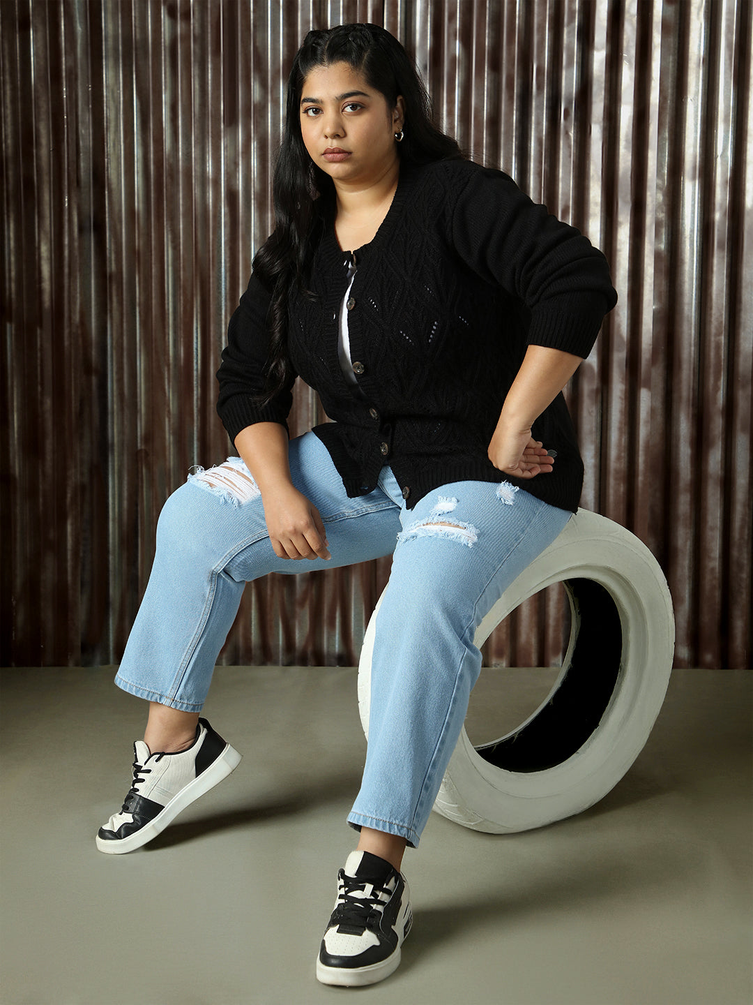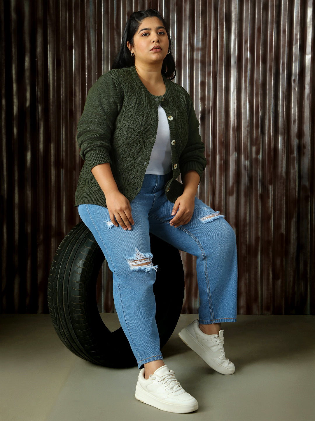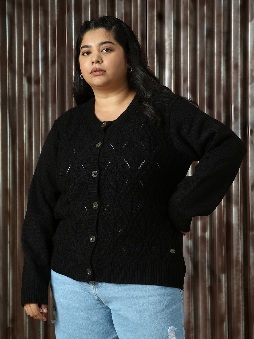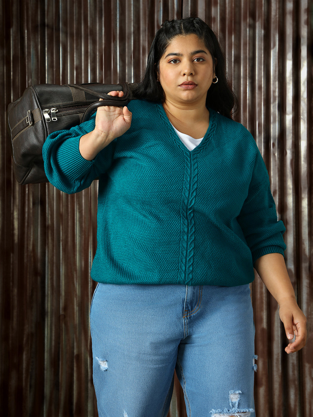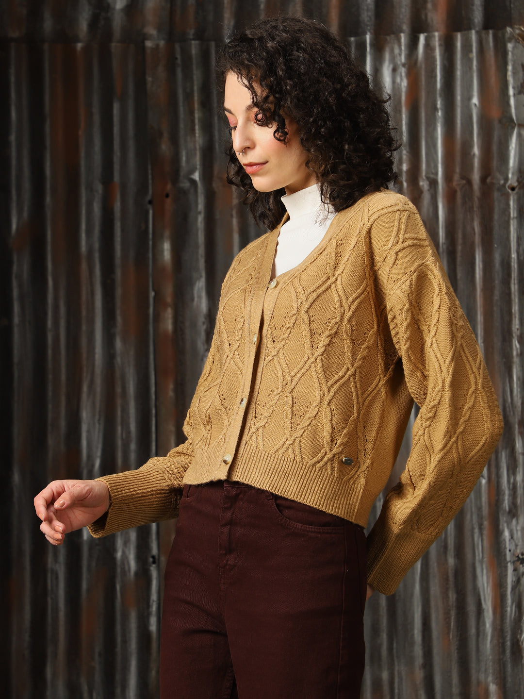 Women Self Design Cabel Knit Crop Oversized Turtle Neck Pullover