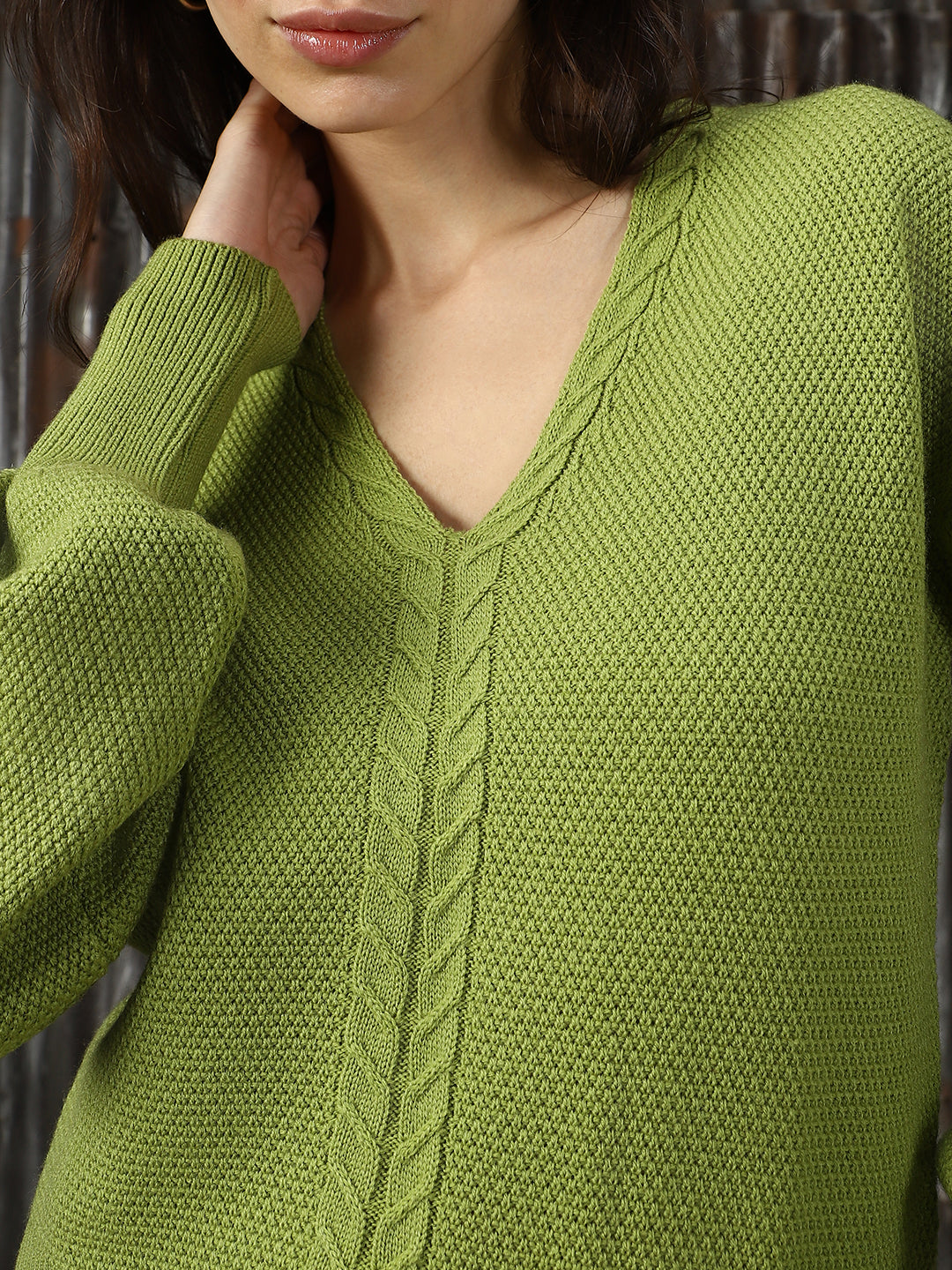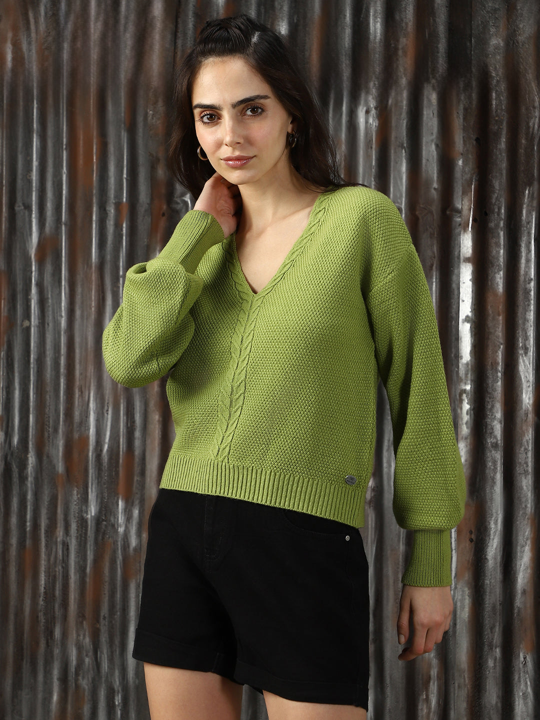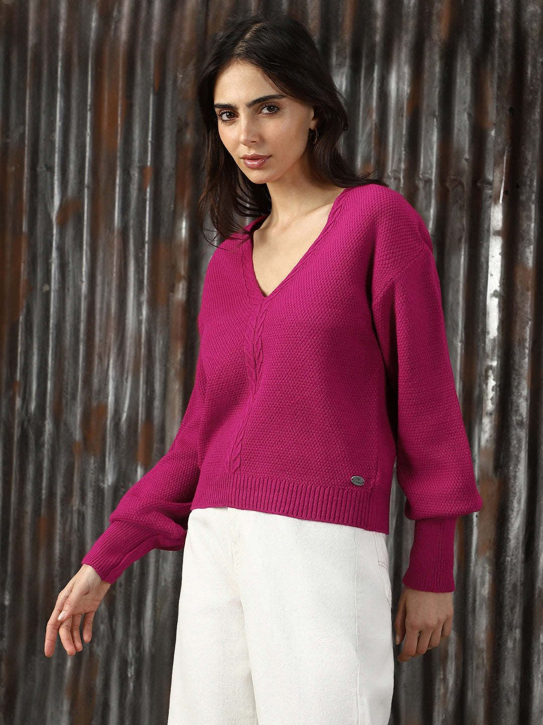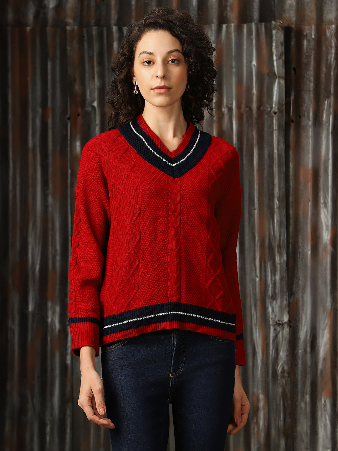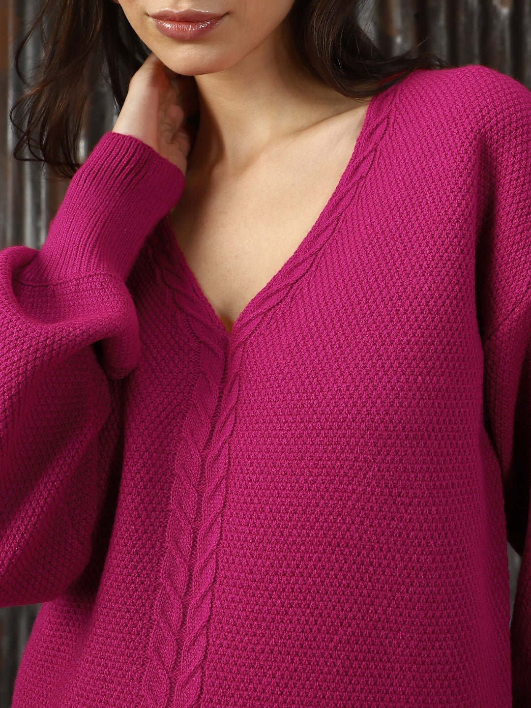 Women Cable Knit V-neck Cuffed Sleeves Pullover Sweaters