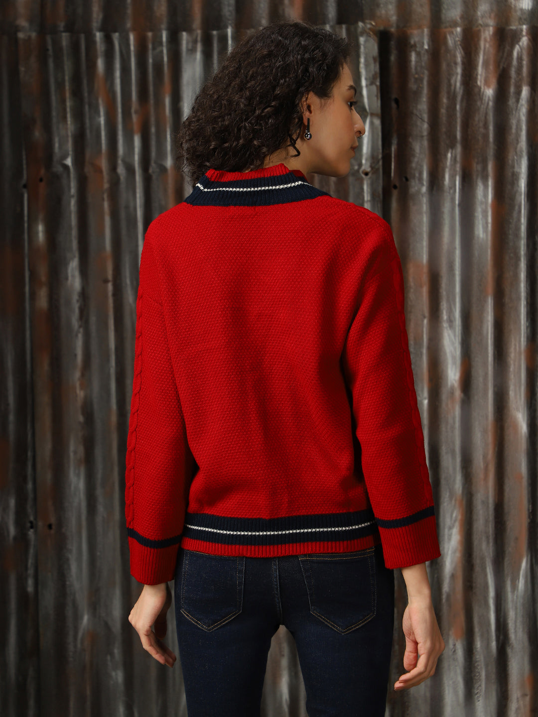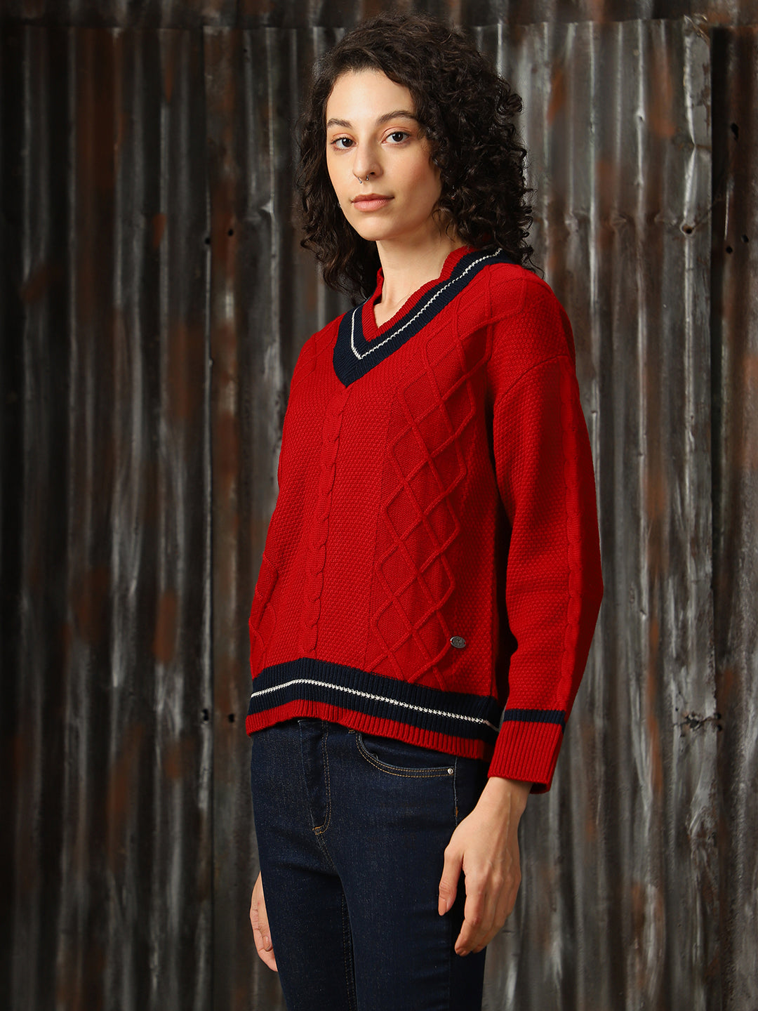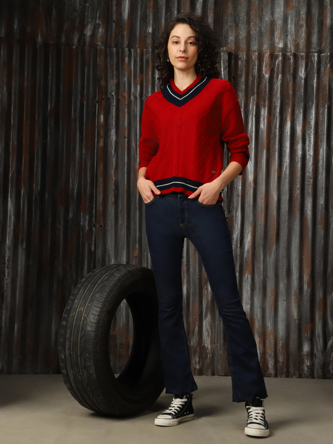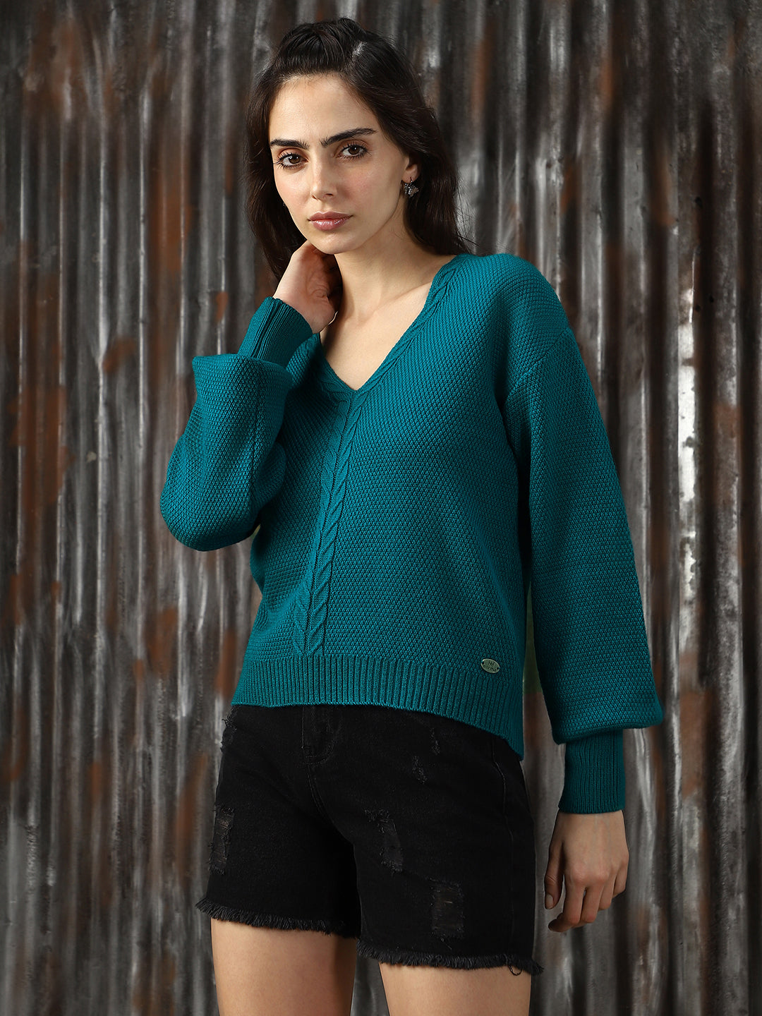 Women Cable Knit V-neck Cuffed Sleeves Pullover Sweaters