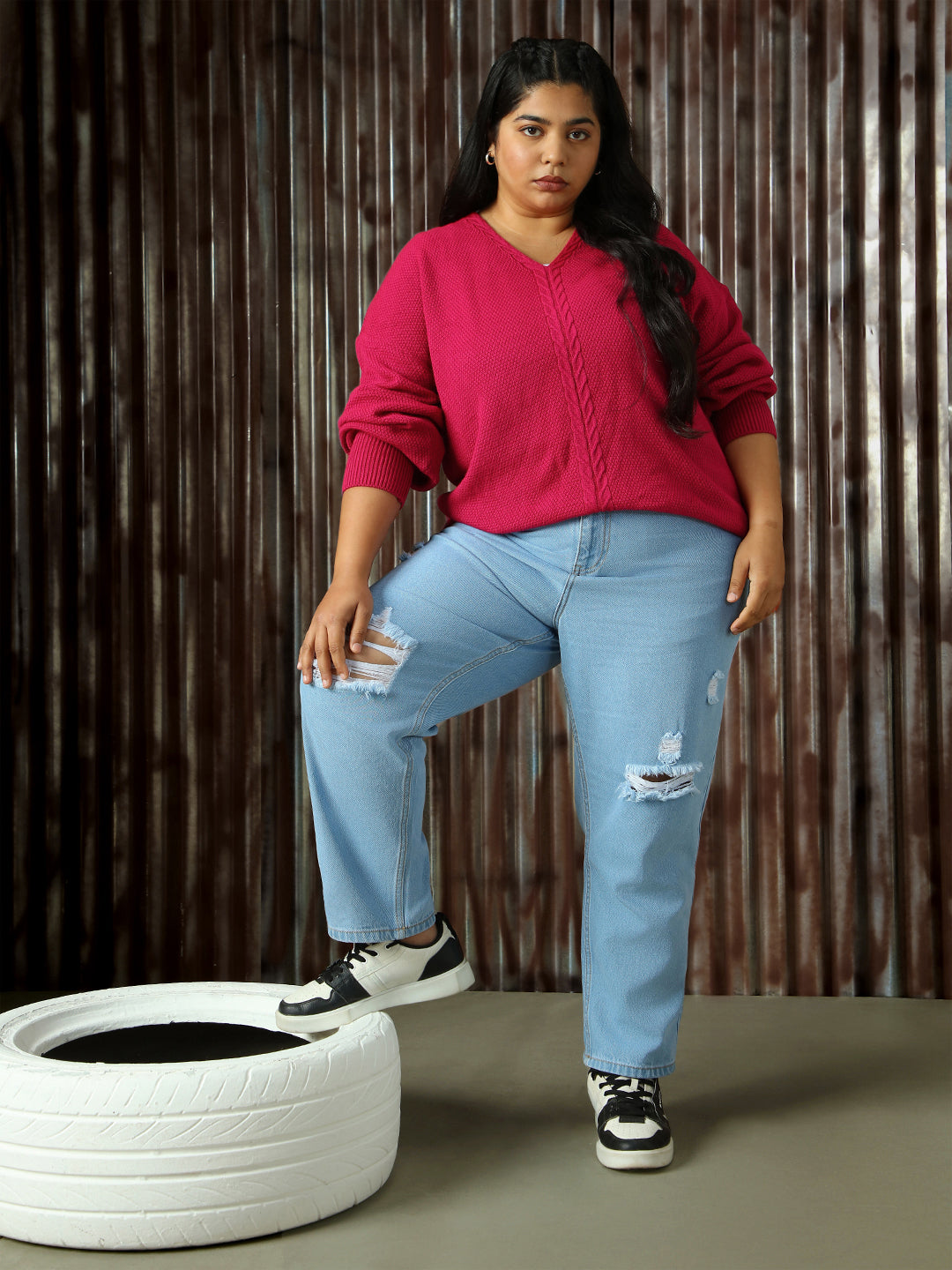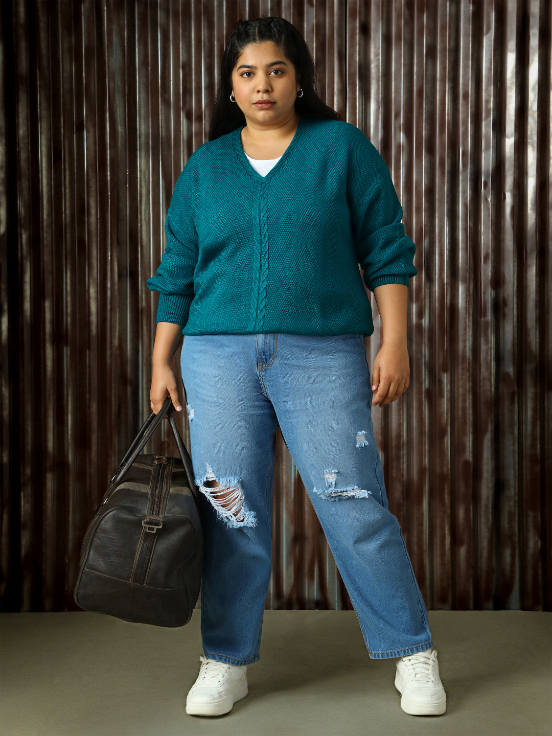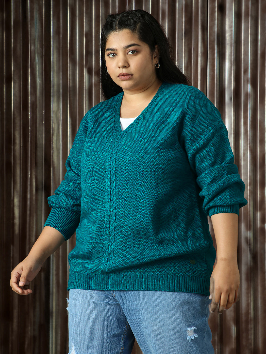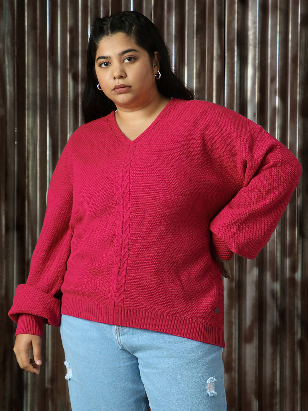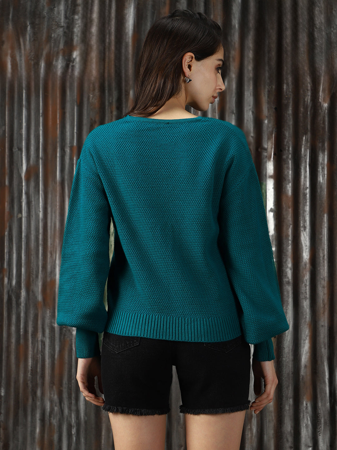 Women Cable Knit V-neck Cuffed Sleeves Pullover Sweaters