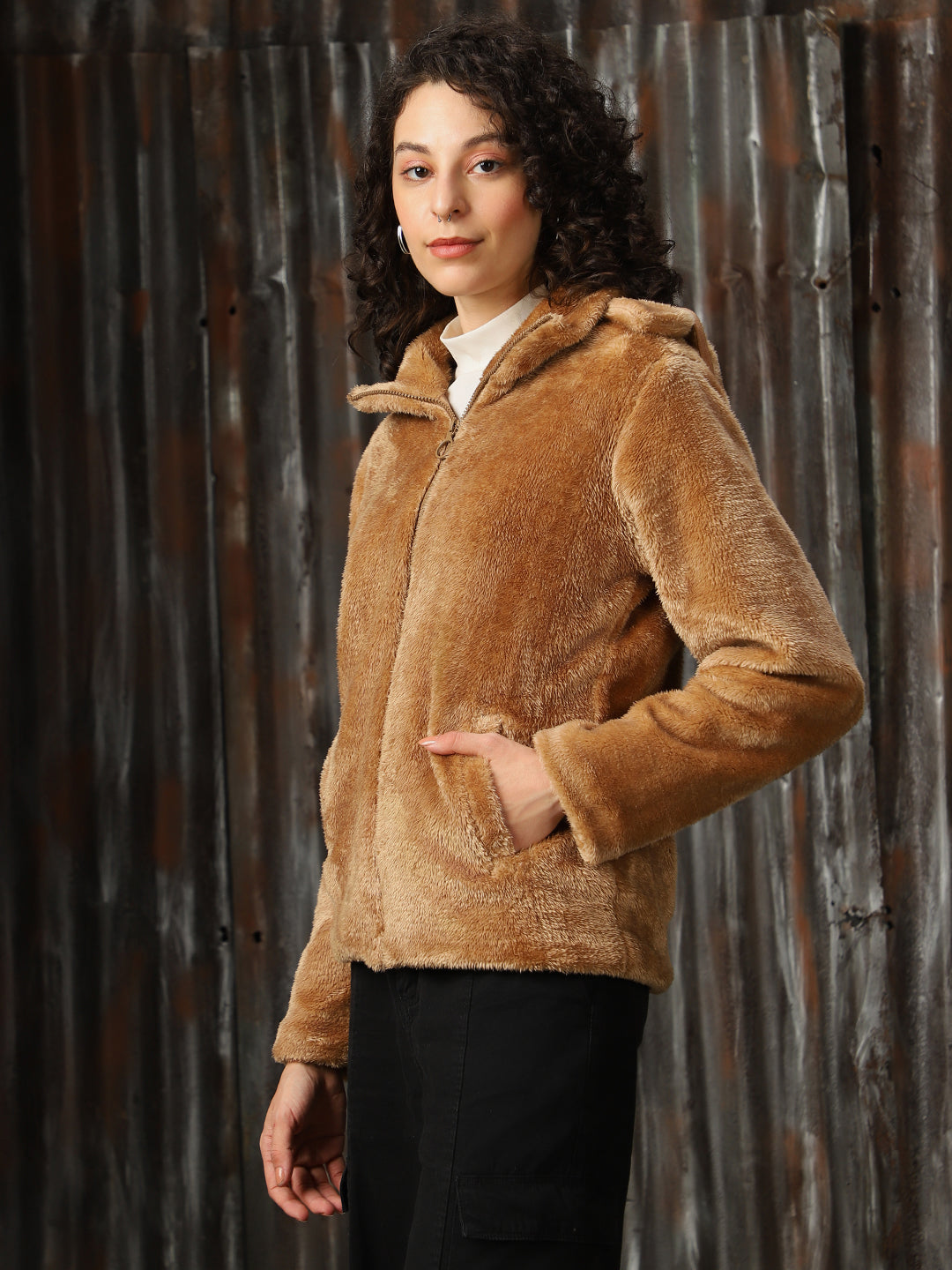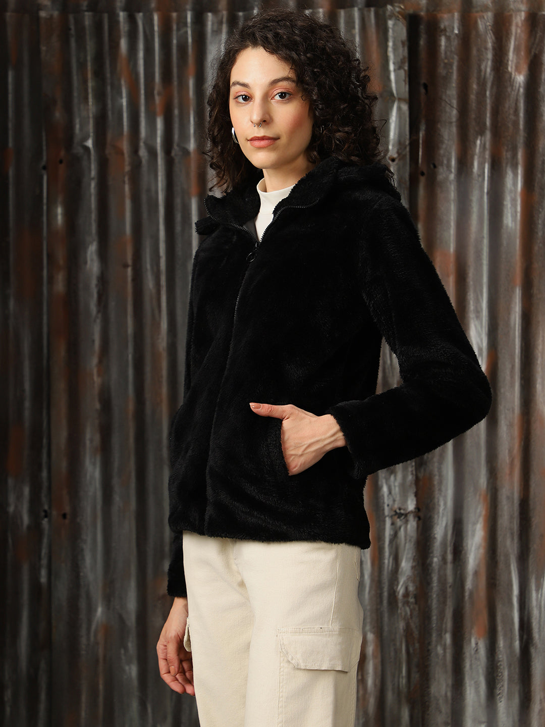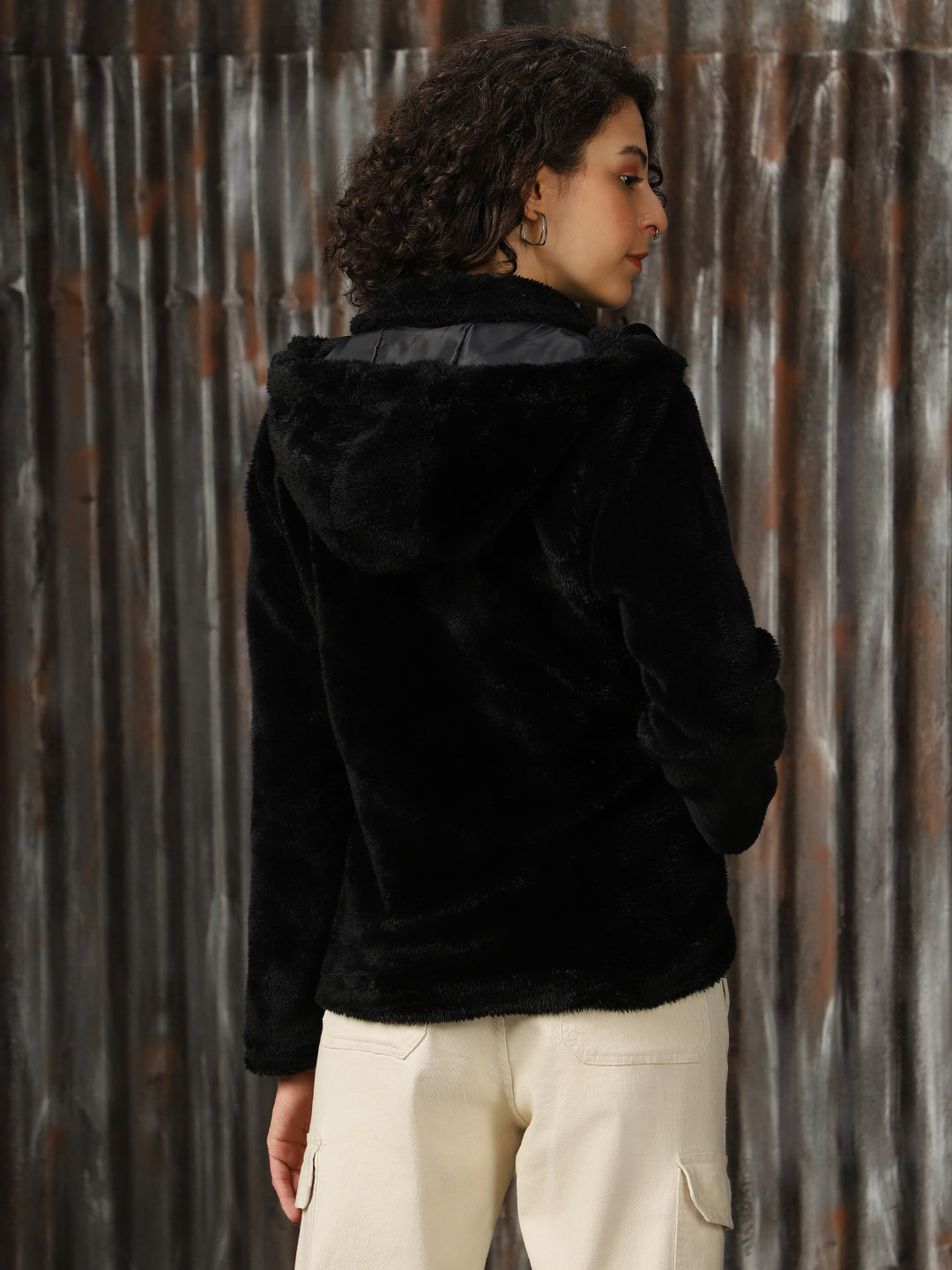 Women Hooded Solid Faux Fur Casual Tailored Jacket