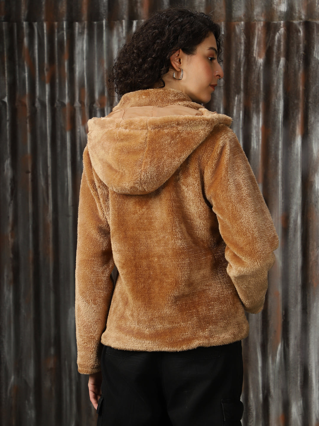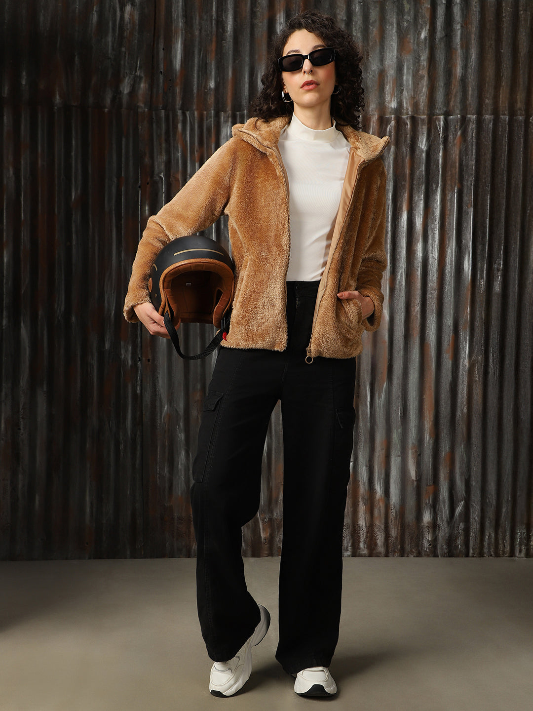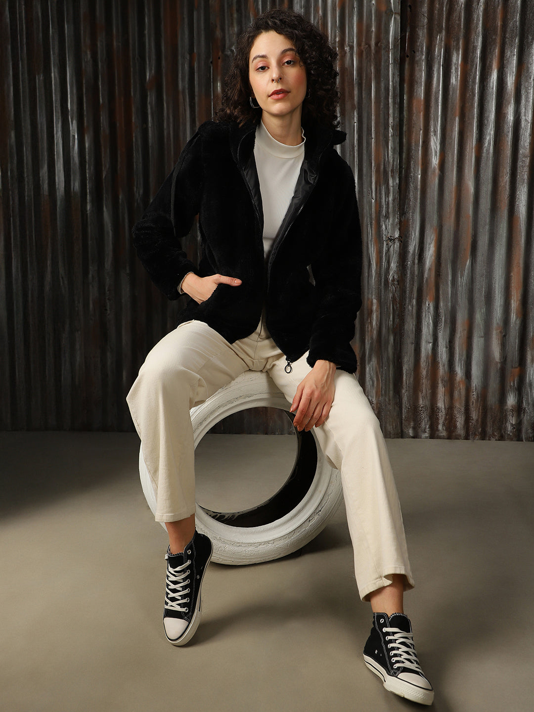 Women Hooded Solid Faux Fur Casual Bomber Jacket