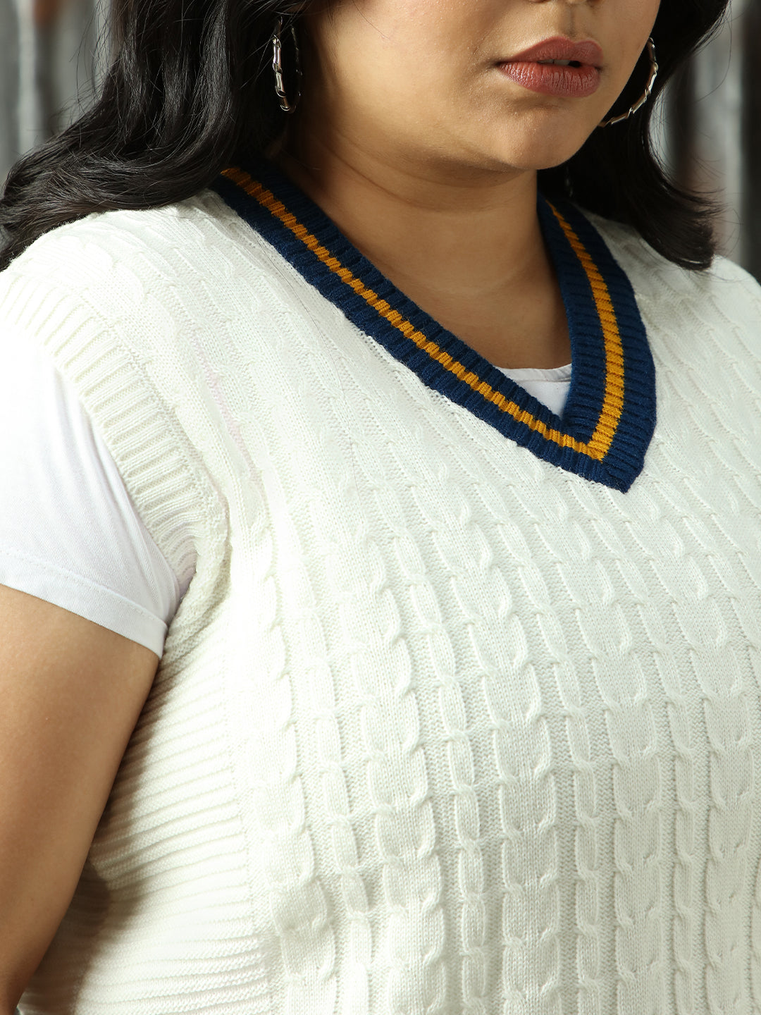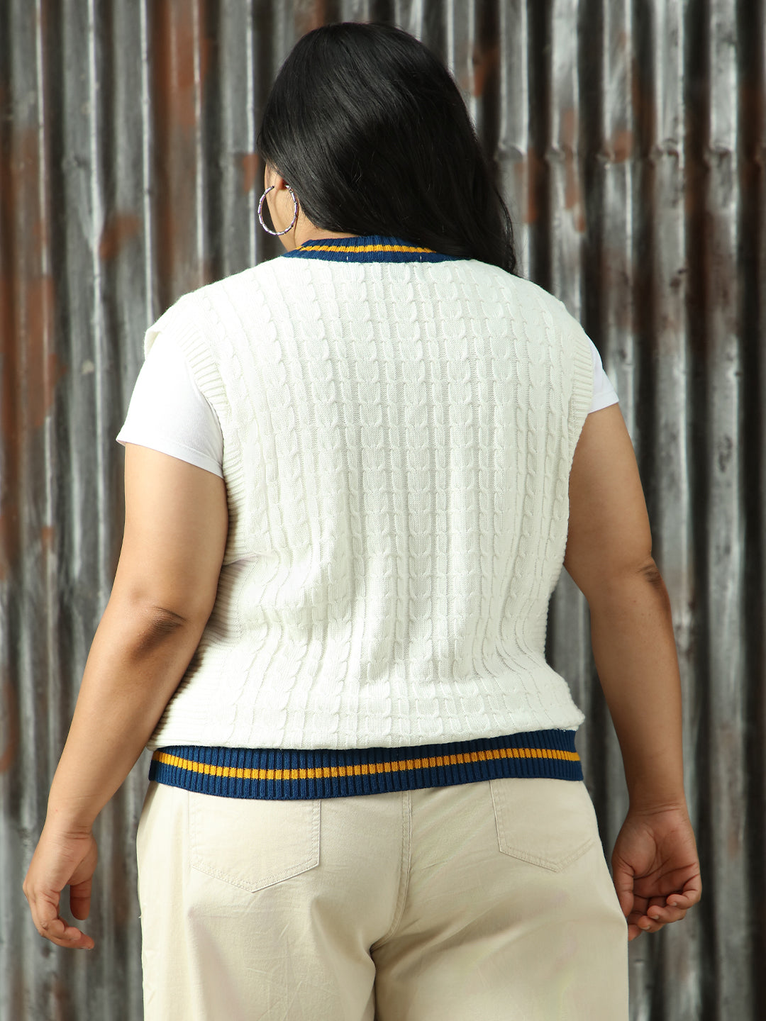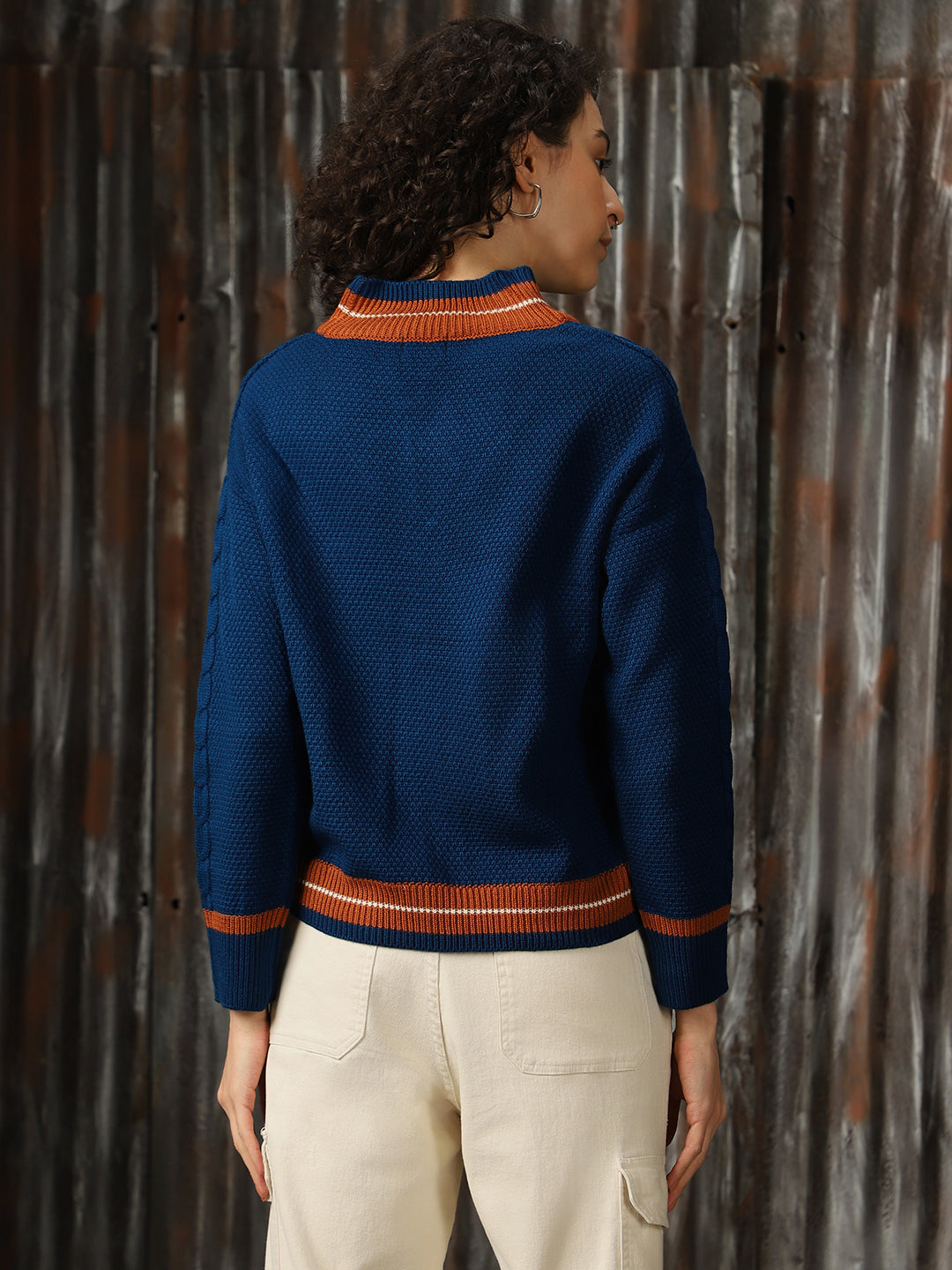 Women Longline Cabel knit Varsity V Neck Pullover