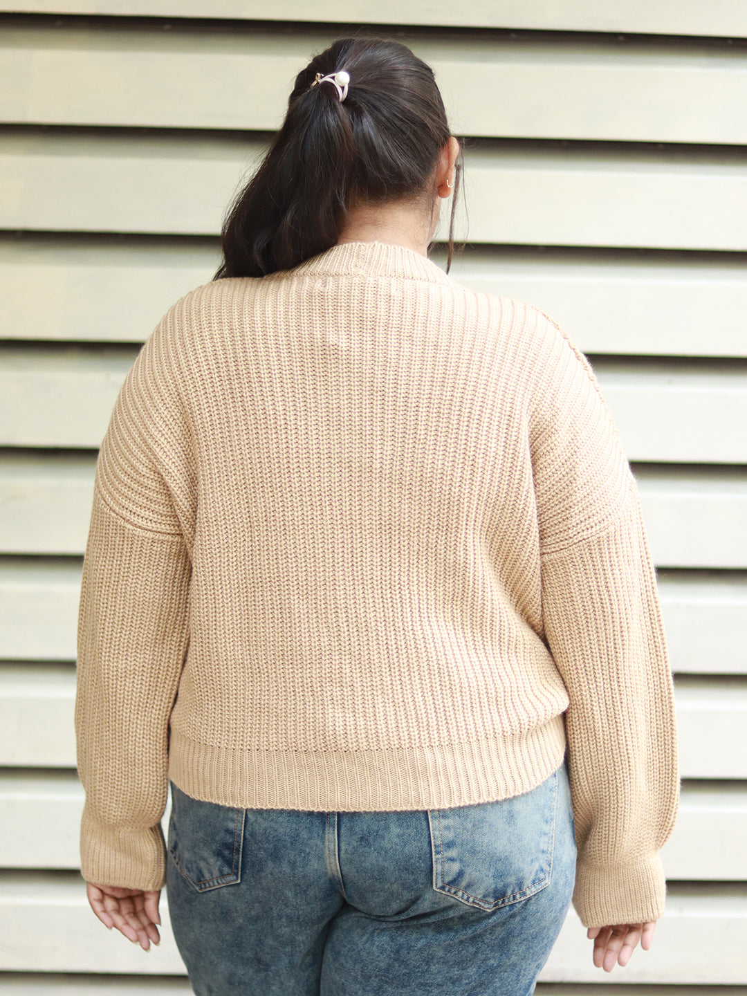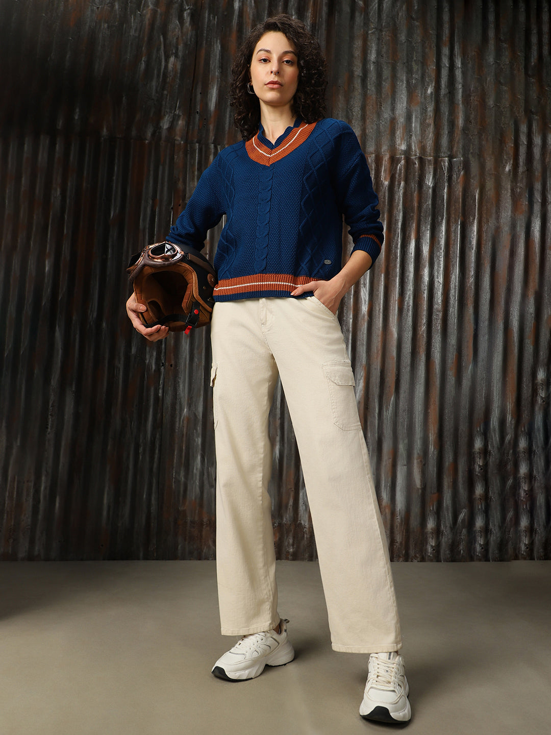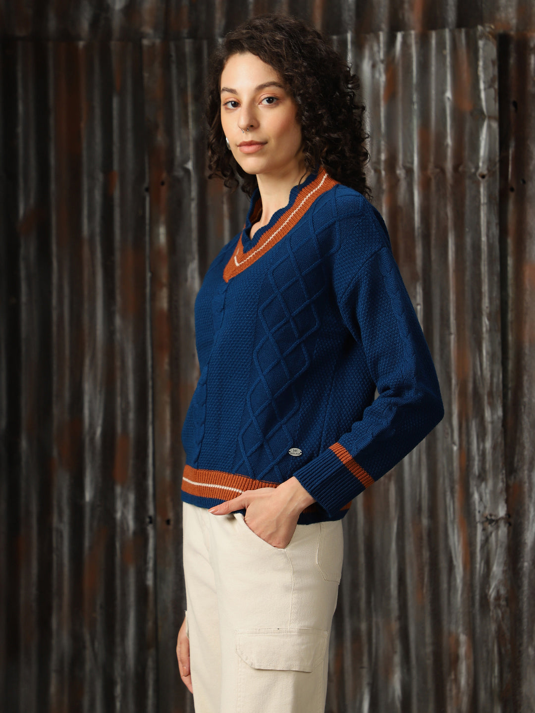 Women Longline Cabel knit Varsity V Neck Pullover