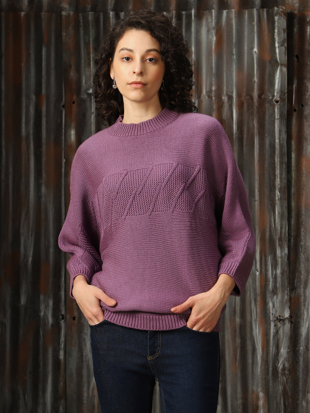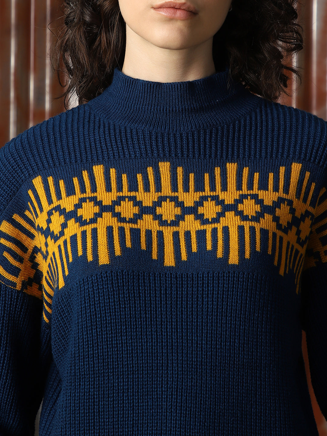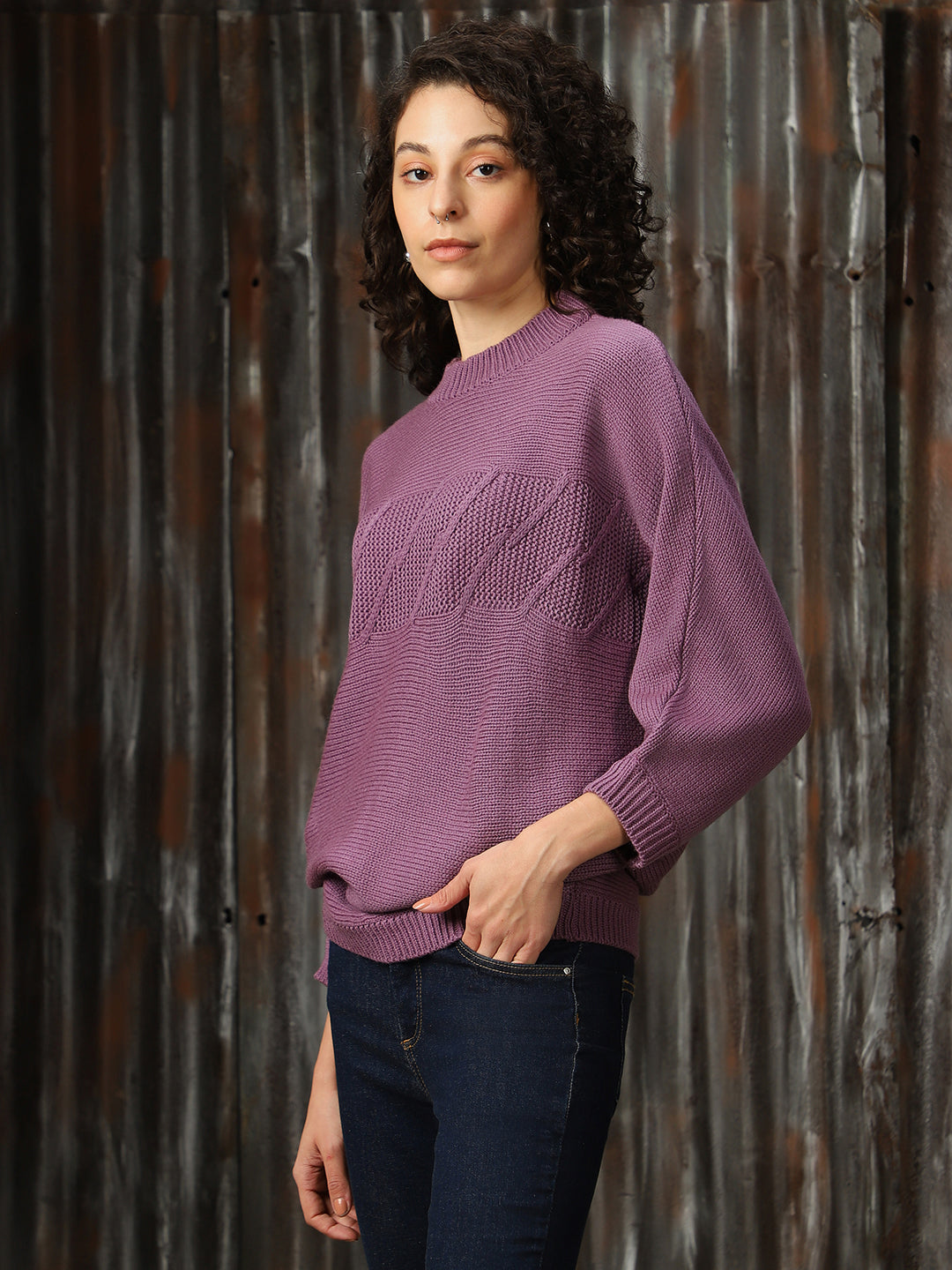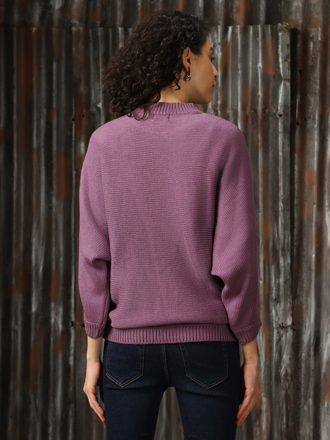 Women Self Design Ribbed High Neck Relaxed Fit Pullover