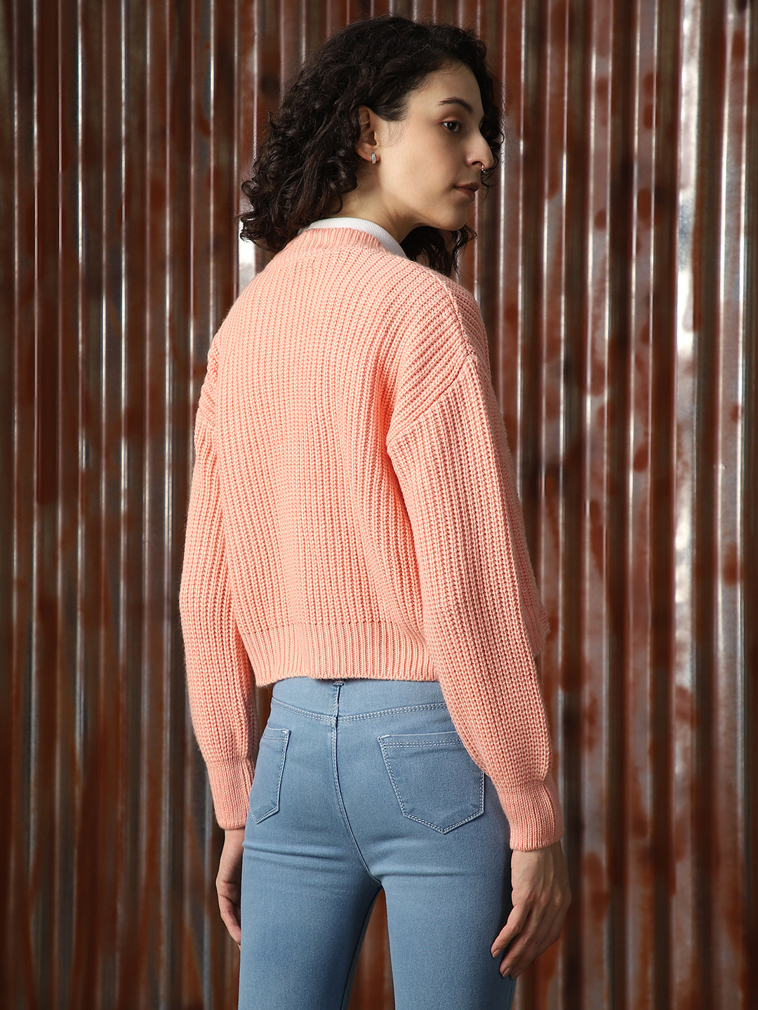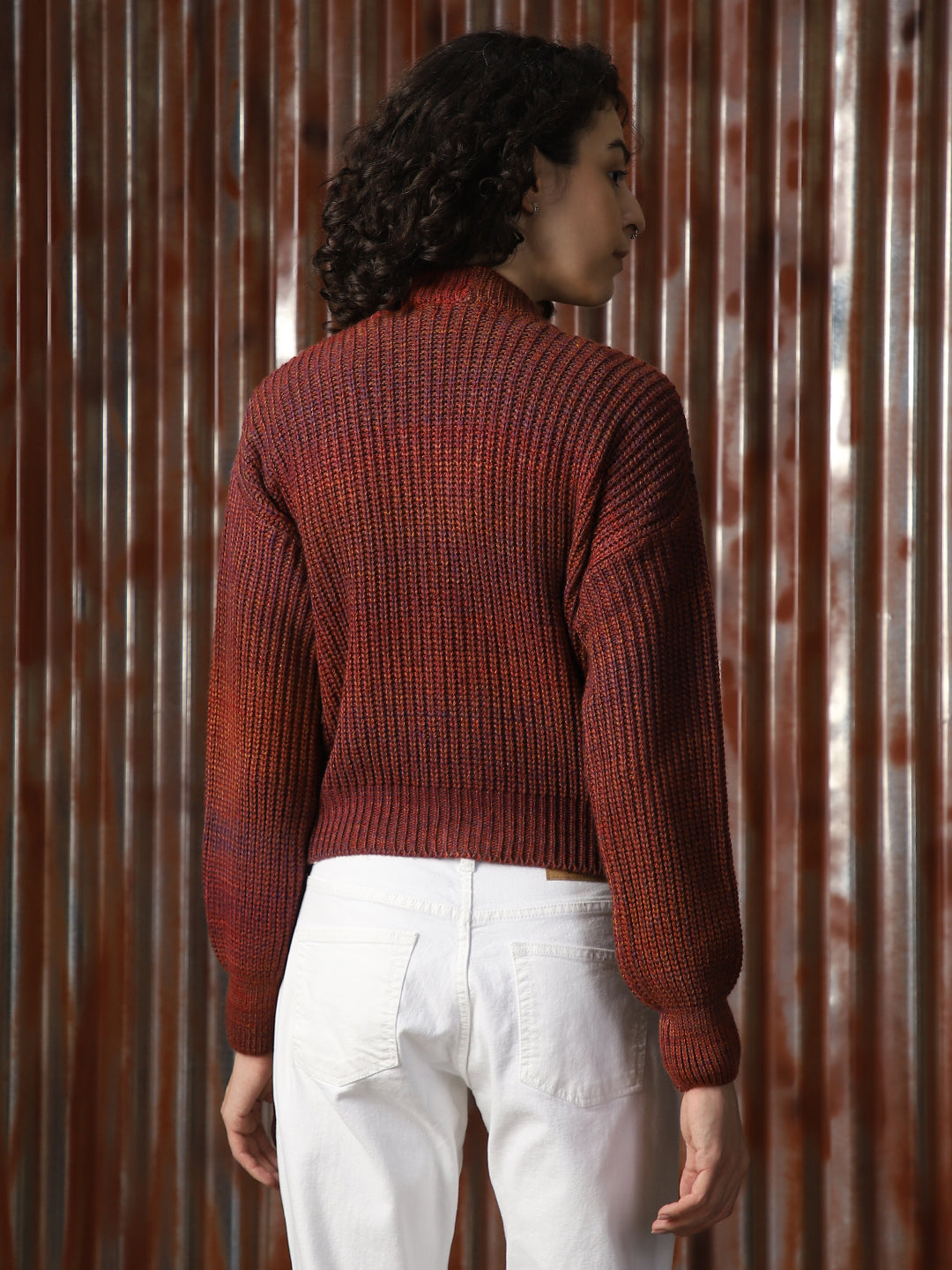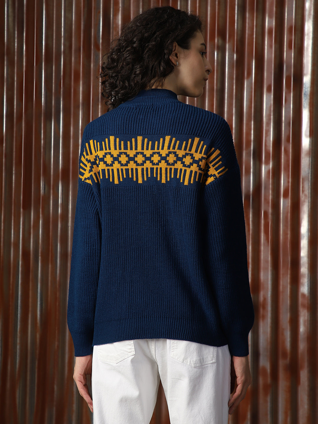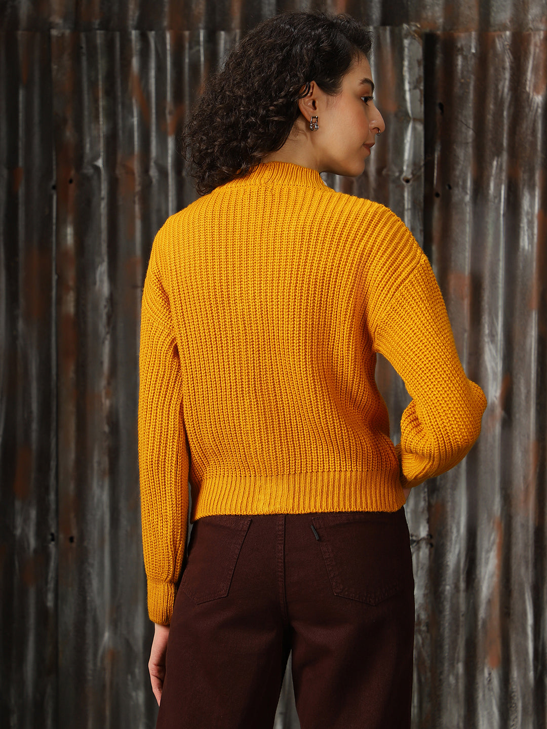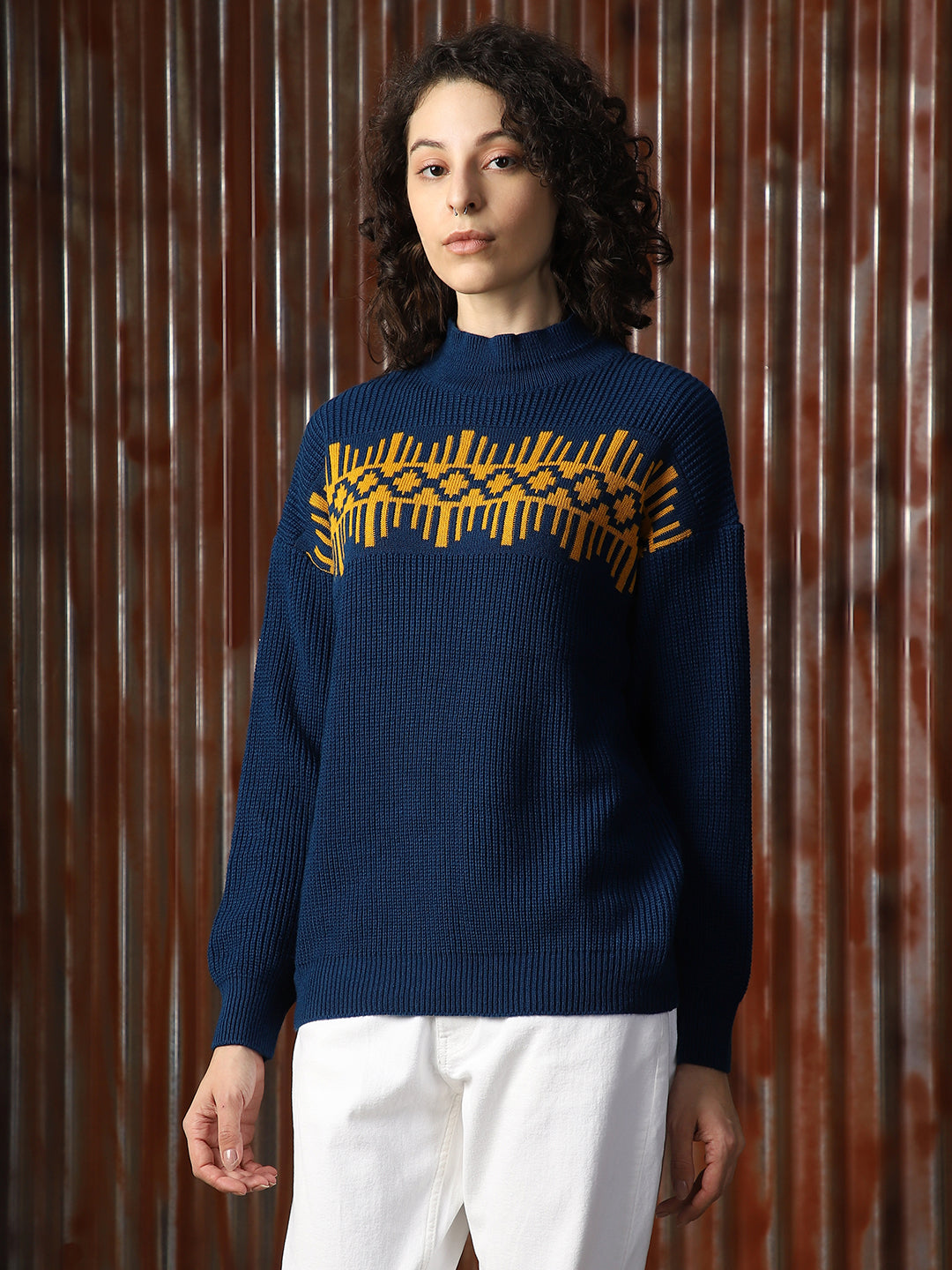 Women Self Design Ribbed High Neck Relaxed Fit Pullover