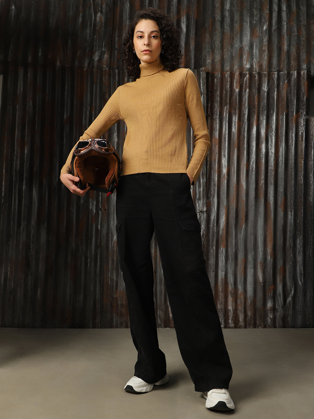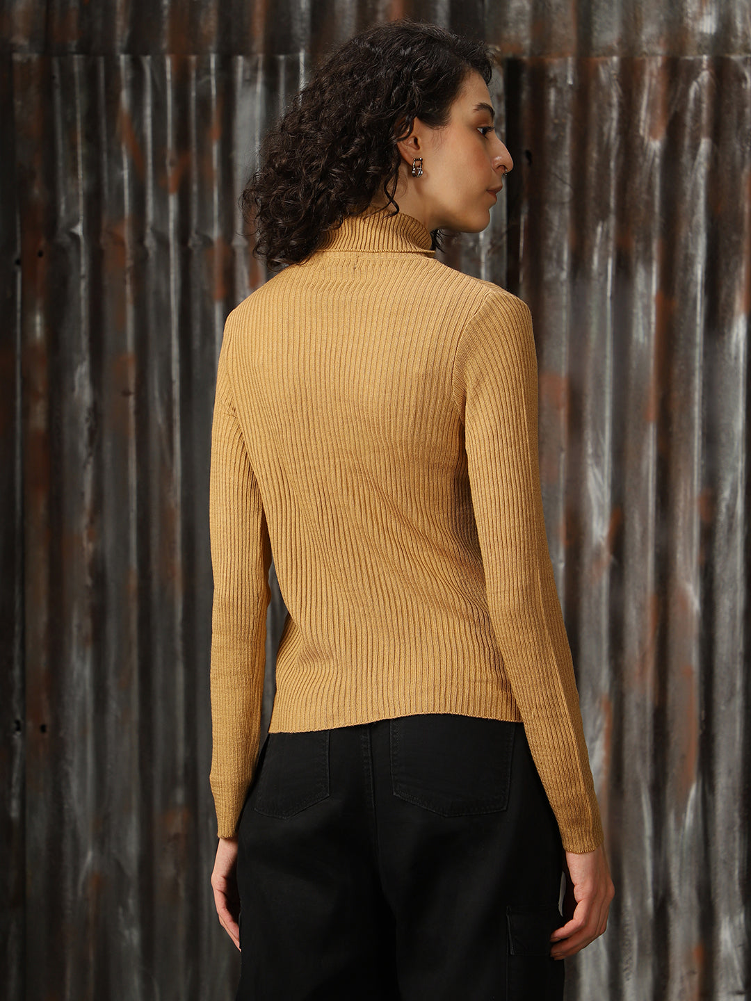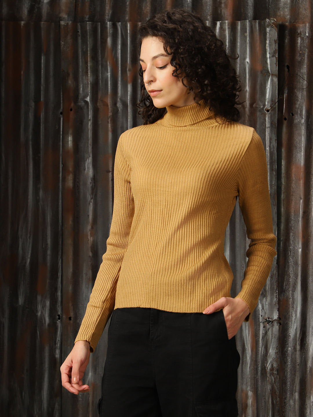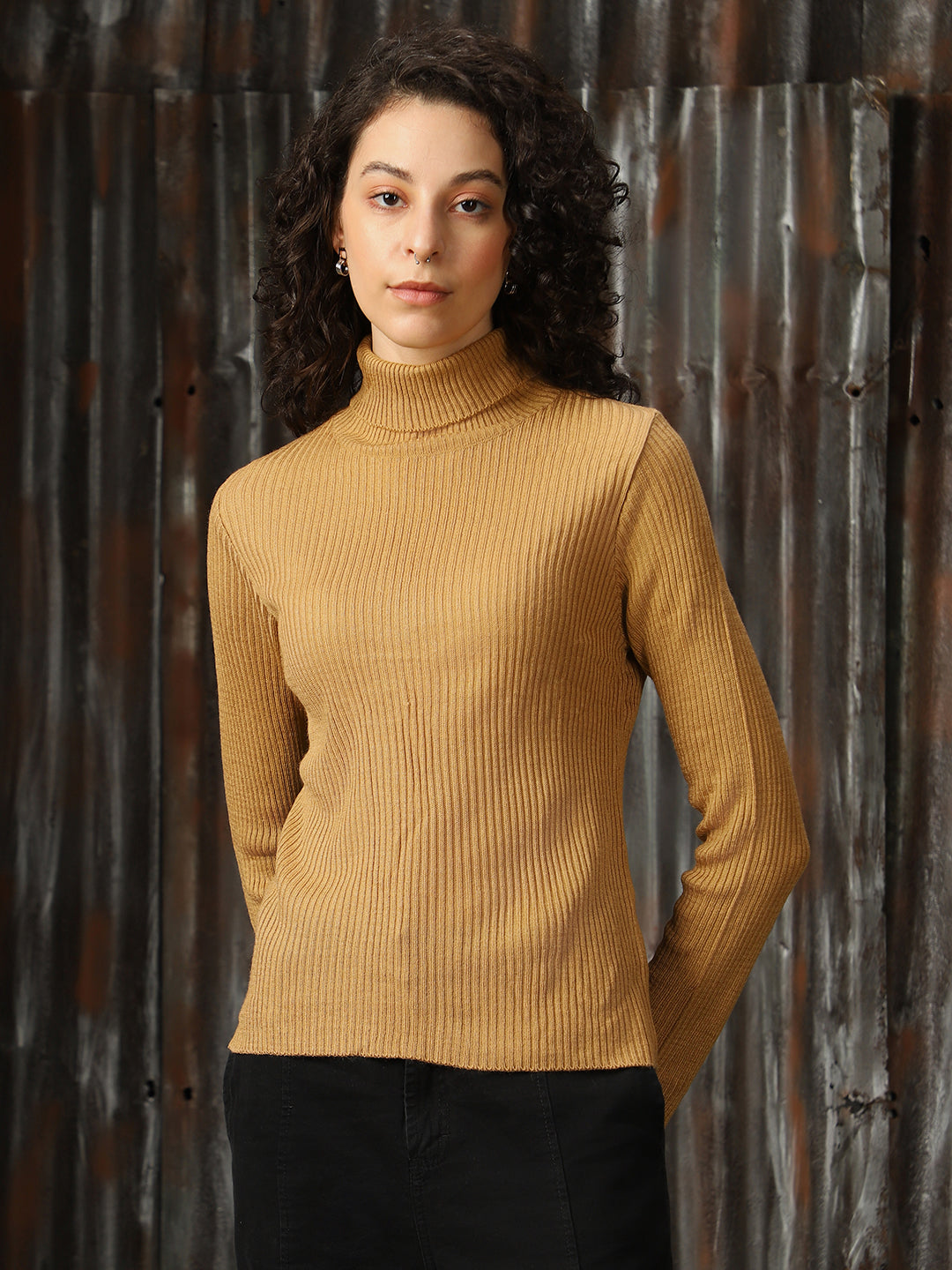 Women Turtle Neck Solid Ribbed Pullover