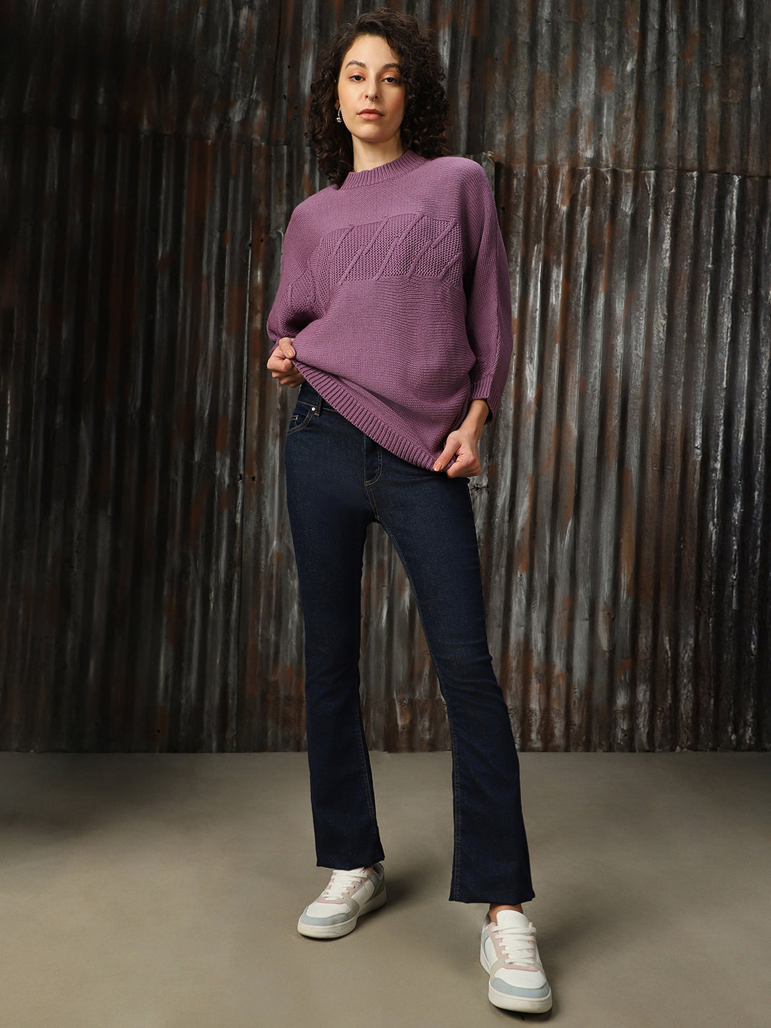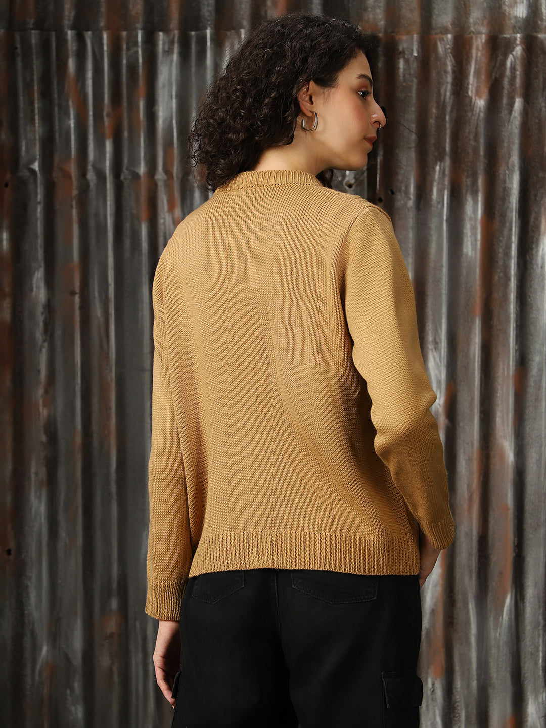 Women Solid Round Neck Full Sleeves Crochet Sweater