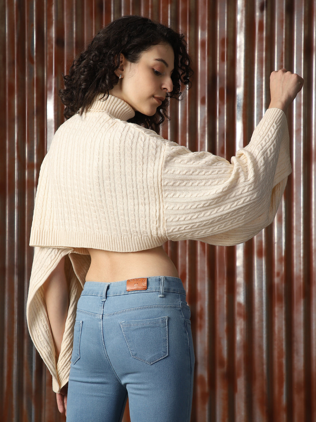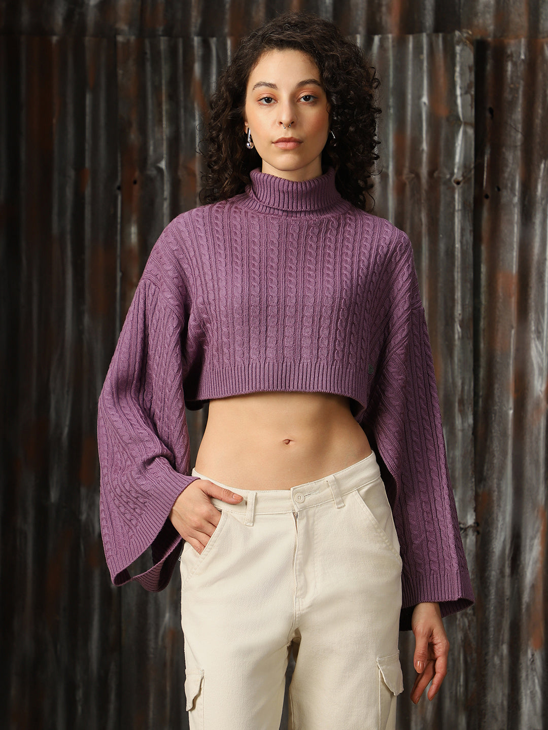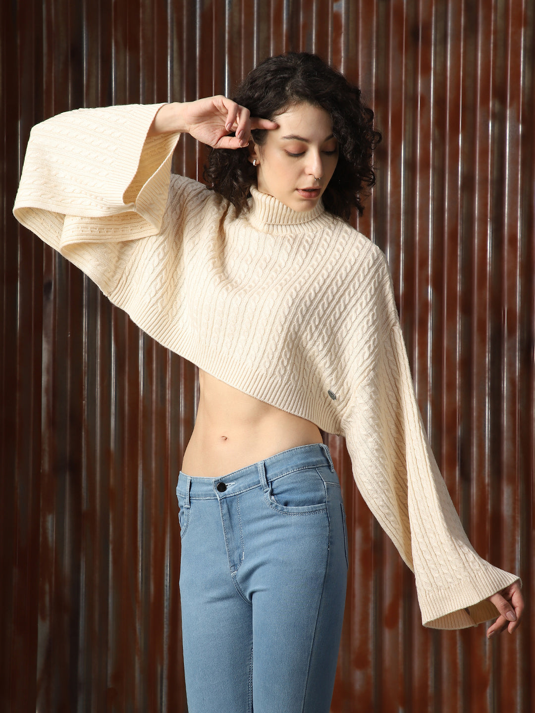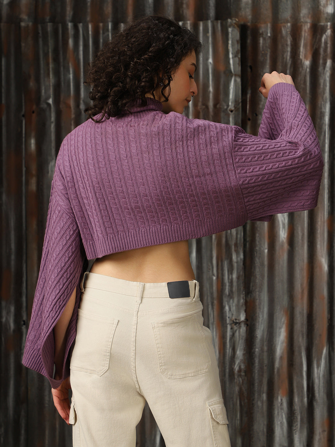 Women Cabel Knit Crop Oversized Fit Loose Sleeve Turtle Neck Pullover