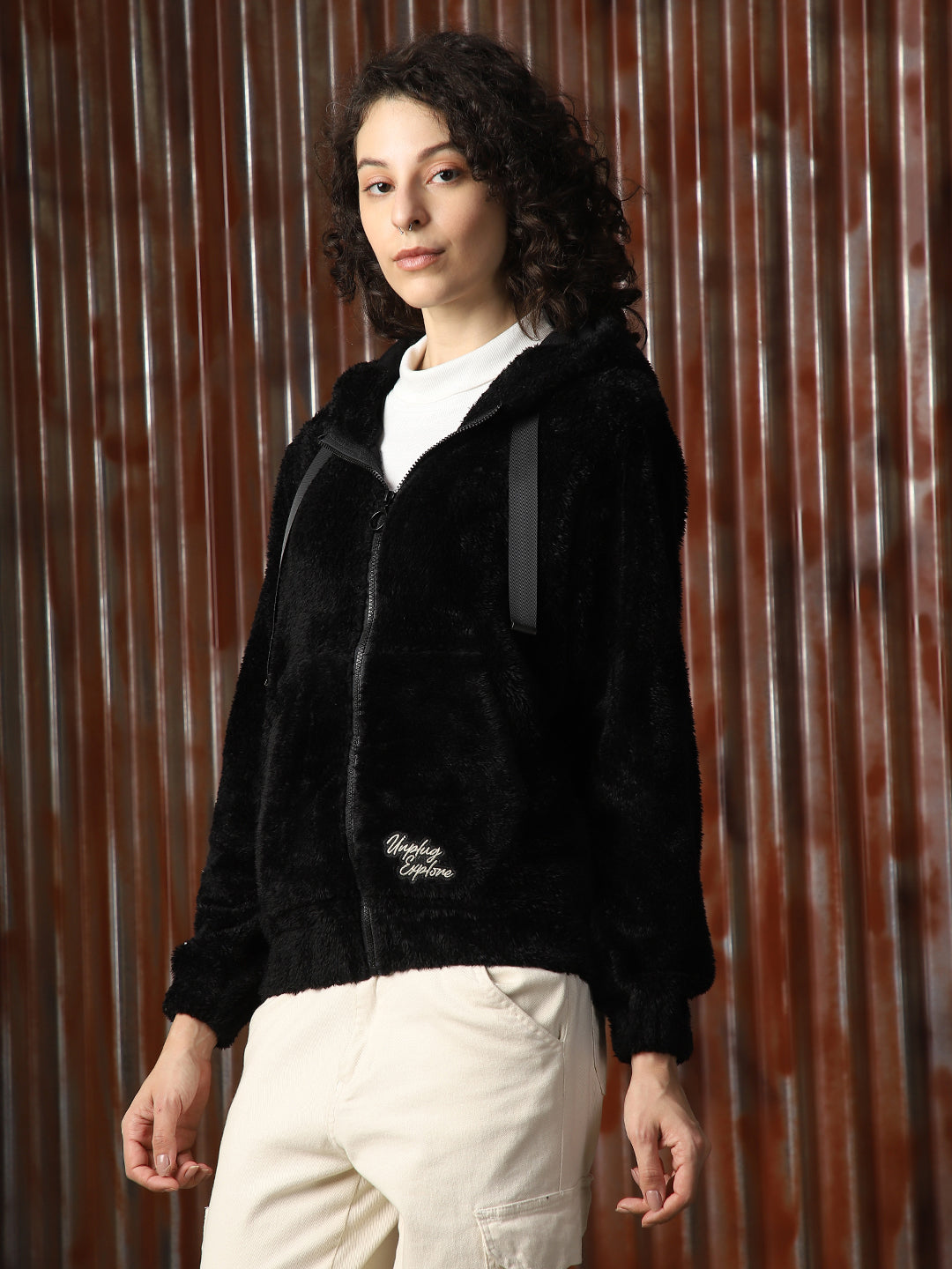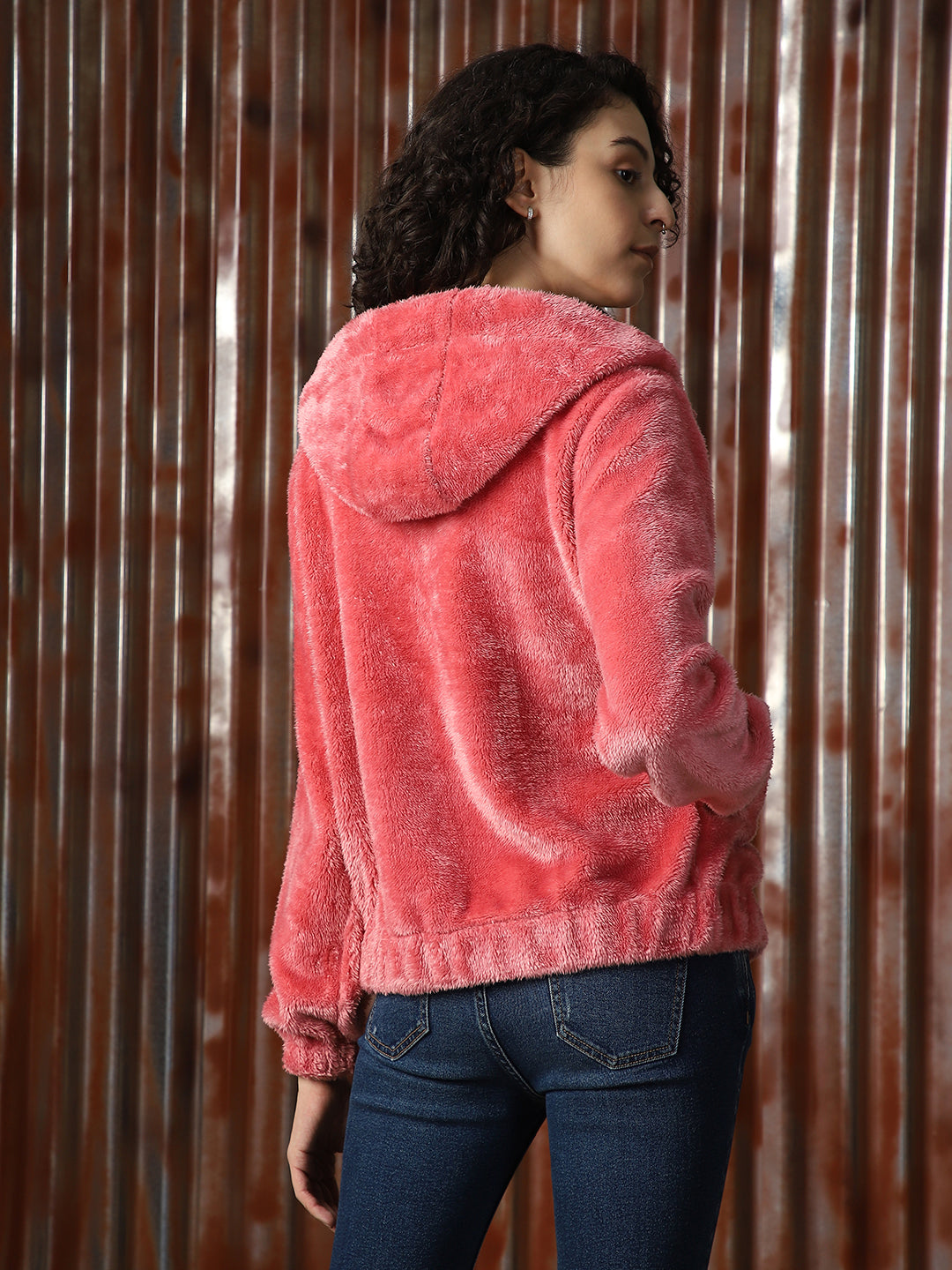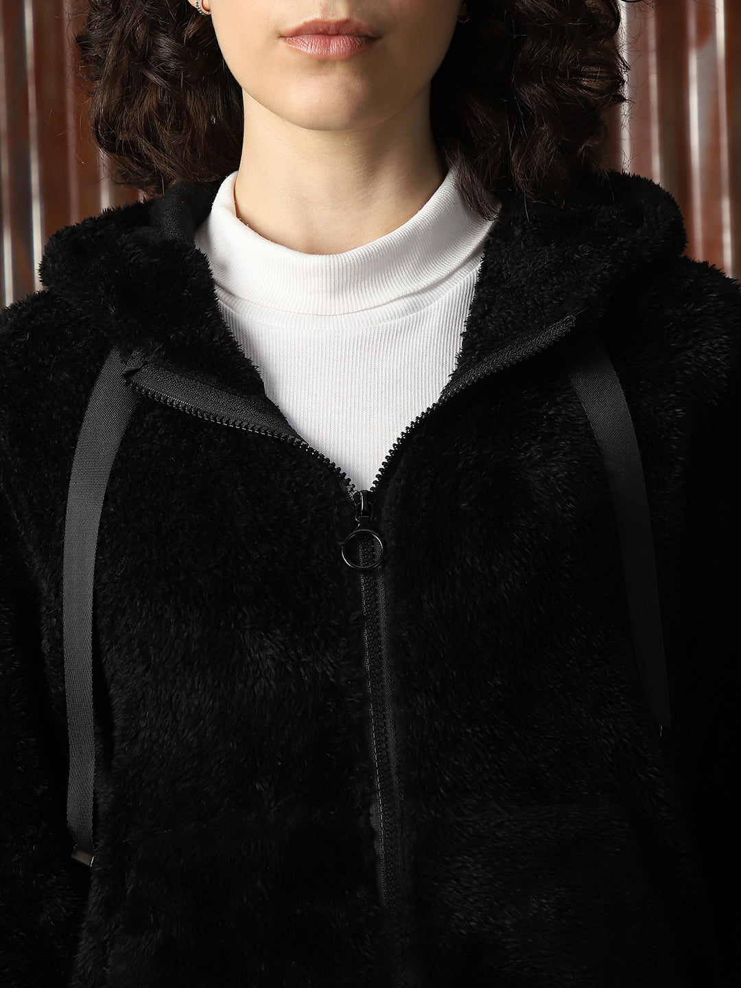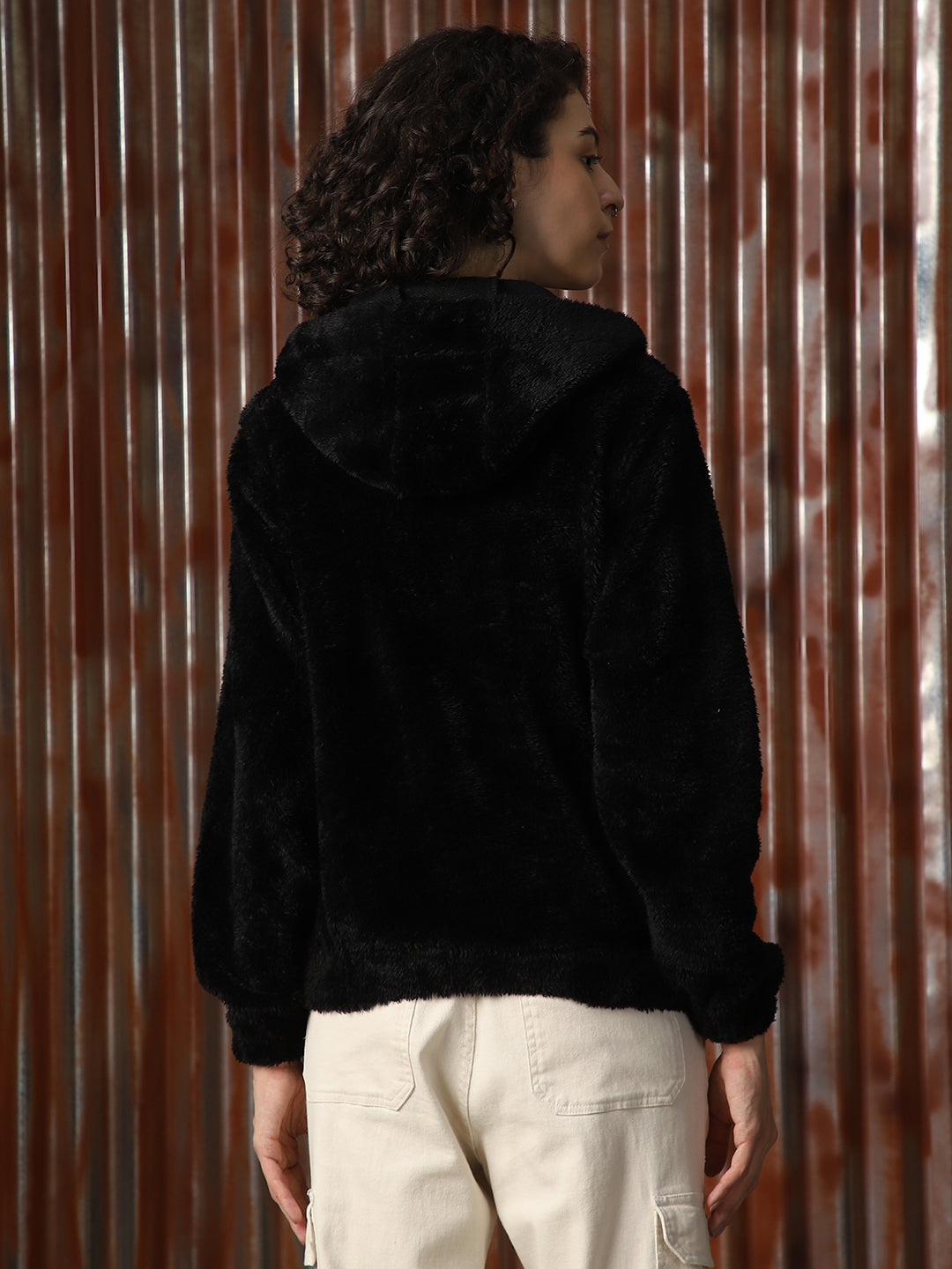 Women Fur Hooded Boxy Fit Tailored Front Open Jacket