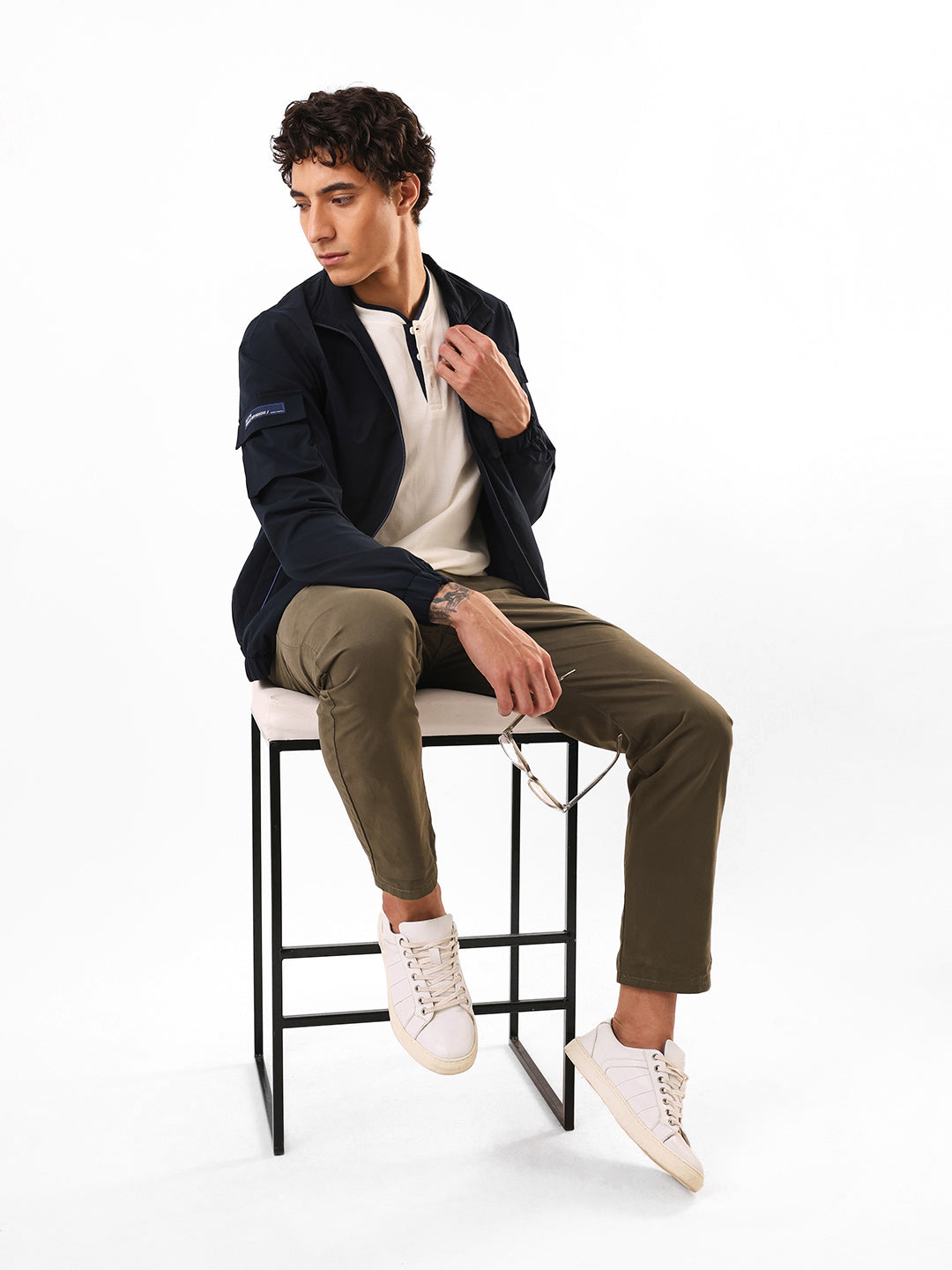 Men's Navy Solid Mock Collar Full Sleeves Lightweight Open-Front Jacket