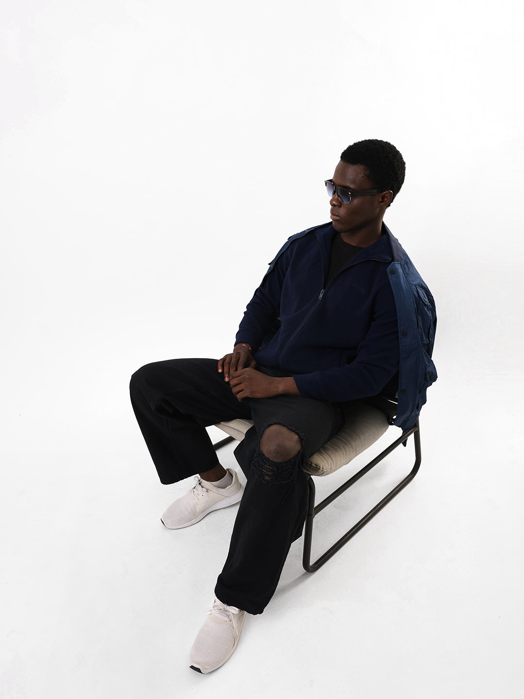 Men's Navy Solid Mock Collar Full Sleeves Open Front Jacket