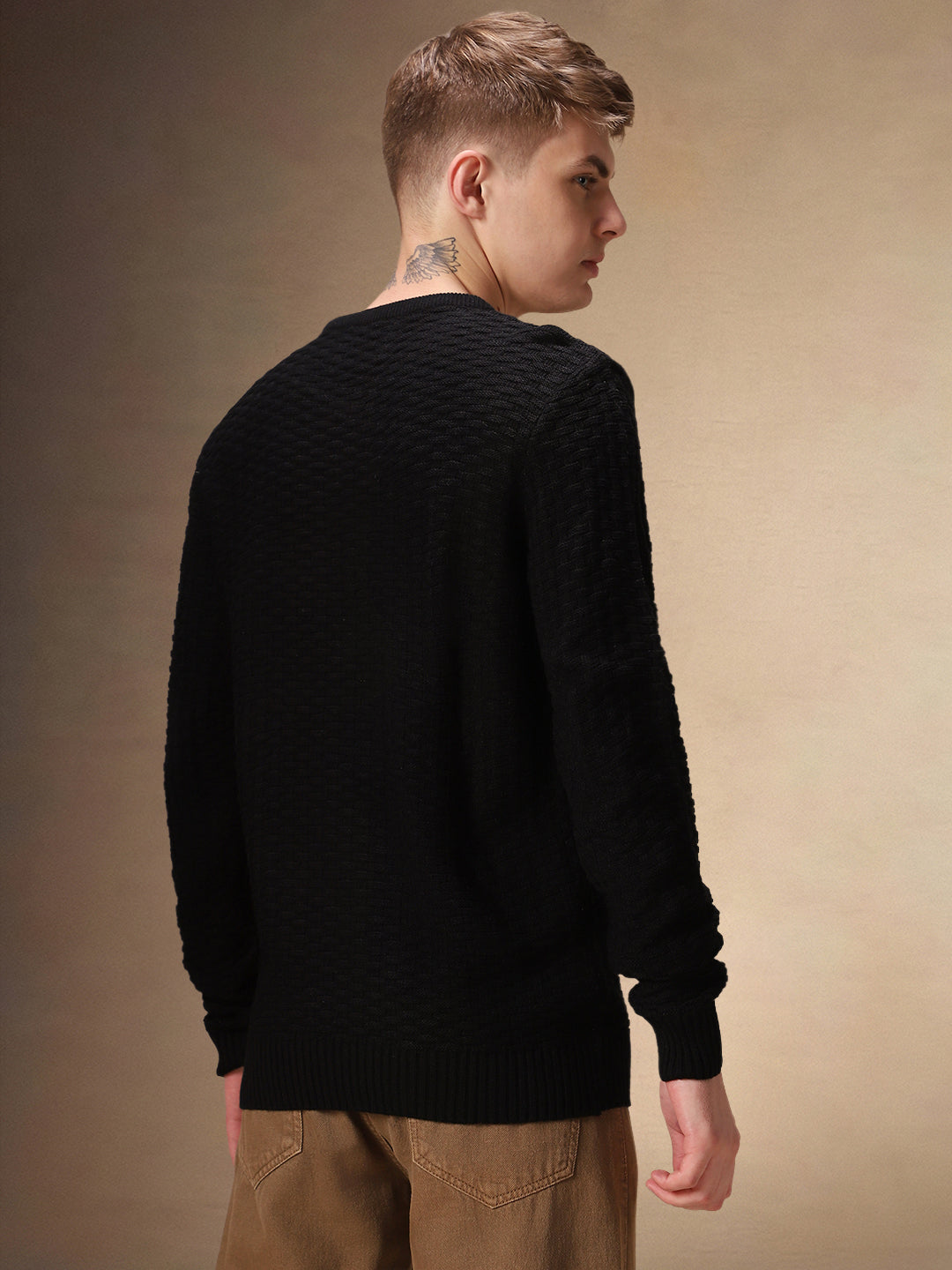 Men's Black Self Design Round Neck Full Sleeves Pullover Sweater