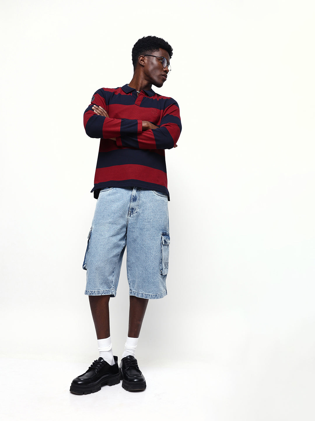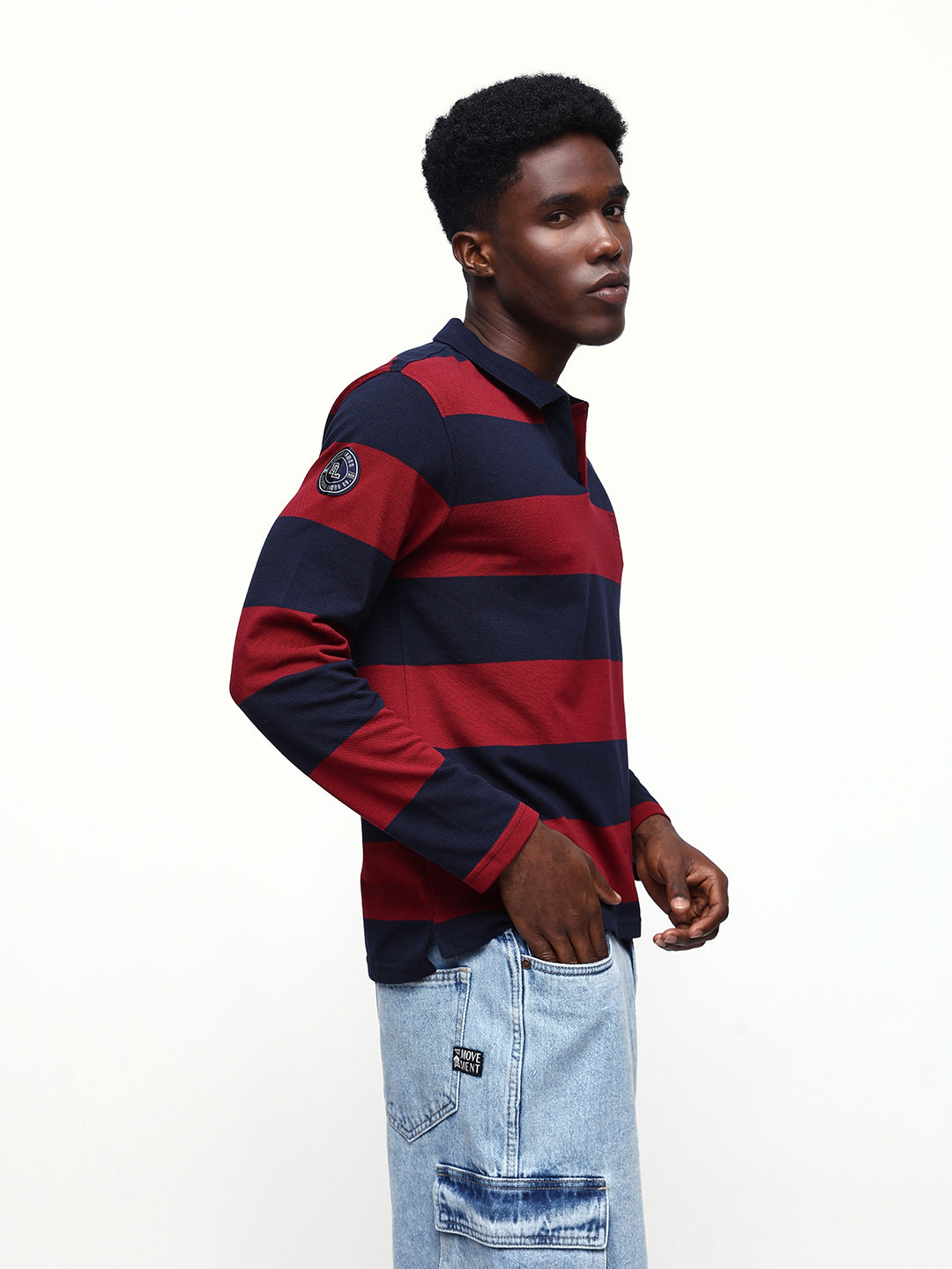 Men's Striped Polo Neck Full Sleeves Relaxed Fit T-shirt